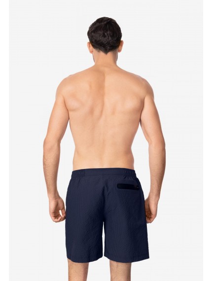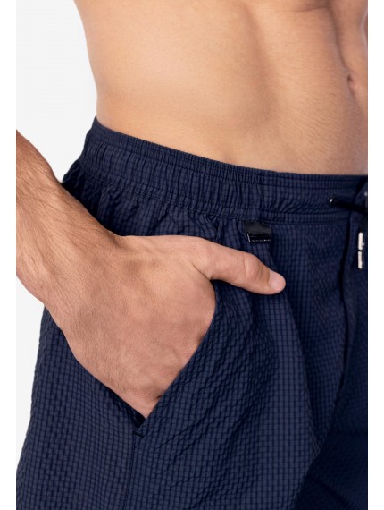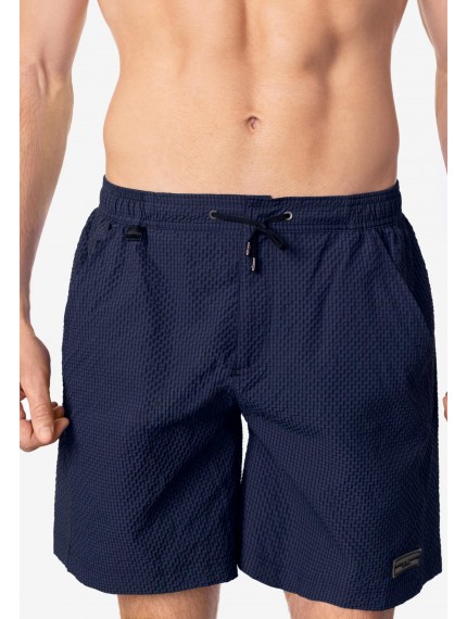 Мужские шорты свободного кроя. Выполнены из фактурной быстросохнущей ткани. Длина до середины бедра, на задней детали карман на молнии. Боковые карманы, потайной карман на молнии внутри правого кармана. Пояс на резинке и шнуровке, ширинка застегивается на молнию. Внутри вставка из мягкой сетки.