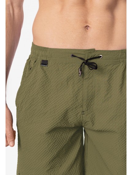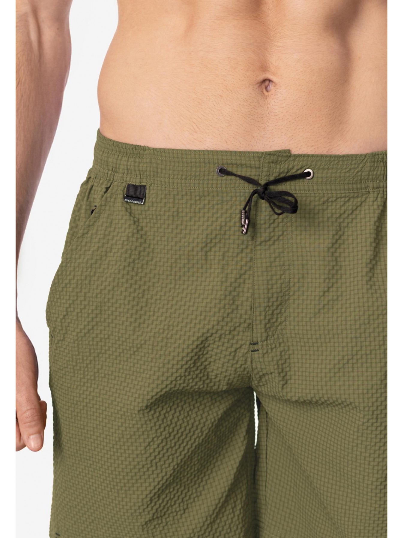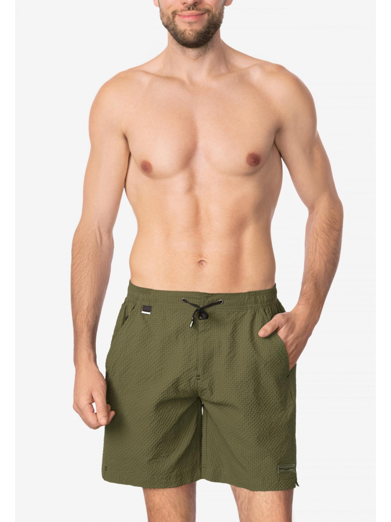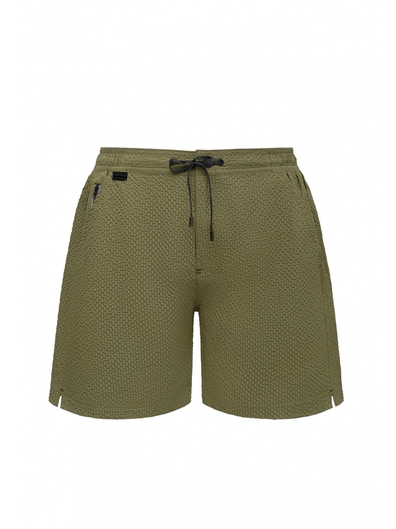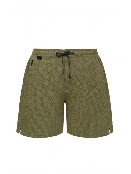 Мужские шорты свободного кроя. Выполнены из фактурной быстросохнущей ткани. Длина до середины бедра, на задней детали карман на молнии. Боковые карманы, потайной карман на молнии внутри правого кармана. Пояс на резинке и шнуровке, ширинка застегивается на молнию. Внутри вставка из мягкой сетки.