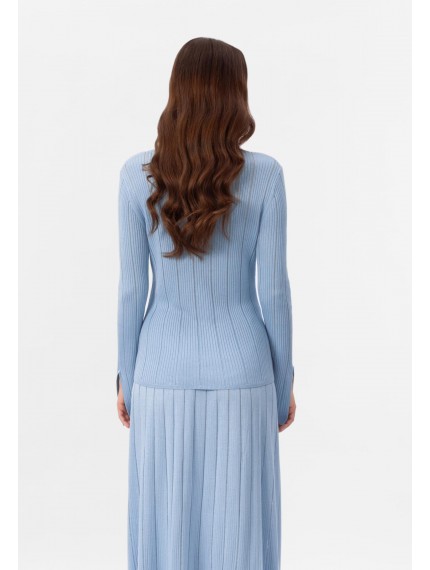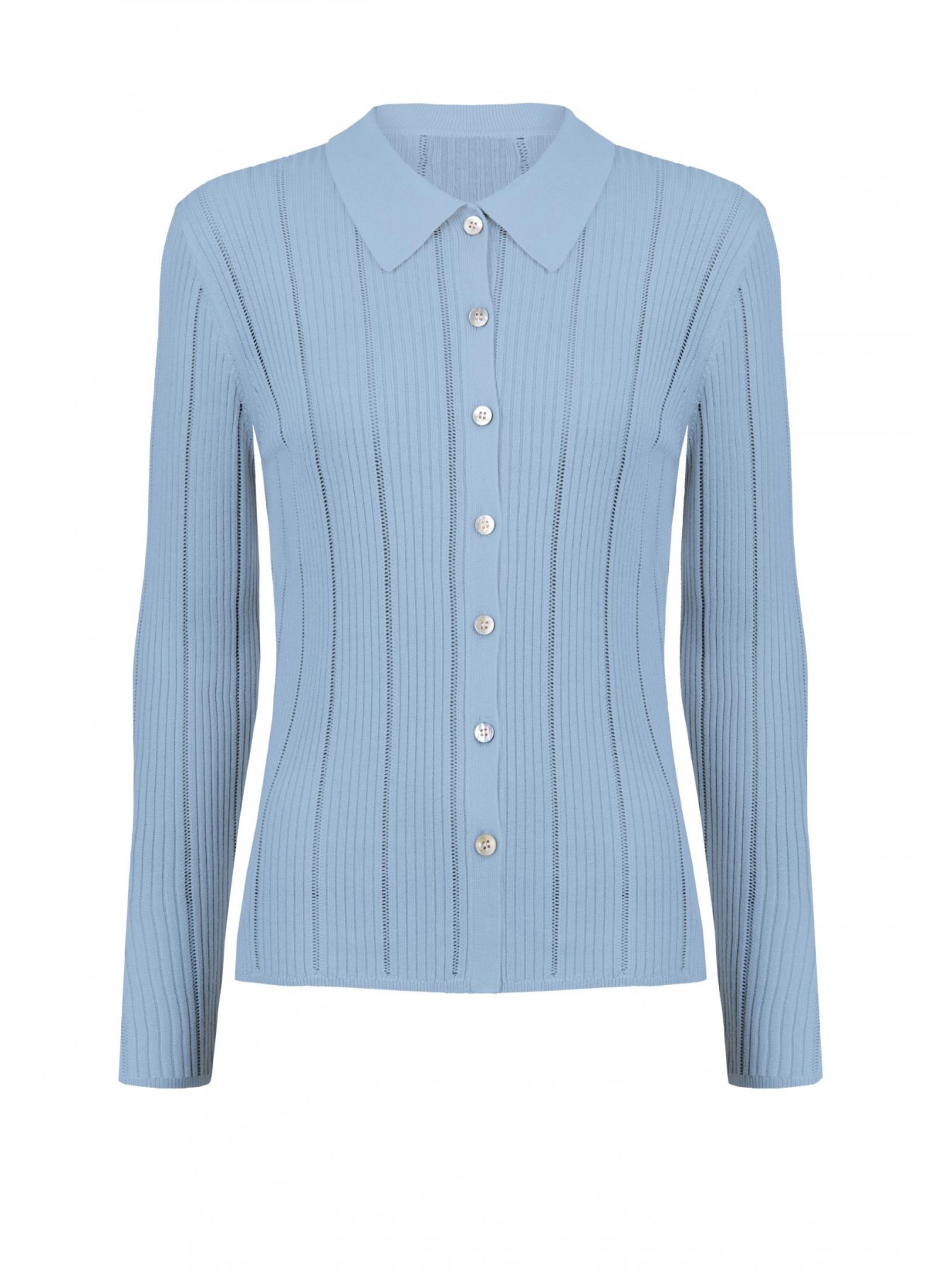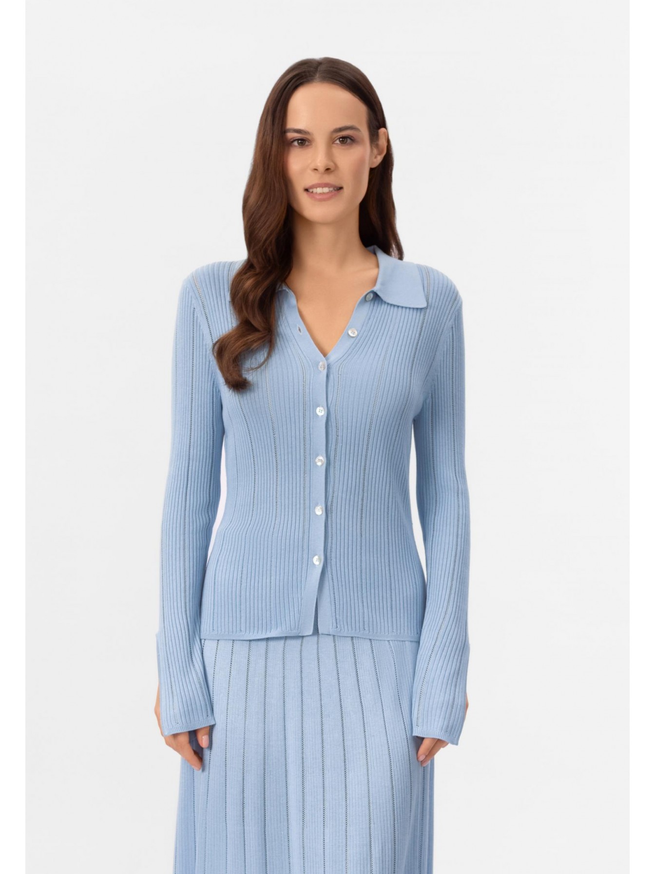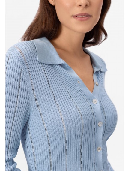 Лёгкий кардиган с длинными рукавами на пуговицах из шелка и вискозы. Полуприлегающий силуэт. Изделие выполнено из трикотажа в рубчик с элементами «пуантель». Отложной воротник.