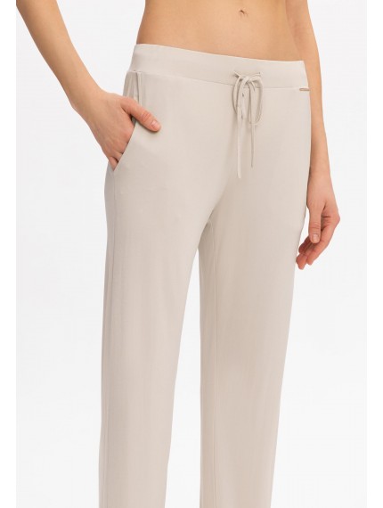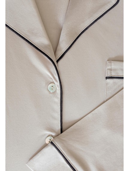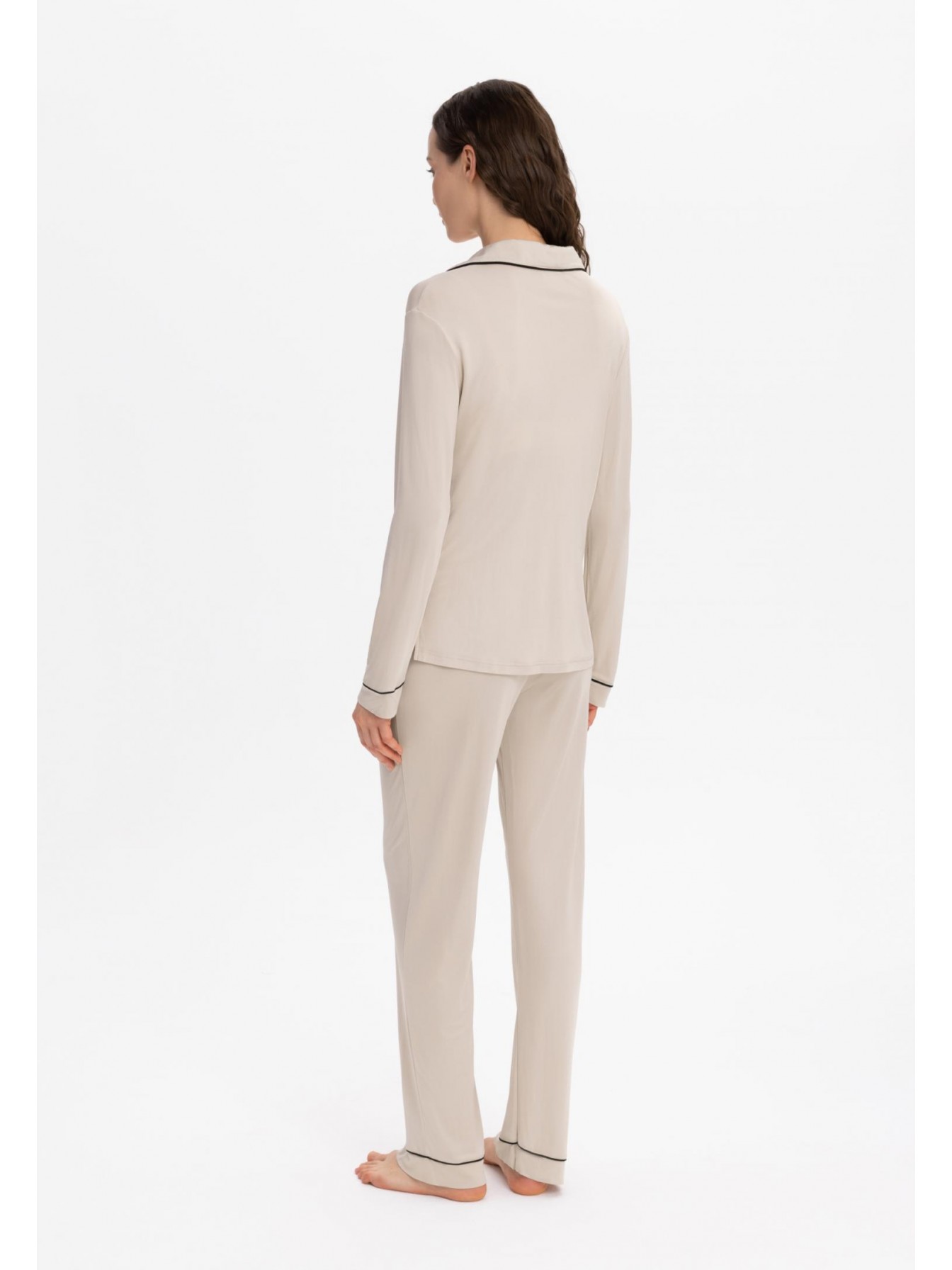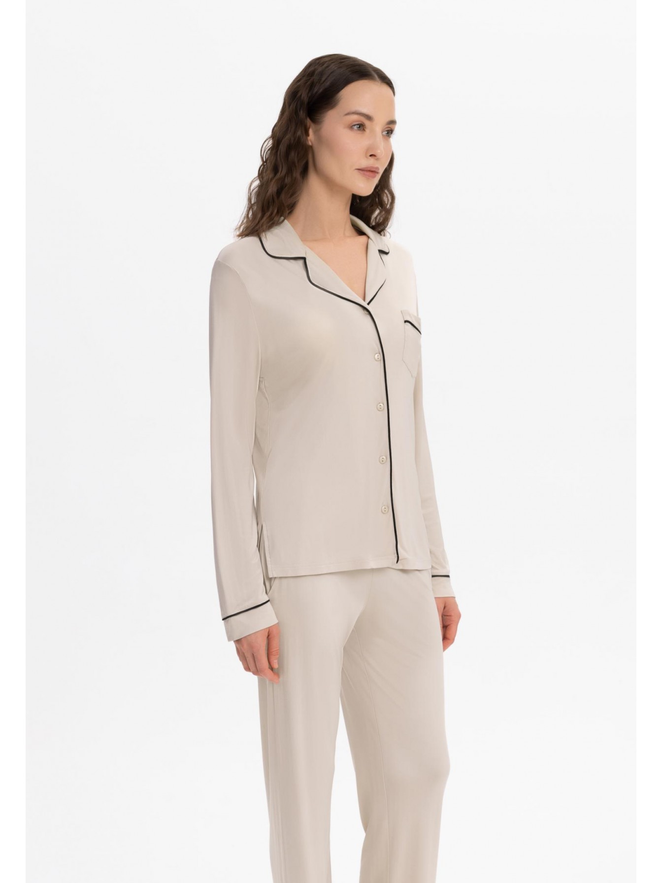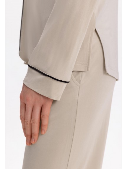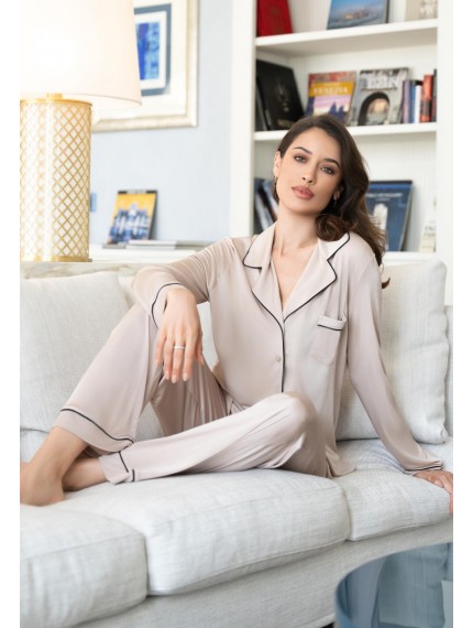 Комплект из шелка и вискозы. Брюки прямого свободного кроя. Боковые карманы. Контраснная отделка. Пояс на резинке. Блуза прямого кроя на пуговицах. Длина до линии бедра. Втачной рукав, английский воротник.