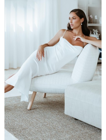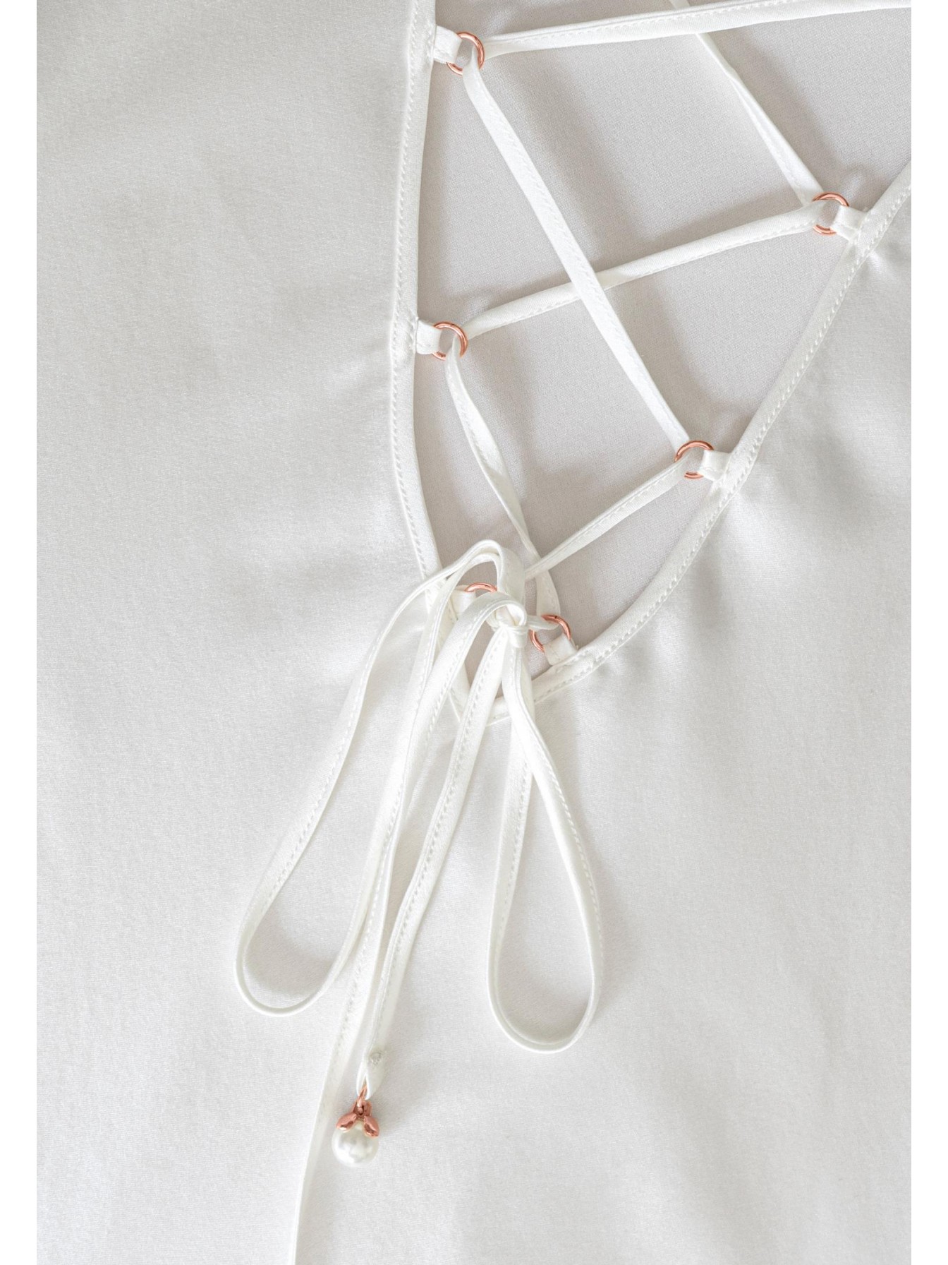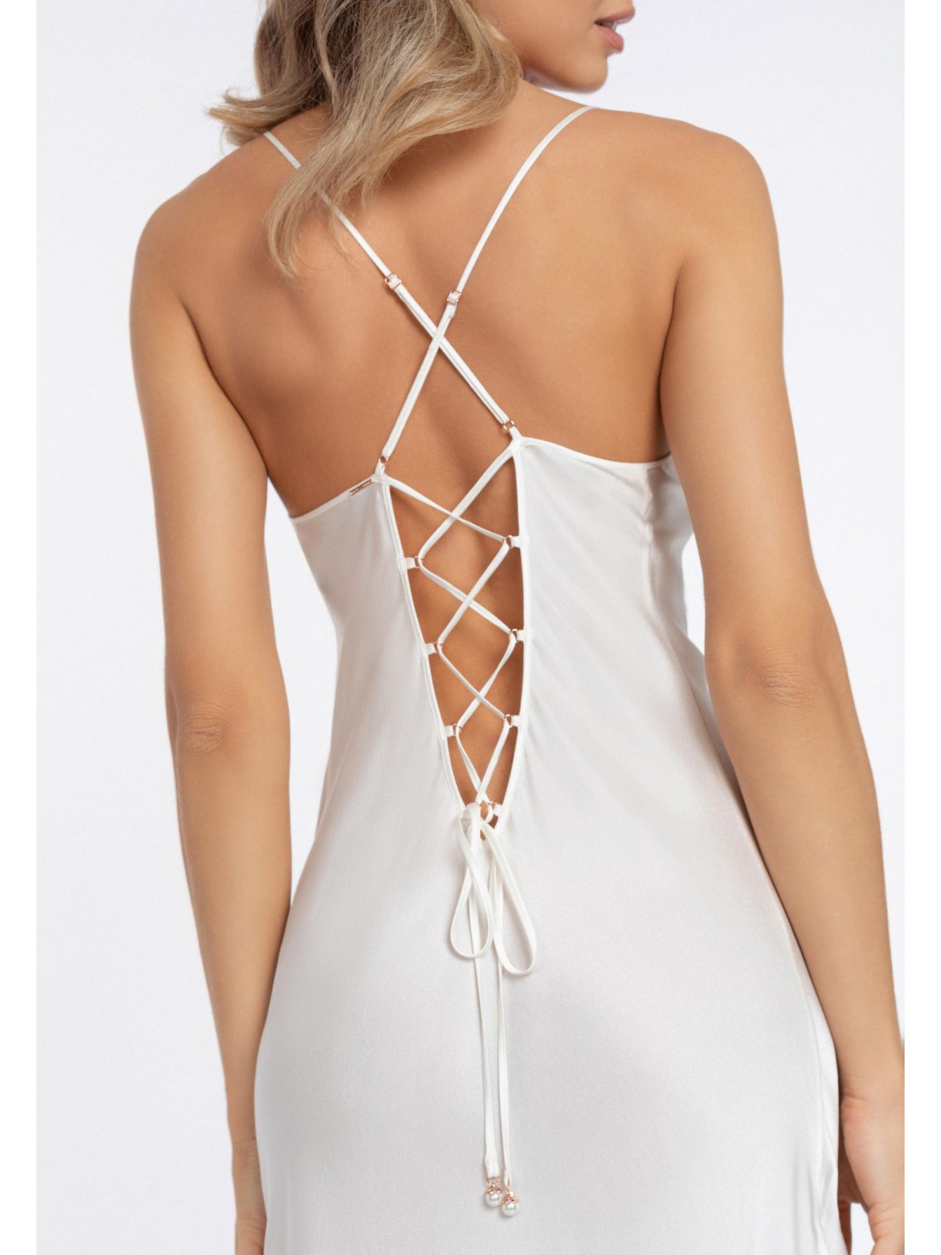 Шелковая ночная сорочка полуприлегающего силуэта на тонких бретелях. Длина чуть ниже уровня колен. На спине глубокий вырез со шнуровкой.