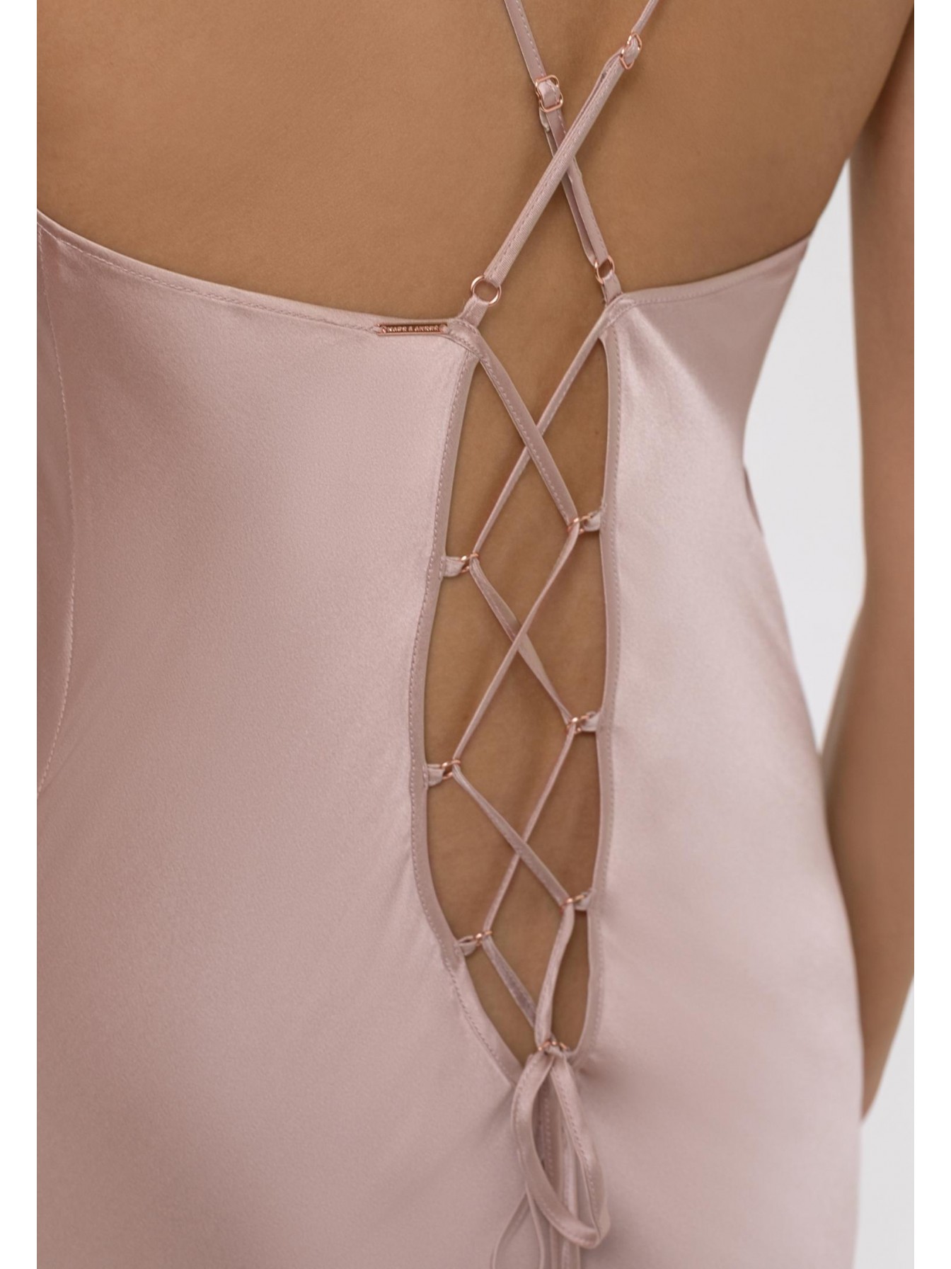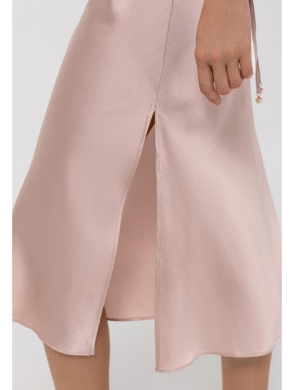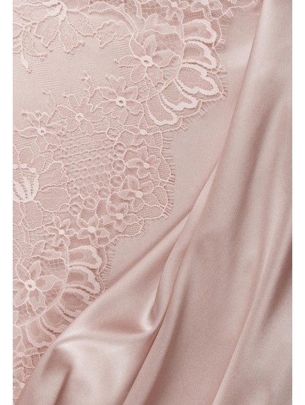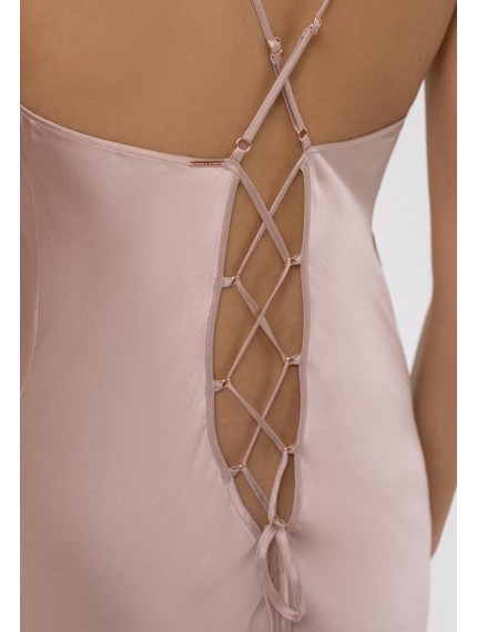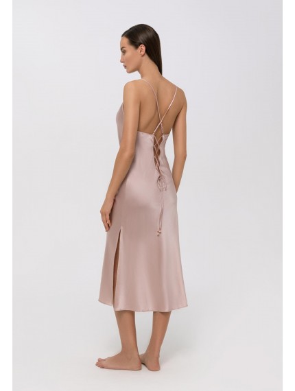 Шелковая ночная сорочка полуприлегающего силуэта на тонких бретелях. Длина ниже уровня колен. На спине глубокий вырез со шнуровкой.