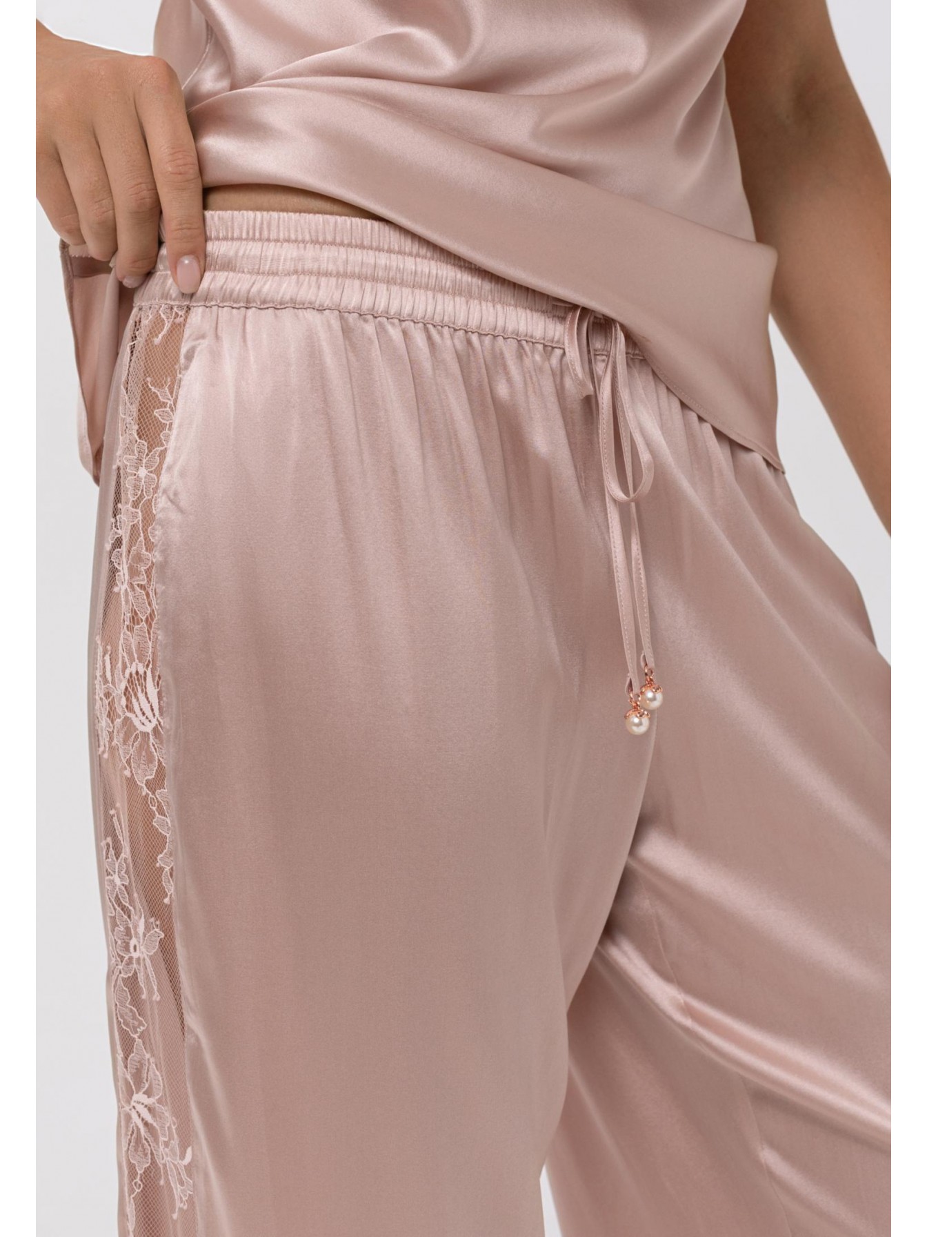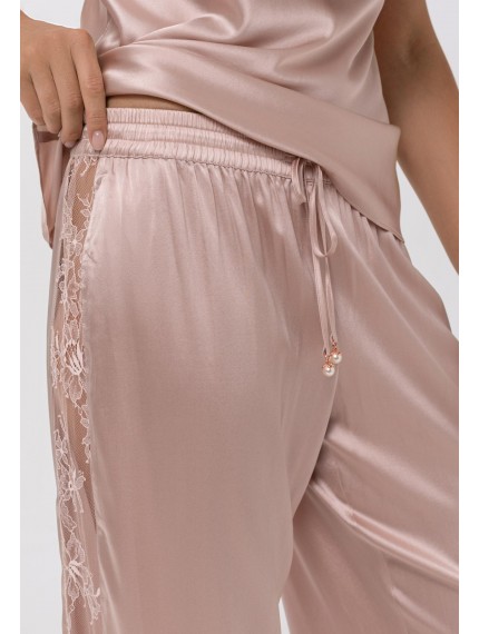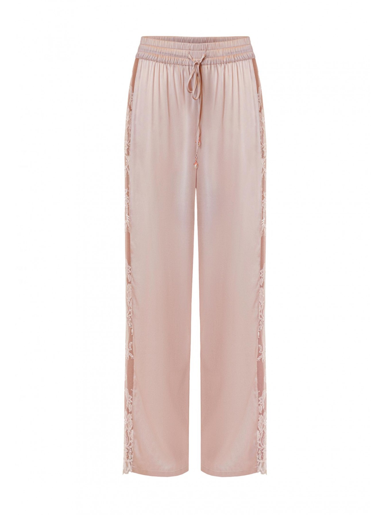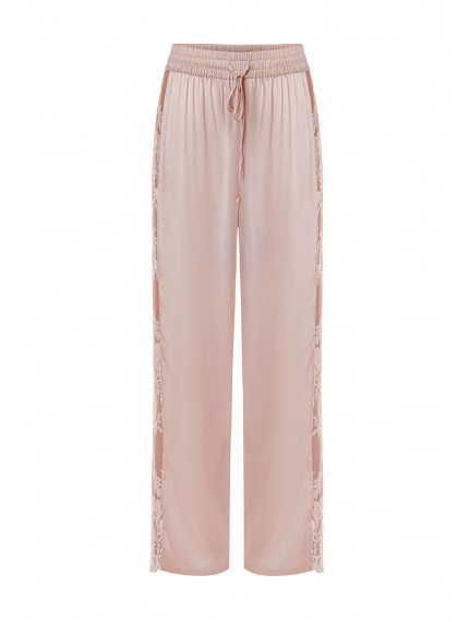 Брюки из шелка прямого свободного кроя. Пояс на резинке с кулиской. По бокам – кружевные вставки.