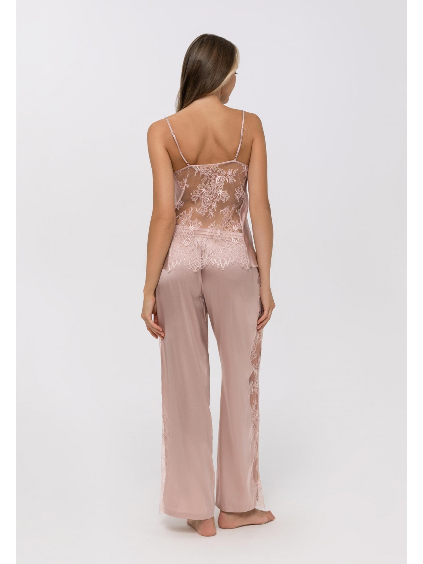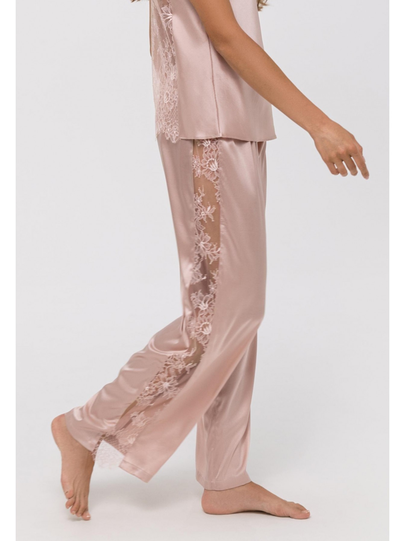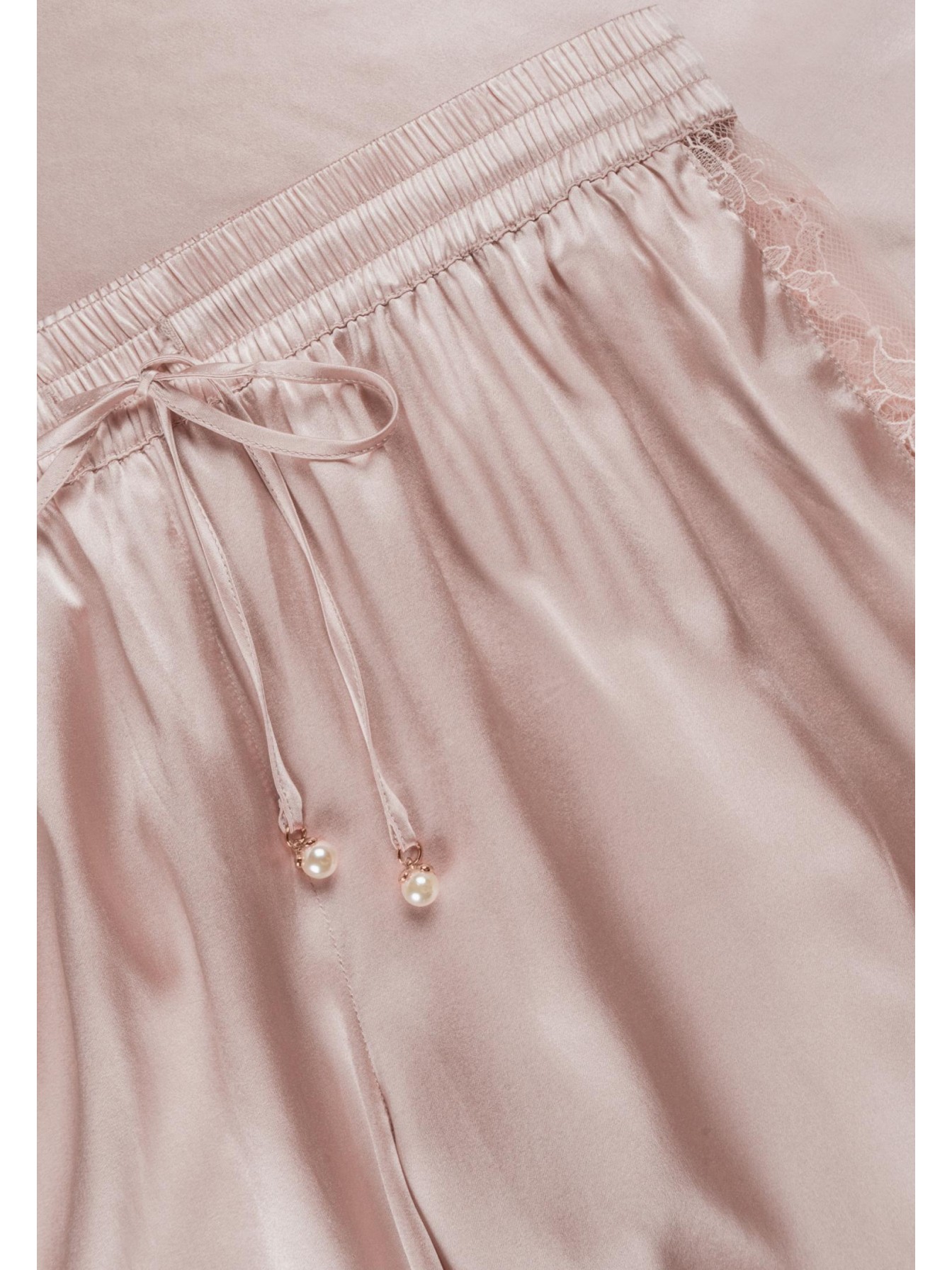 Брюки из шелка прямого свободного кроя. Пояс на резинке с кулиской. По бокам – кружевные вставки.