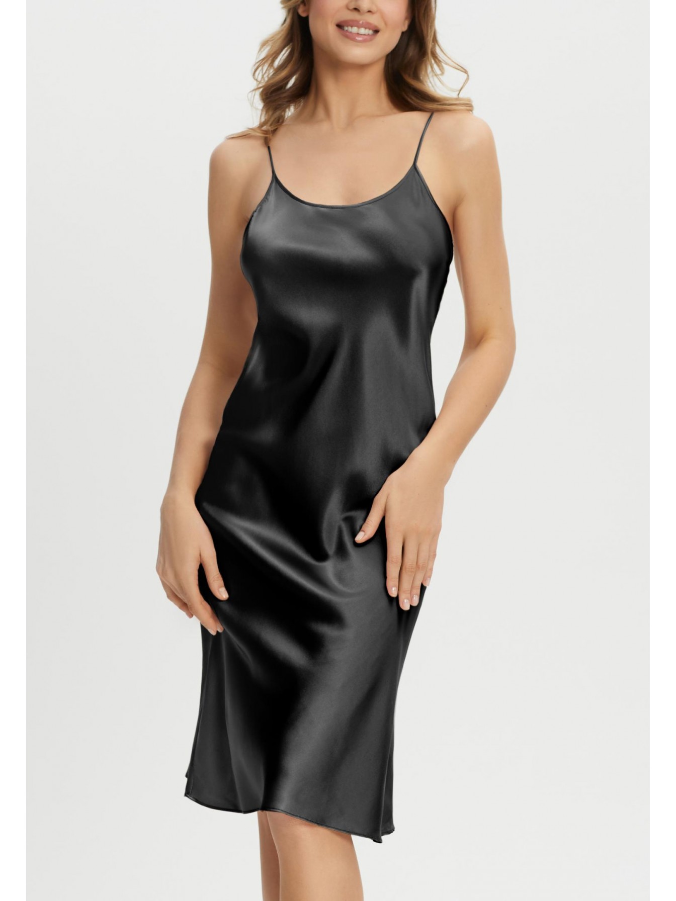Ночная сорочка полуприлегающего силуэта на тонких регулируемых бретелях. Длина чуть ниже уровня колен.