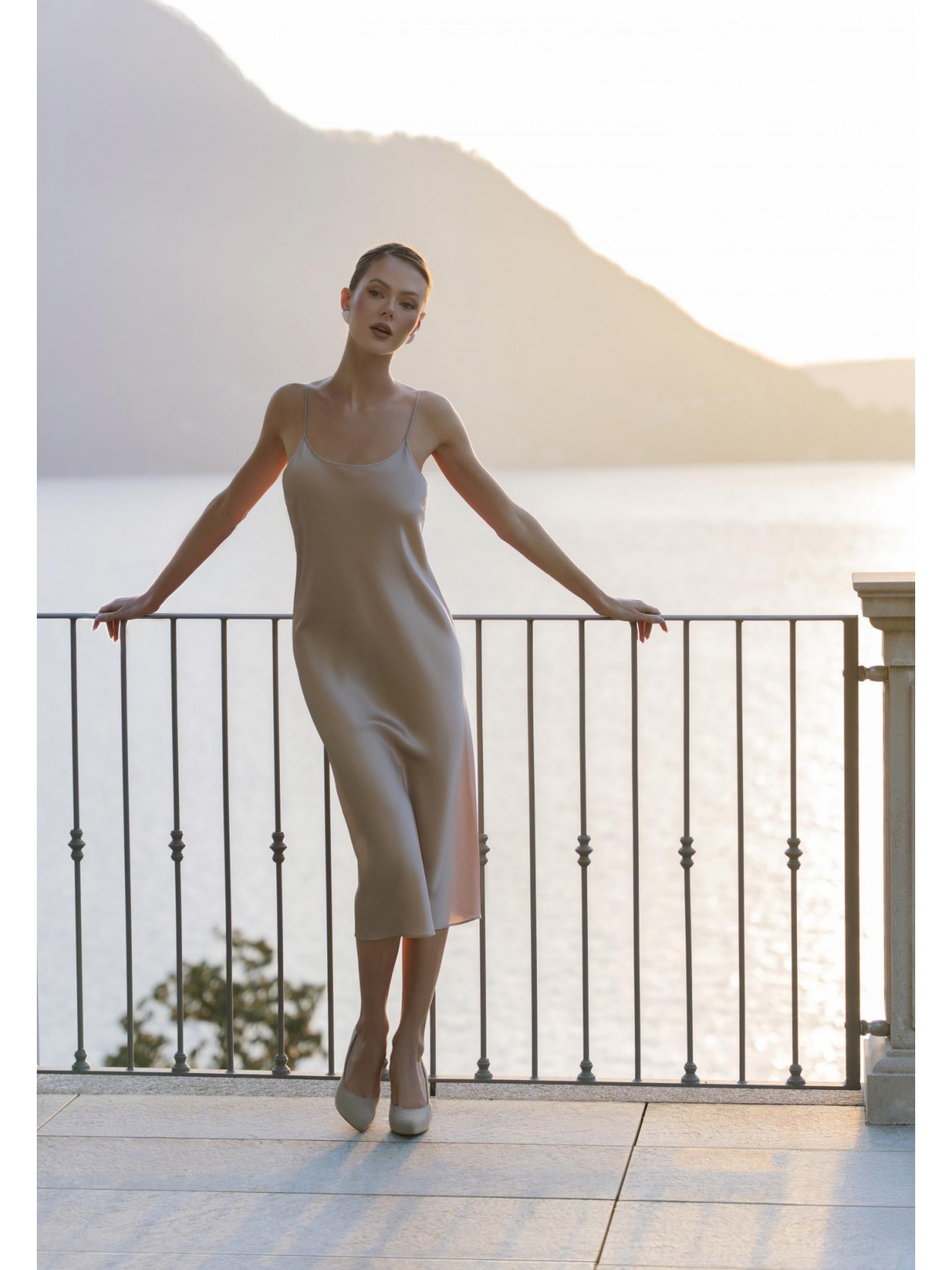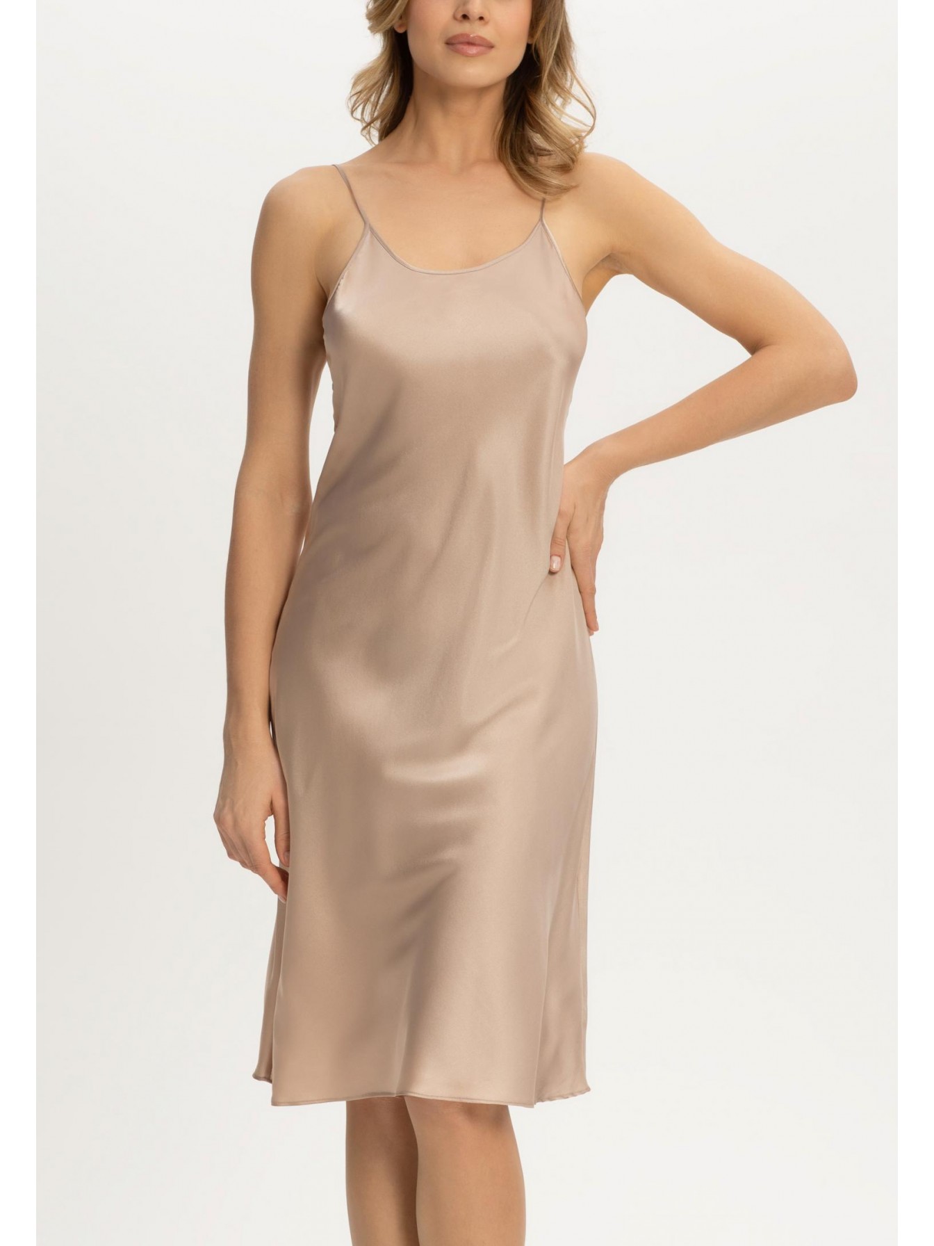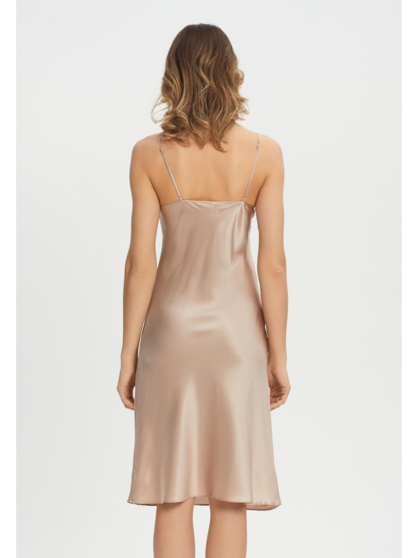 Ночная сорочка полуприлегающего силуэта на тонких регулируемых бретелях. Длина чуть ниже уровня колен.
