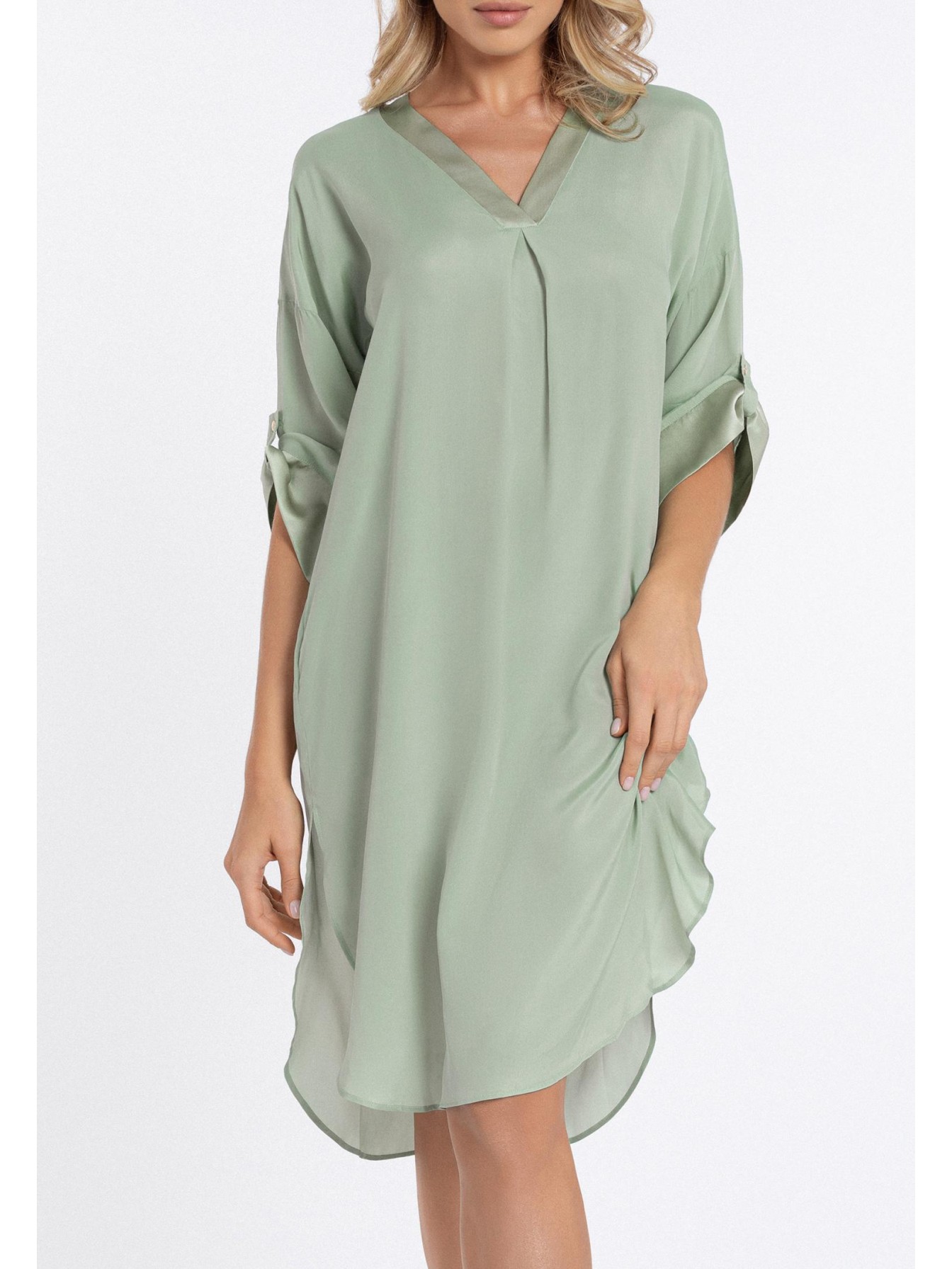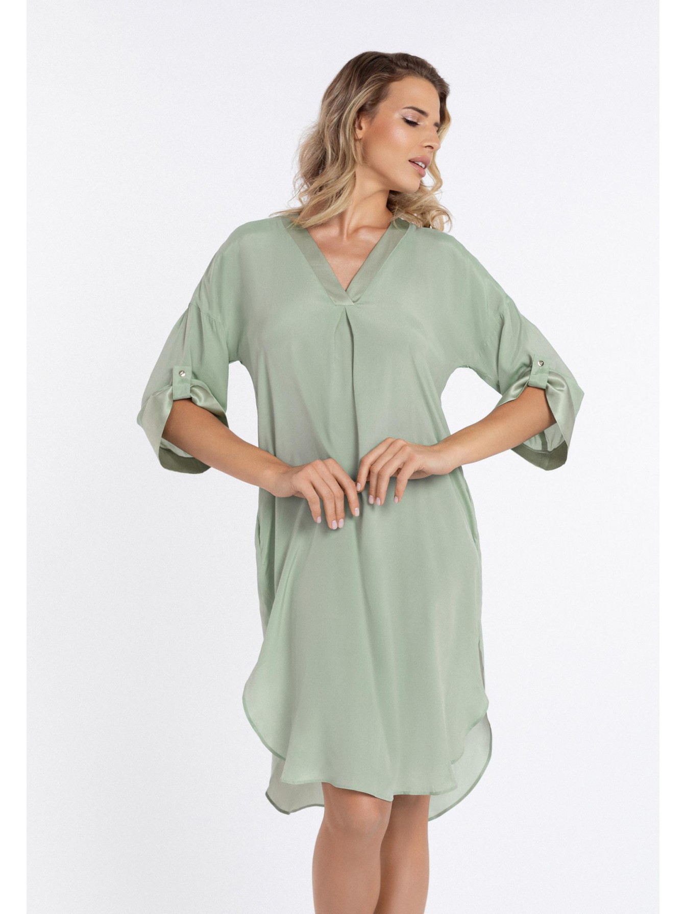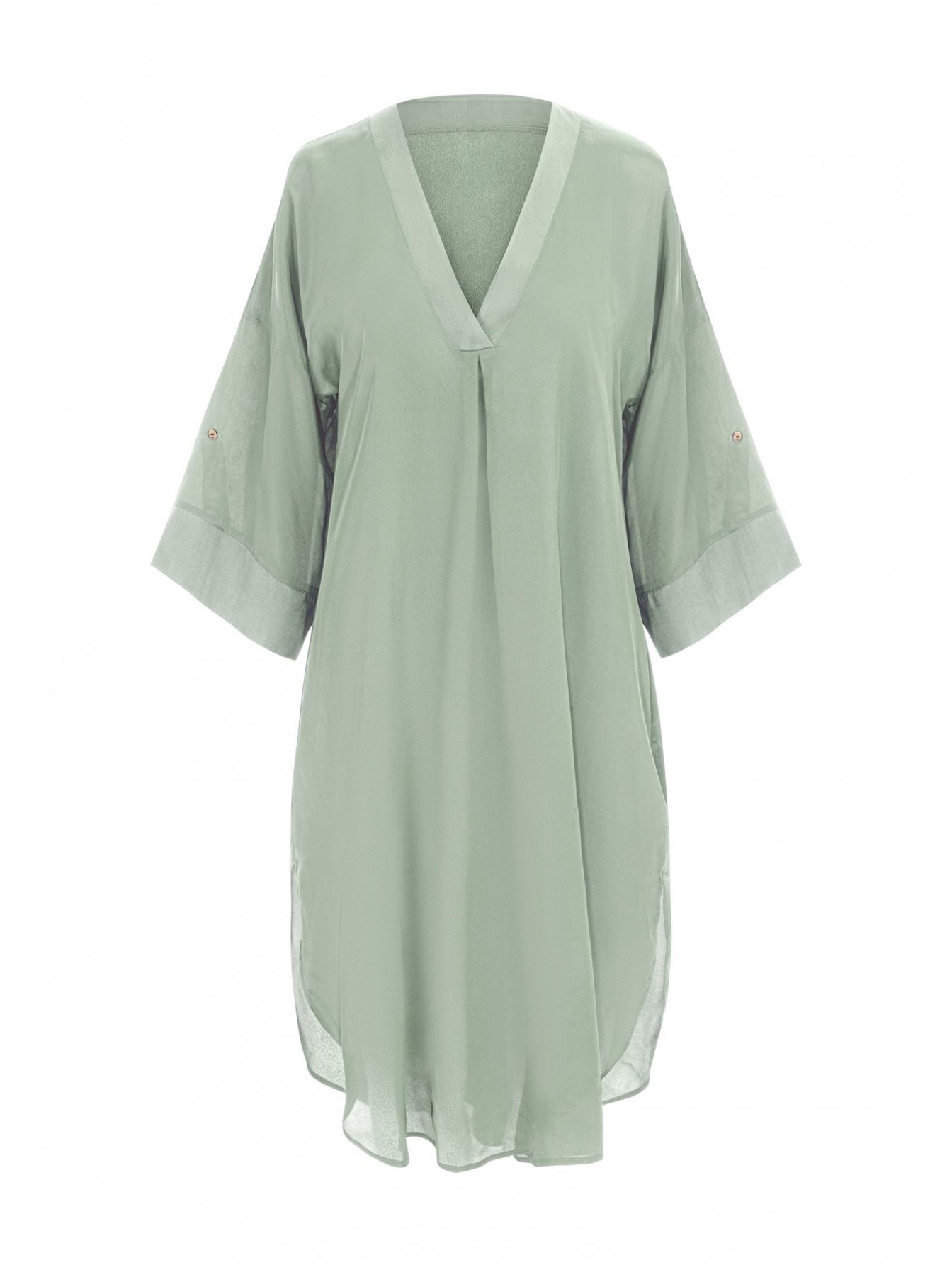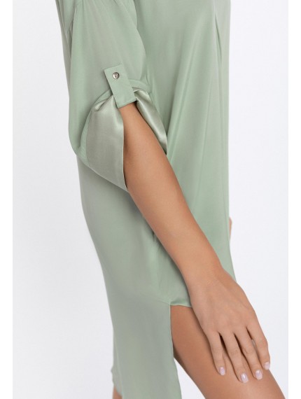 Легкая туника свободного прямого кроя. Длина до уровня колен. V-образный вырез по линии декольте. Длина рукава регулируется патой с застежкой.