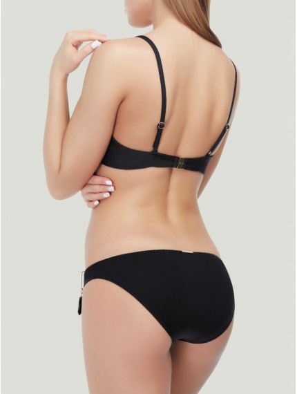 Верх купальника черного цвета с принтом на чашках. Формованная чашка «бандо» на каркасной поддержке со съемными вкладышами «пуш-ап». Оригинальный геометрический крой. На спине застежка, регулируемые бретели фиксируются на спине.