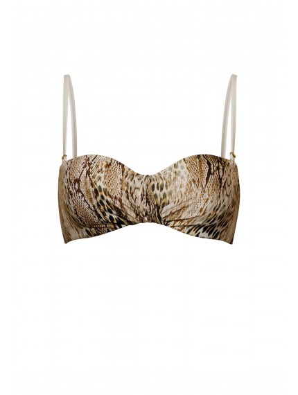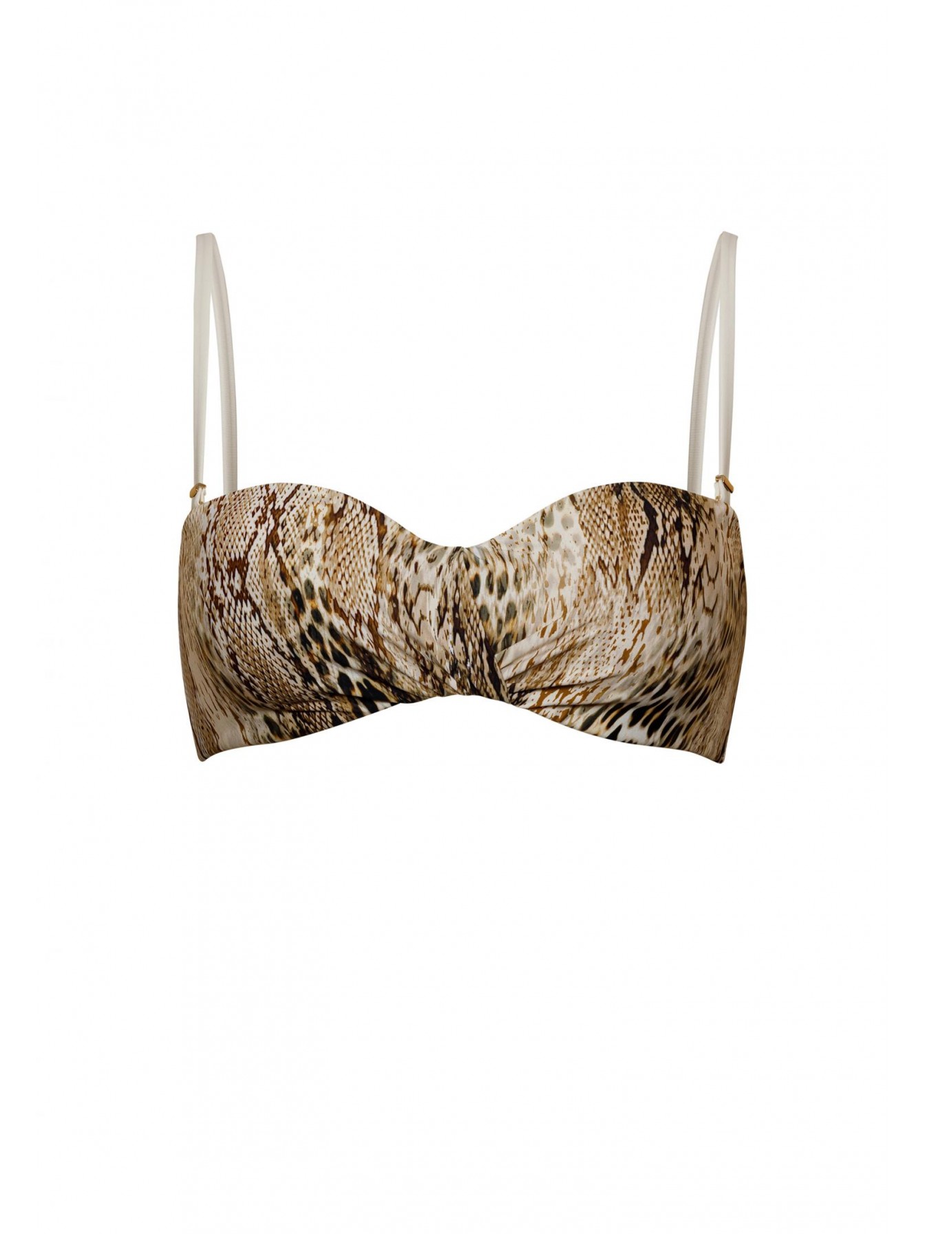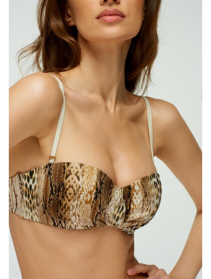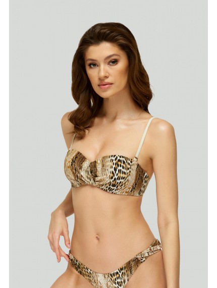 Верх купальника коричневого цвета с принтом. Формованная чашка «бандо» на каркасной поддержке со съемными корректорами «пуш-ап». Съемные бретели. На спине застежка. Спереди декоративный перекрут.