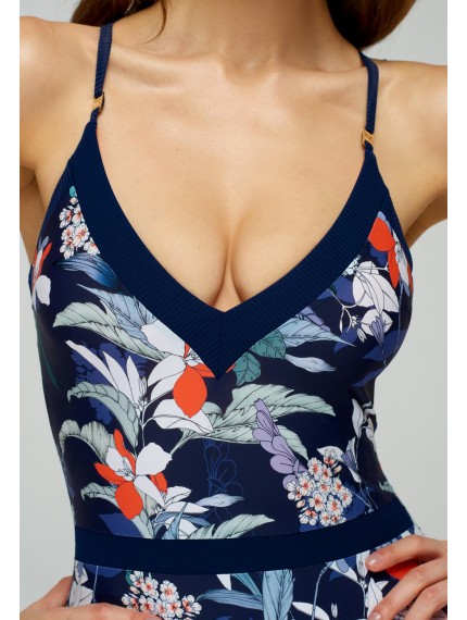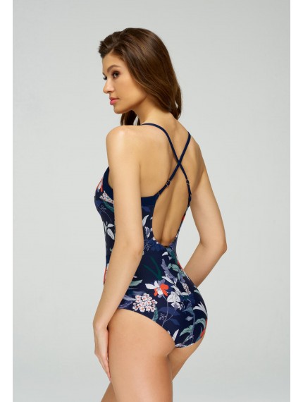 Женский сплошной купальник синего цвета с цветочным принтом. Купальник c тонкими съемными корректорами и поддерживающей резинкой под грудью. V-образный вырез. Бретели регулируются. Открытая спина.