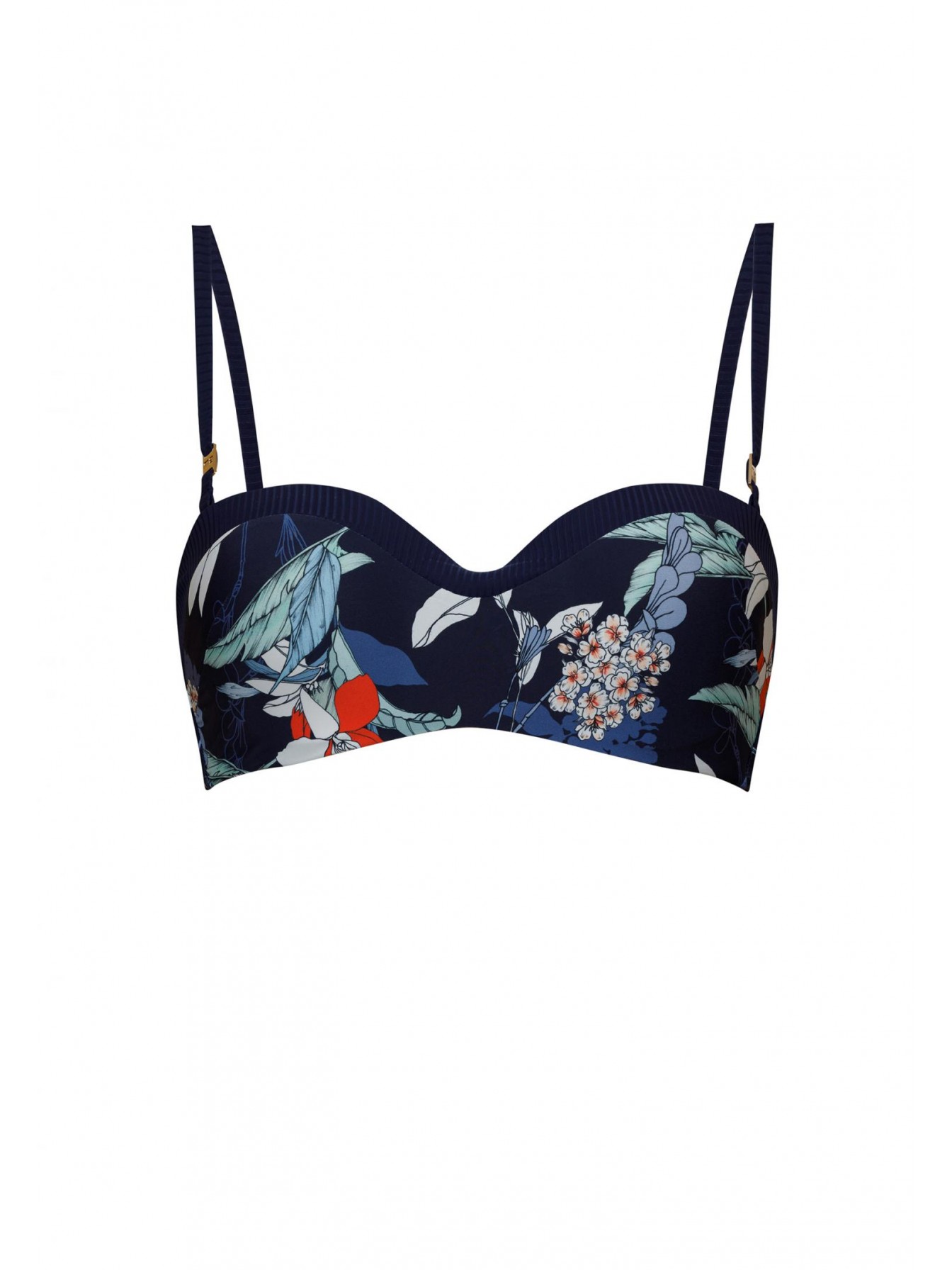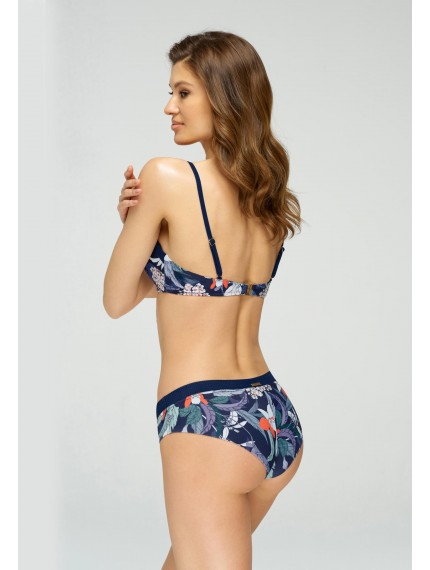 Верх купальника синего цвета с цветочным принтом. Формованная чашка «бандо» на каркасной поддержке. Силиконовая лента внутри по линии декольте для лучшей посадки. Съемные бретели. На спине застежка.