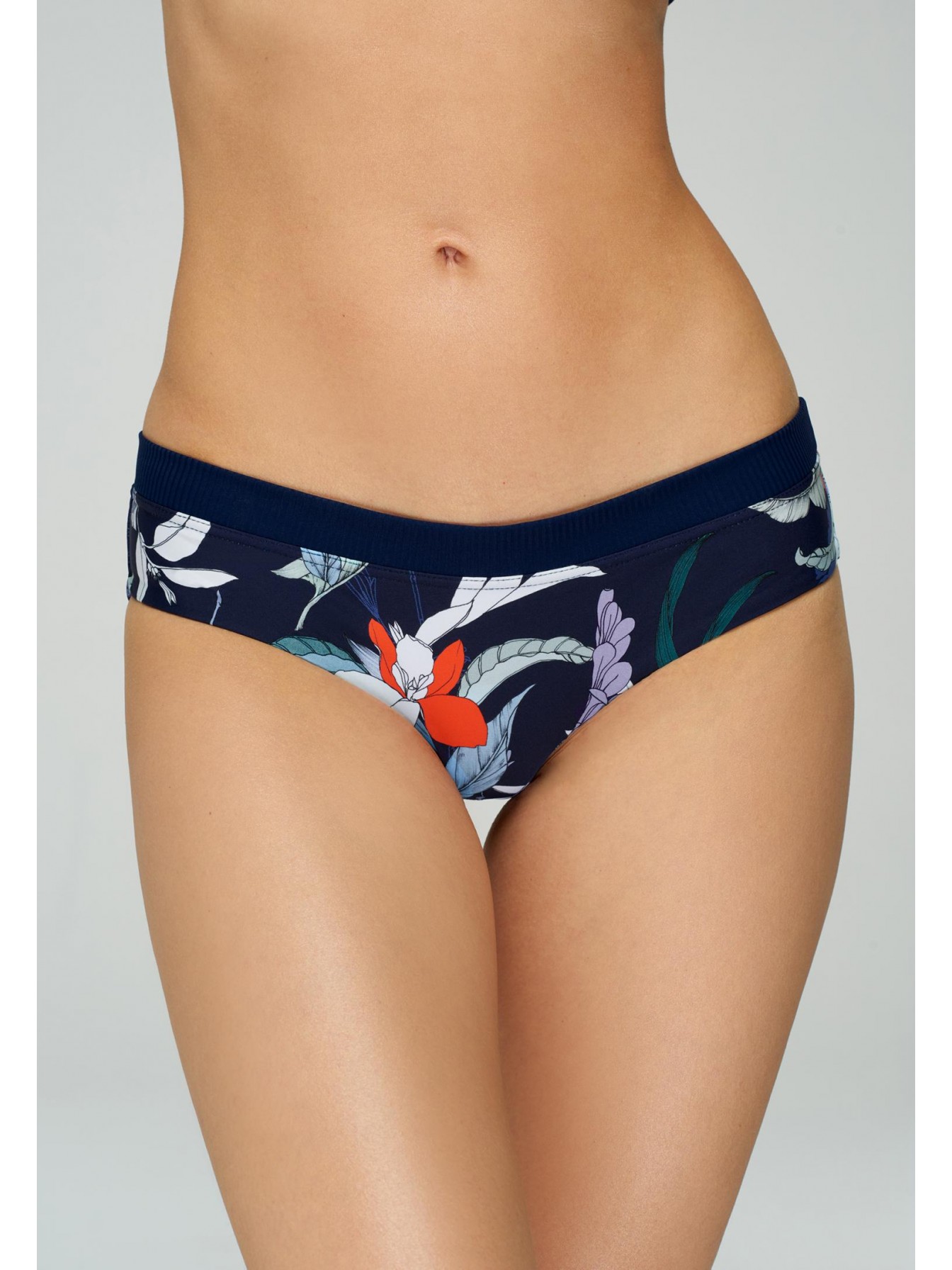Женские купальные плавки синего цвета с цветочным принтом. Брифы-бразилиана с заниженной линией талии и окантовкой в виде контрастного пояса. Вертикальный шов на задней детали.