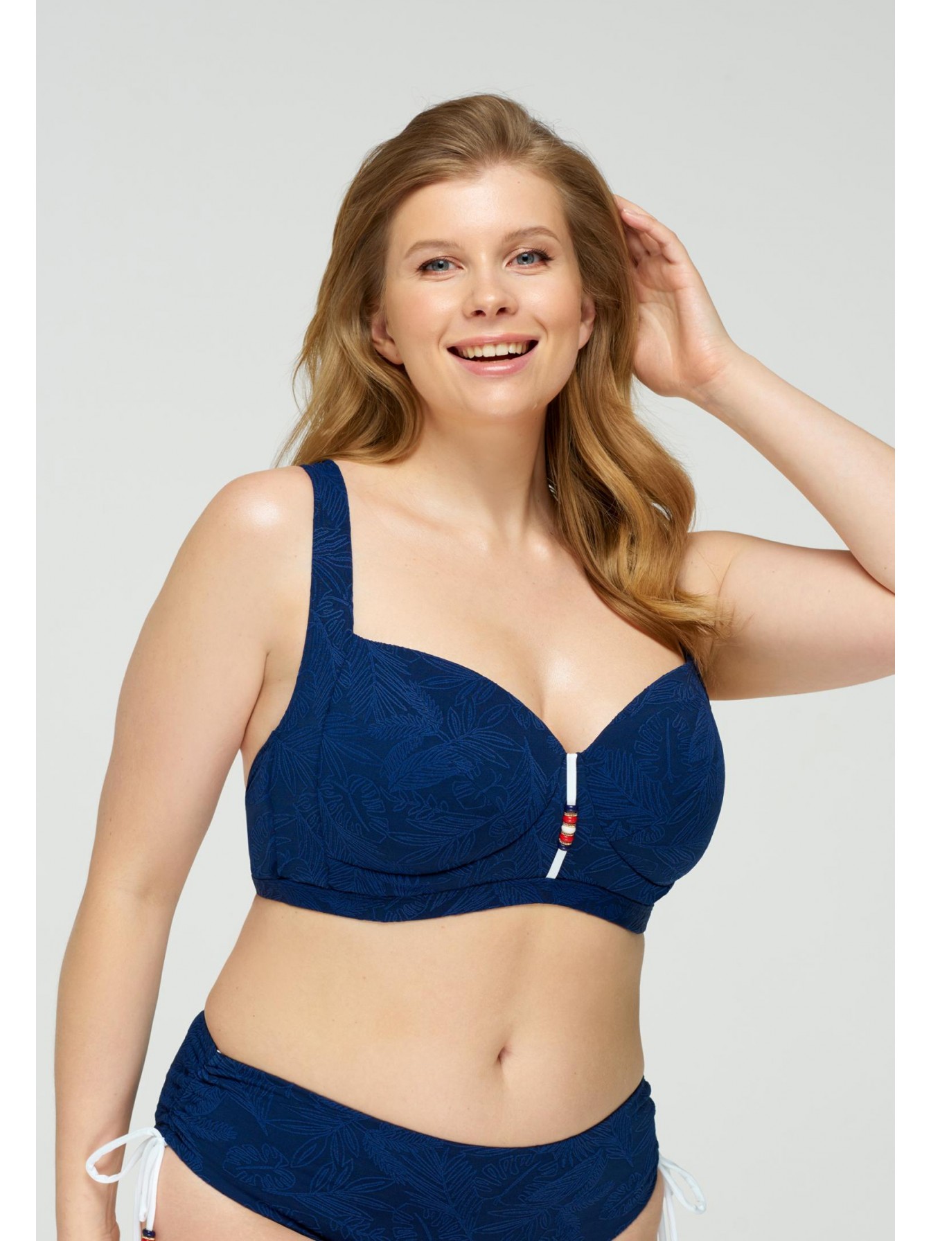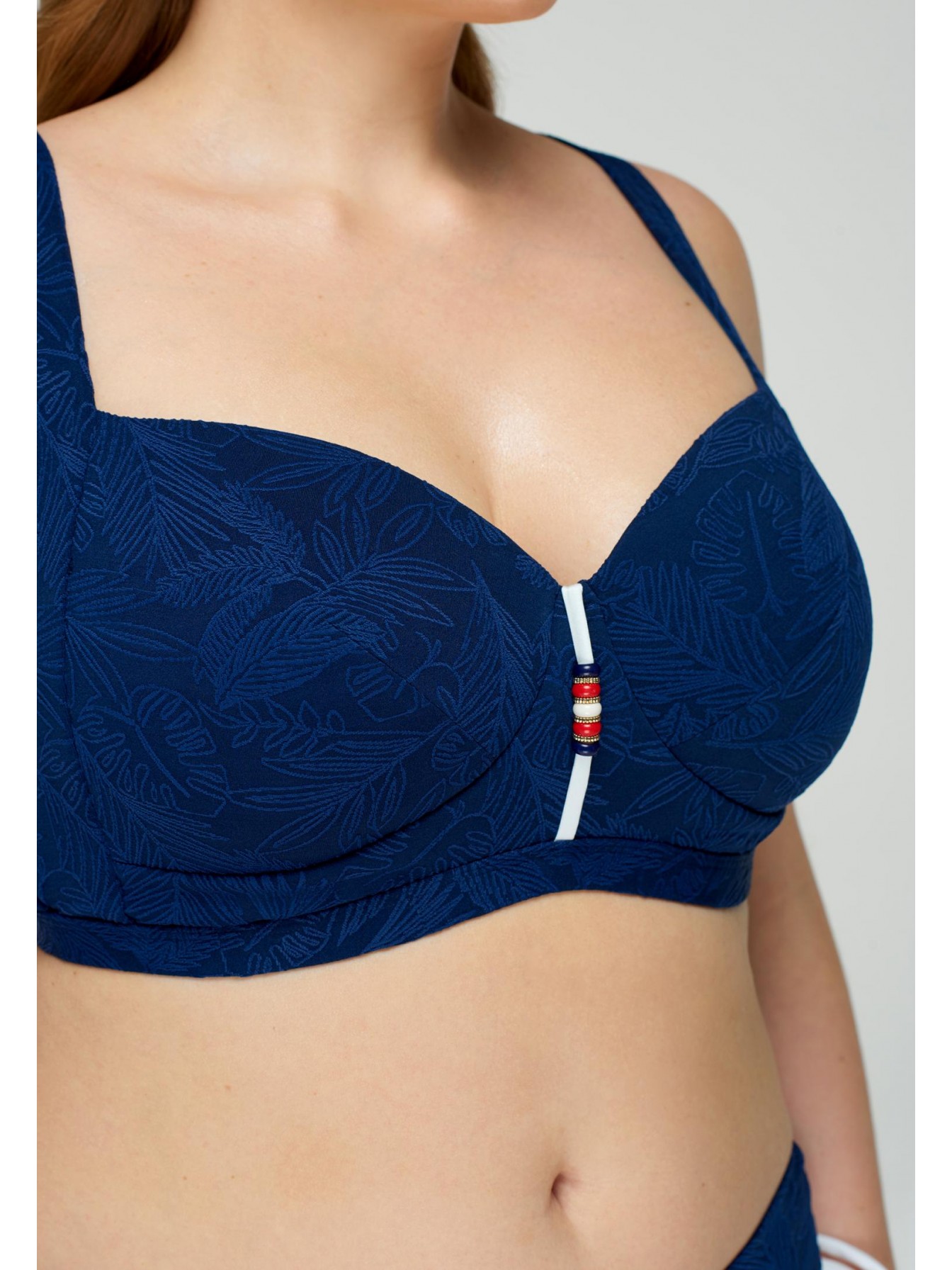 Верх купальника синего цвета с растительным орнаментом и завязками спереди. Формованная чашка со съемными корректорами «пуш-ап». Регулируемые широкие бретели. На спине застежка.