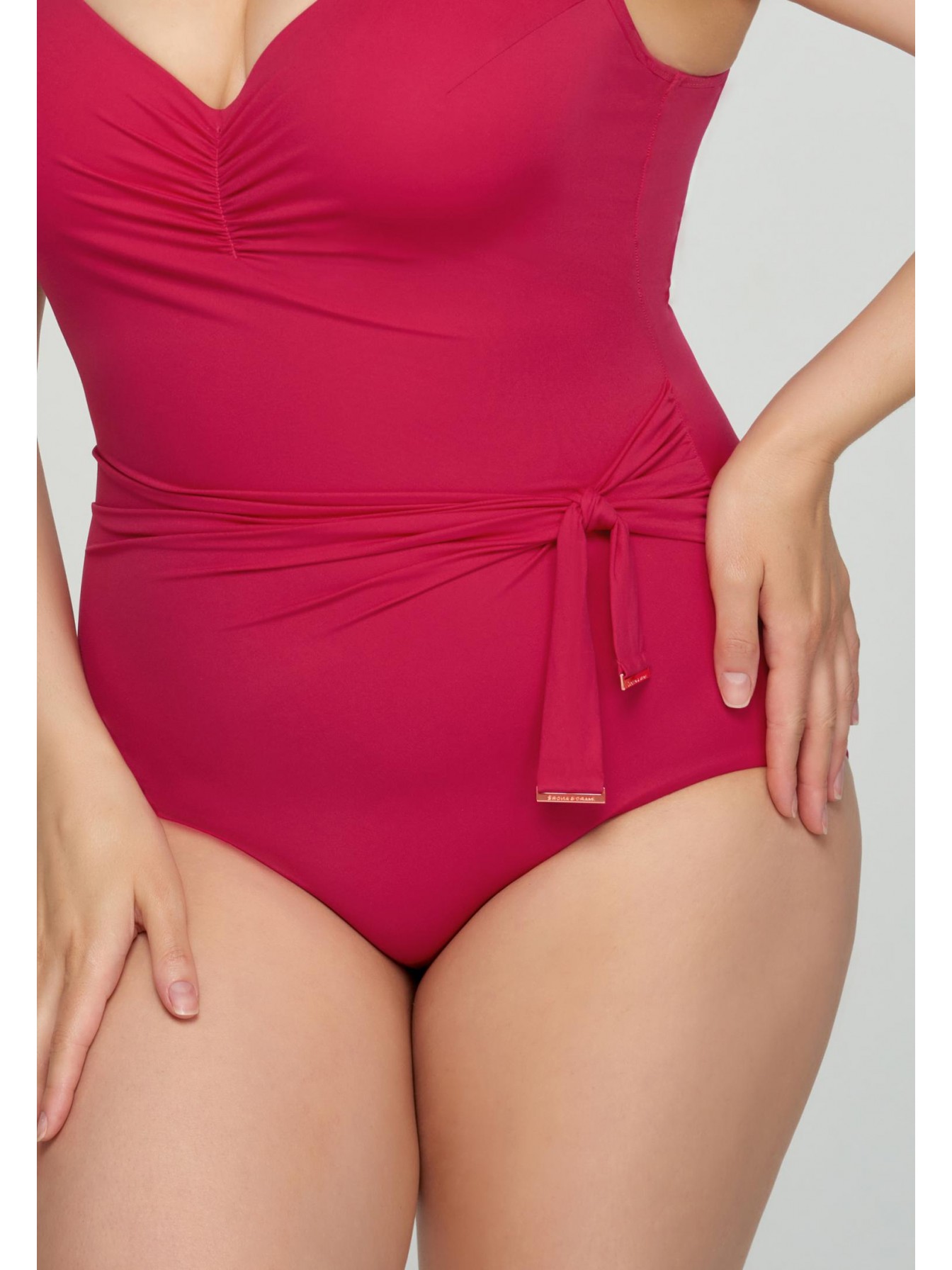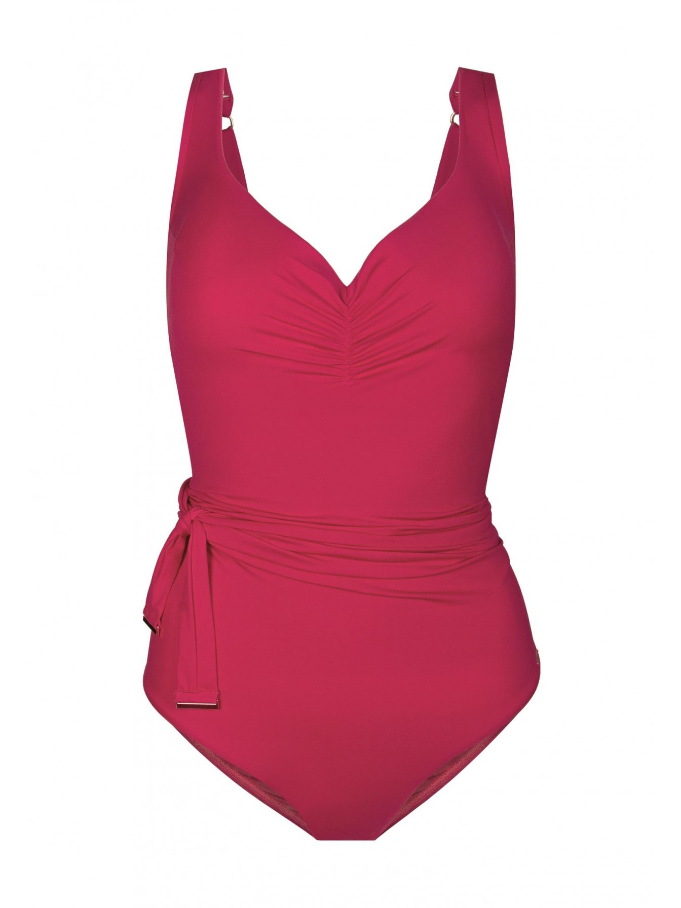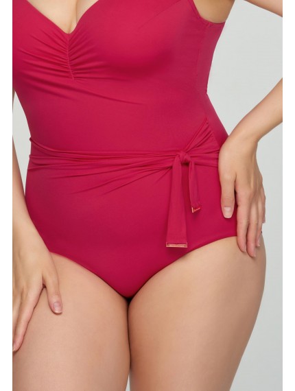 Женский сплошной купальник розового цвета с формованной чашкой на каркасной поддержке. Углубленная линия декольте. Широкие бретели с поролоновой вставкой. Спереди декоративный съемный бантик. Бретели регулируются. Круглая спина.