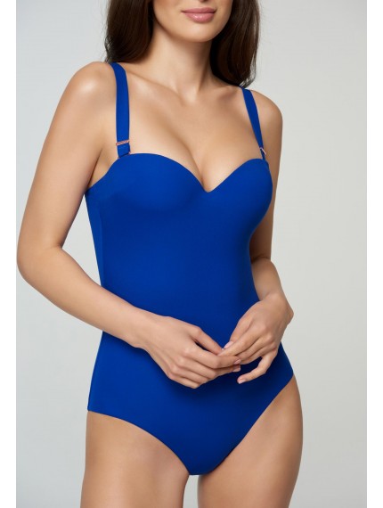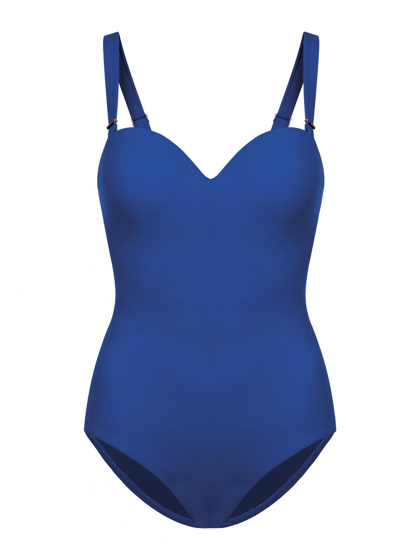 Женский сплошной купальник синего цвета с формованной чашкой на каркасной поддержке. Съемные бретели.