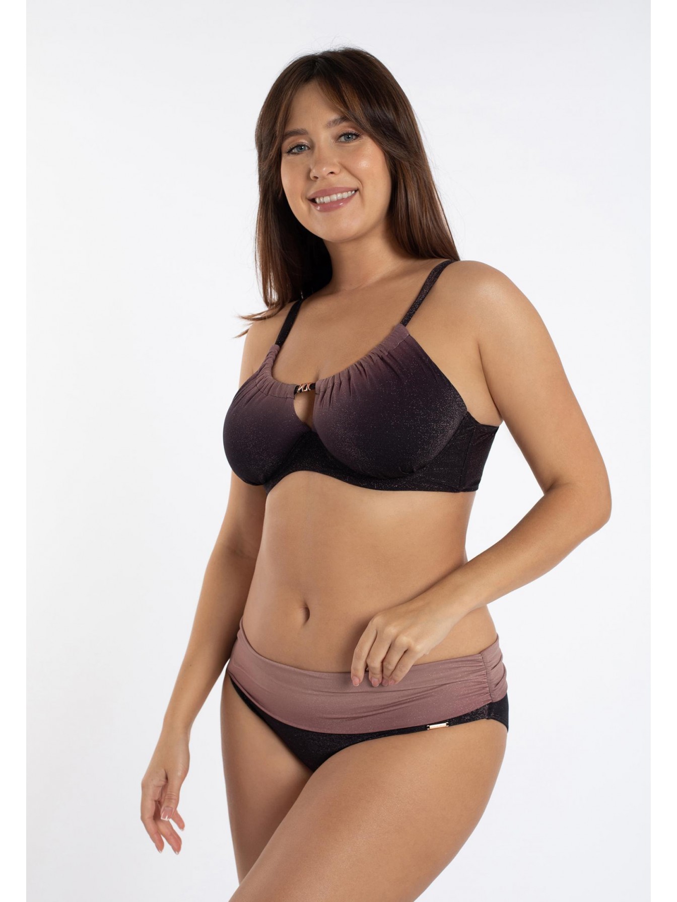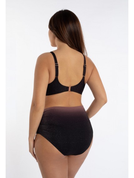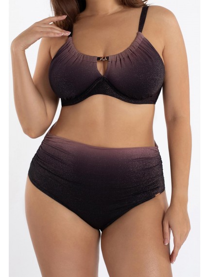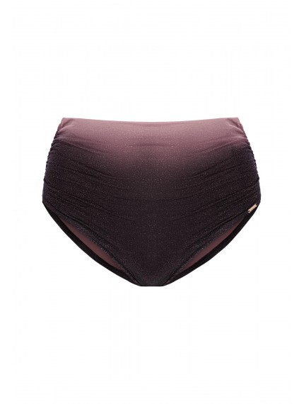 Плавки женские фиолетового цвета с регулируемой высотой линии талии. Высоту посадки можно регулировать за счет широкого пояса-отворота, поднимая или опуская пояс вниз. Классический вырез по линии бикини. Для большей уверенности все детали продублированы подкладкой.