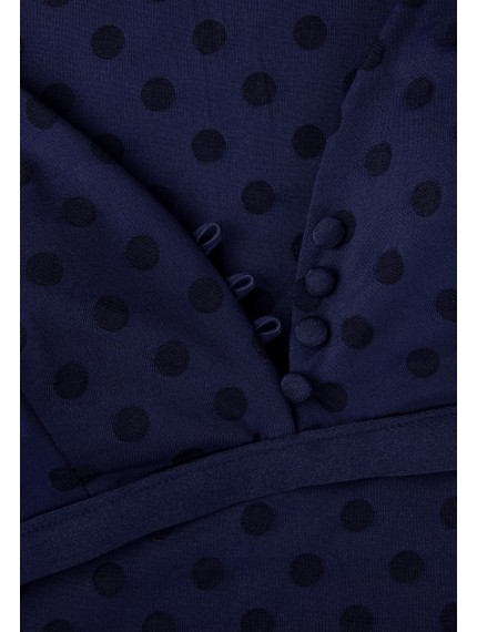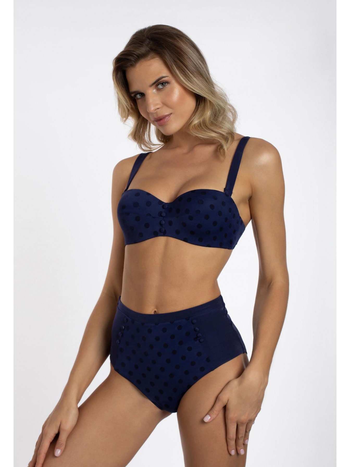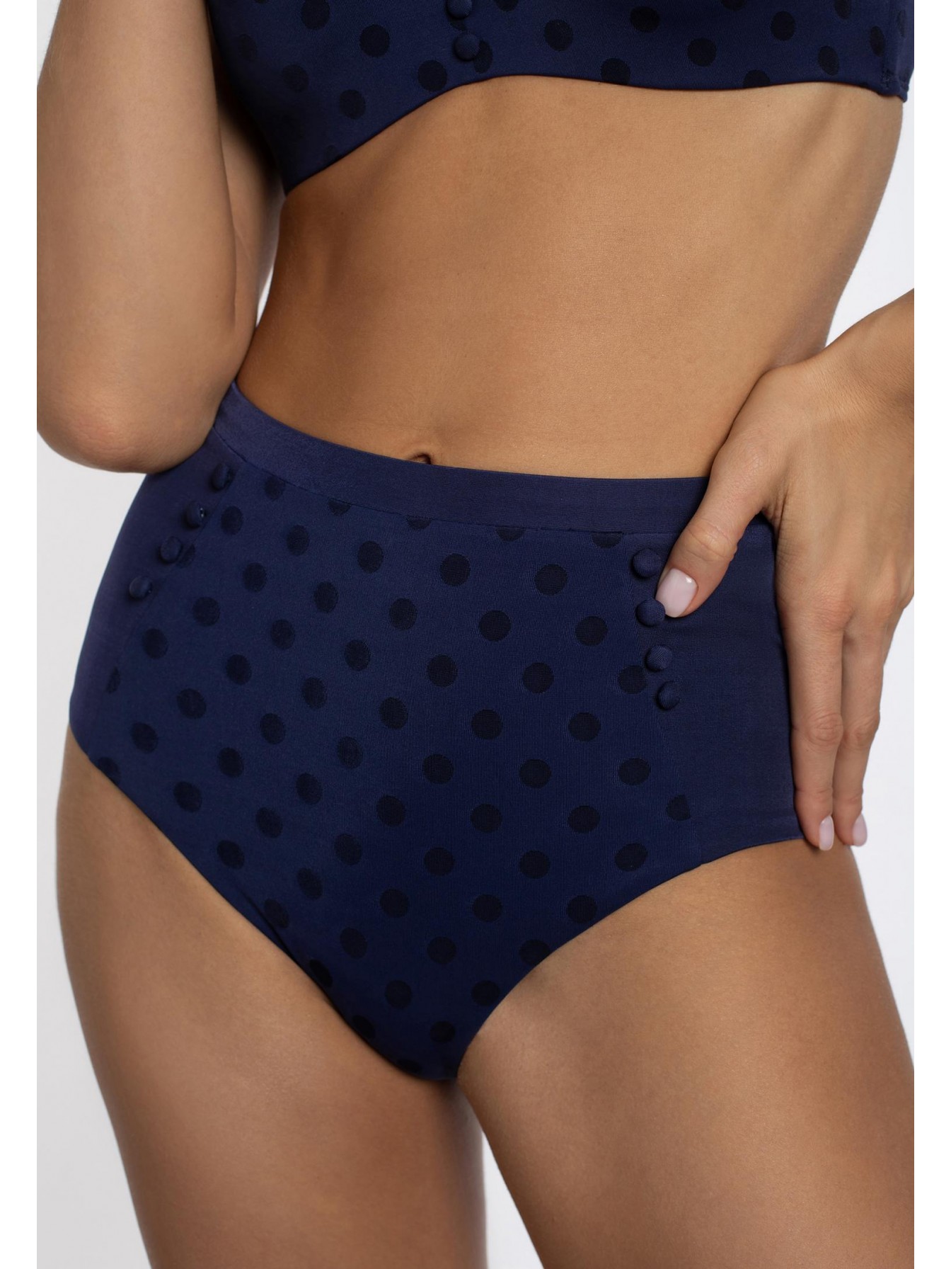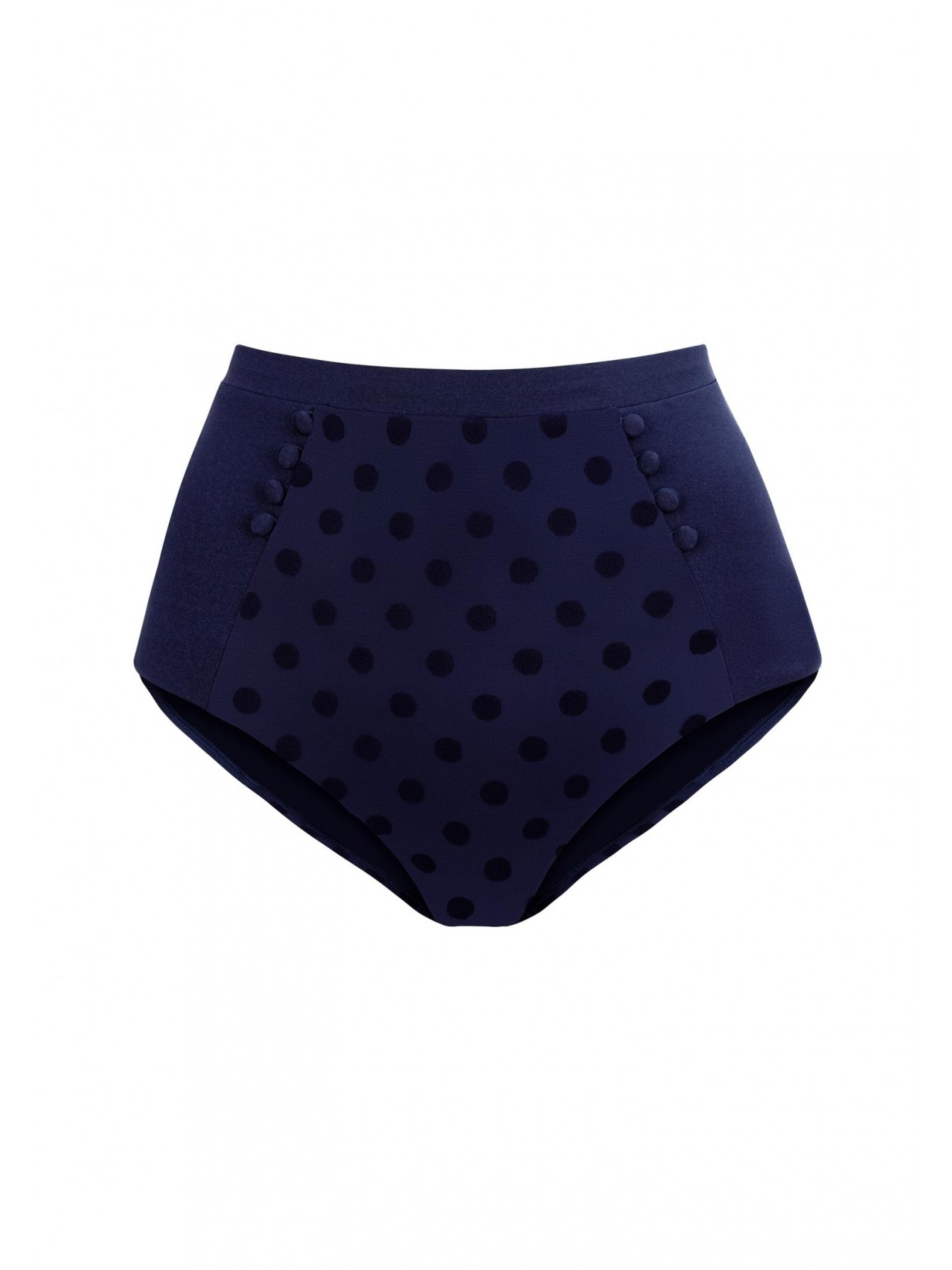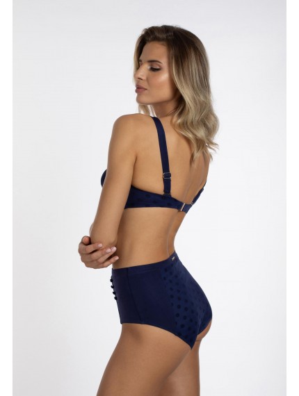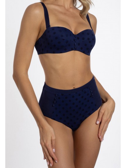 Плавки женские синего цвета с завышенной линией посадки. По бокам вставки из однотонного материала. Спереди с двух сторон декоративные пуговицы.