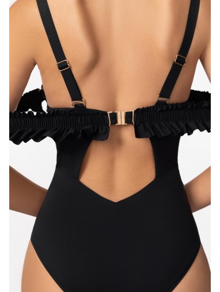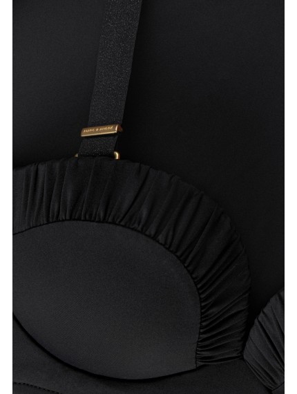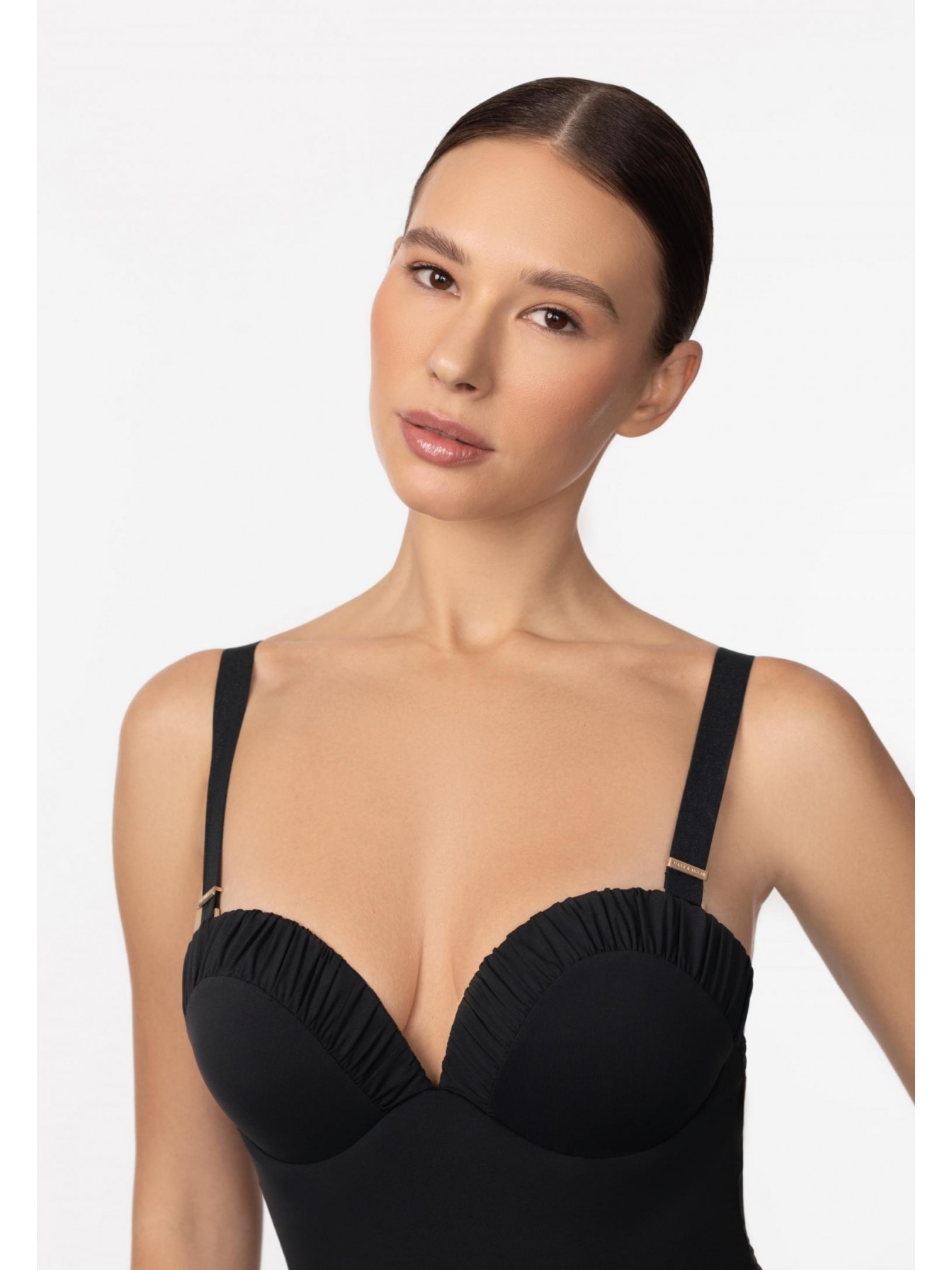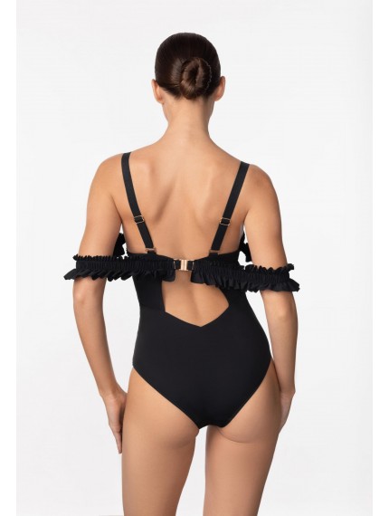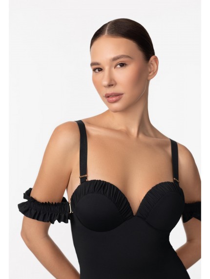 Купальник с формованной чашкой «бандо» на каркасной поддержке. Углубленная линия декольте. Съемные регулируемые бретели. Дополнительные съемные широкие бретели-рюши. Открытая спина. На спине застежка.