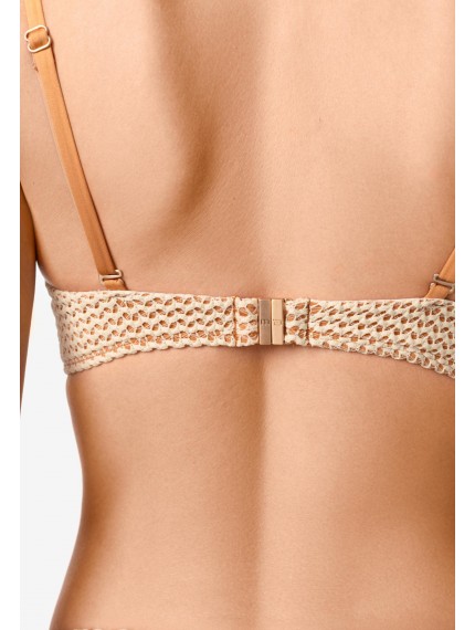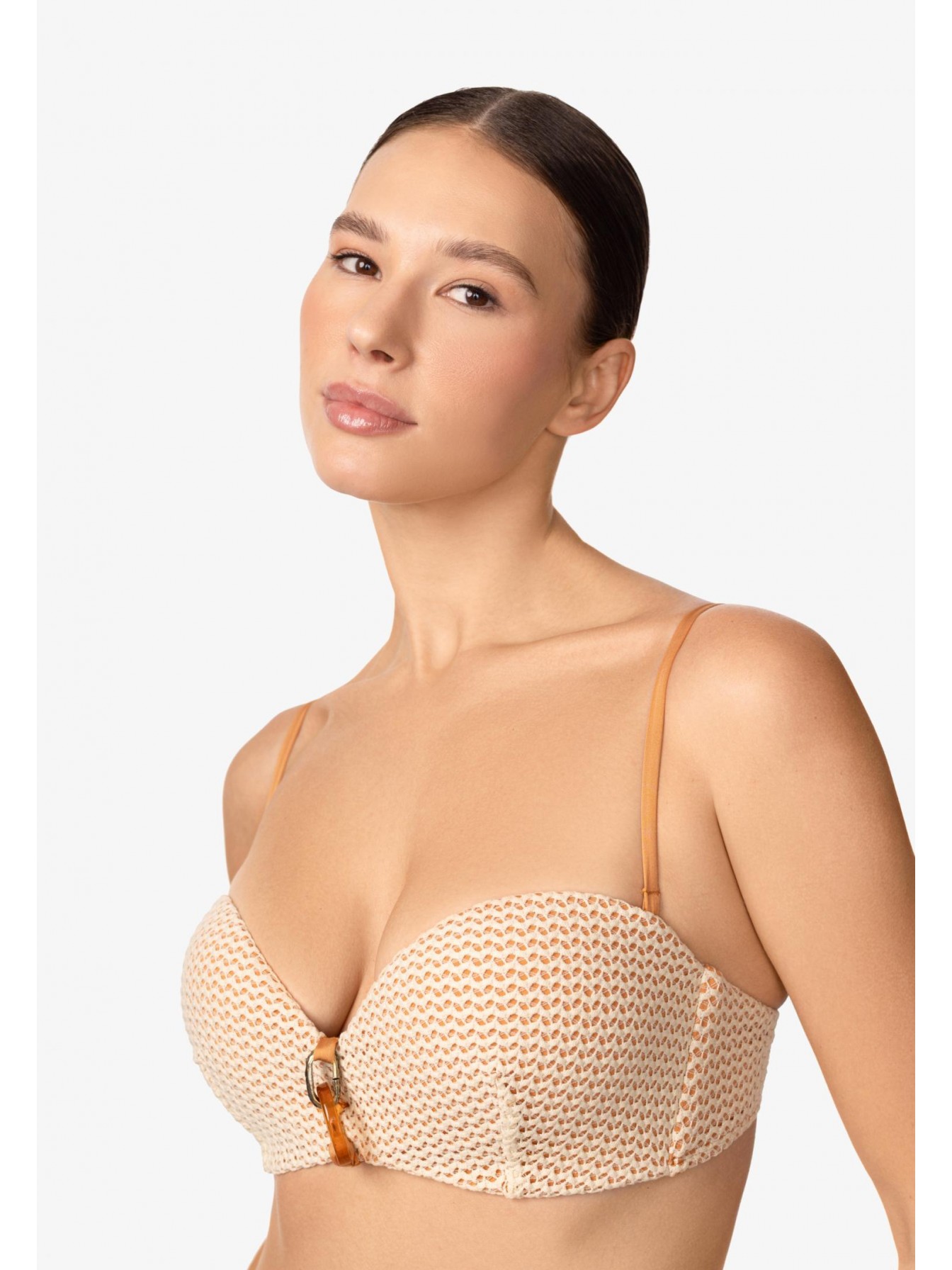 Бескаркасная чашка «бандо» со встроенным «Super пуш-ап». Эффект «скрытого каркаса». Уплотнённый стан для комфортной и надежной поддержки. Внутри силиконовая лента по верхнему краю. По центру аксессуар. Регулируемые съемные бретели. На спине застежка.