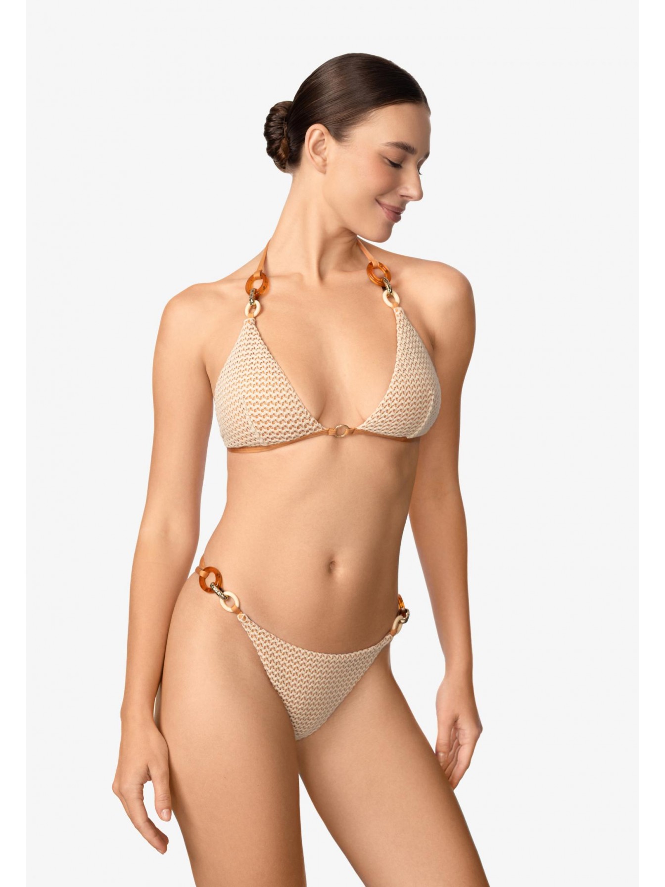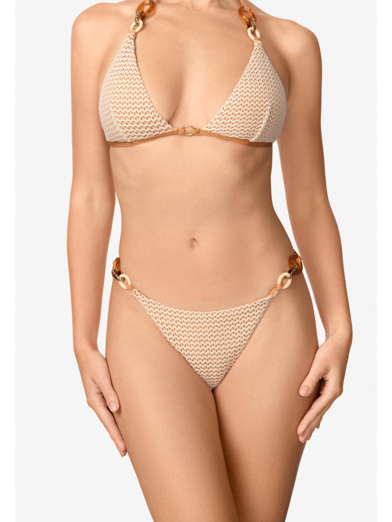 Брифы мини-бразилиана с заниженной ли-нией талии. По бокам аксессуары. Вертикальный шов на задней детали. Обработка задней детали в подворот с чистым краем.