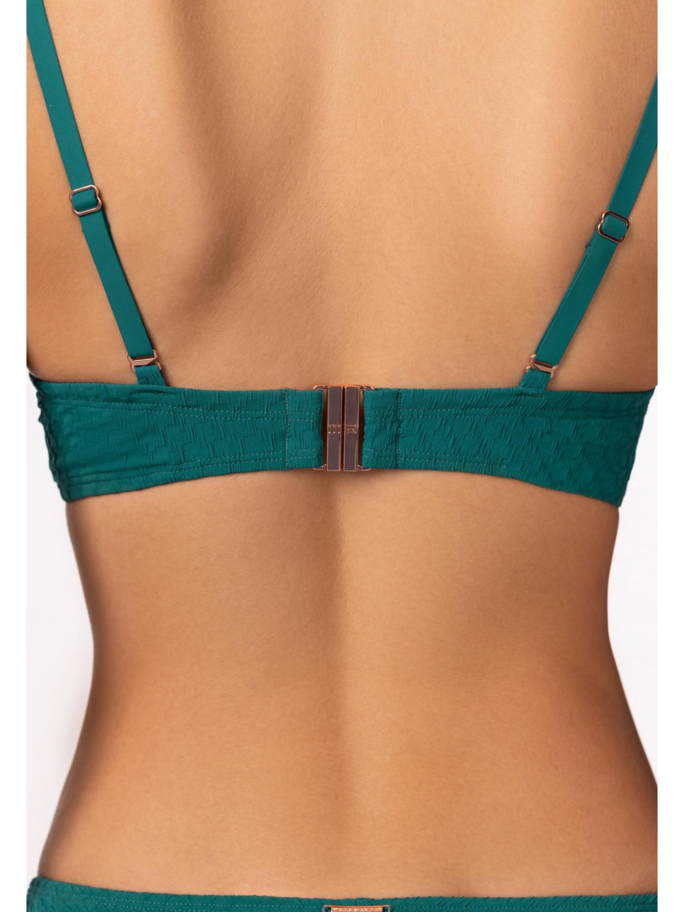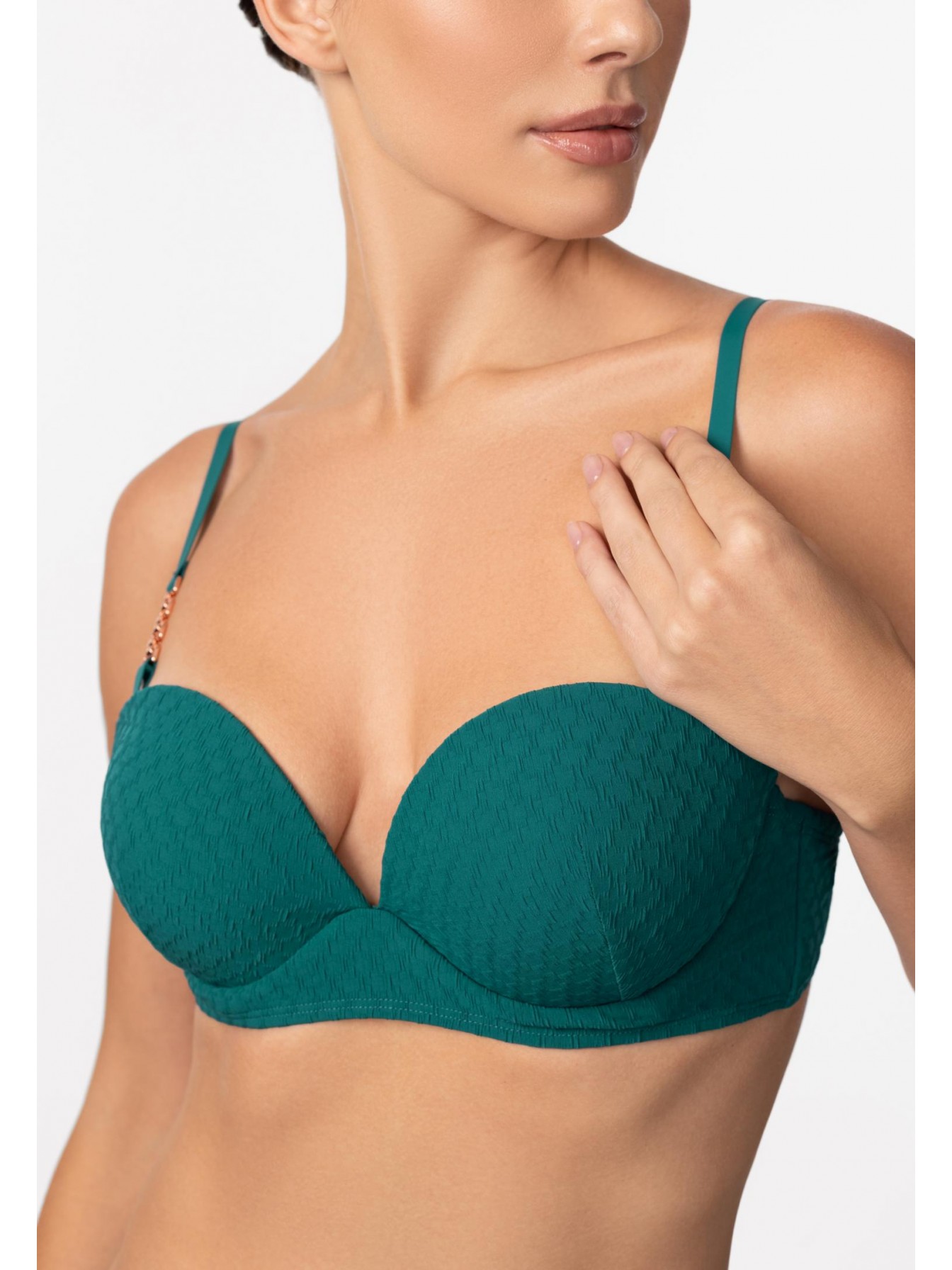 Формованная чашка «бандо» на каркасной поддержке. Углубленная линия декольте. Расширенный стан. Съемные регулируемые бретели украшены аксессуарами. На спине застежка.