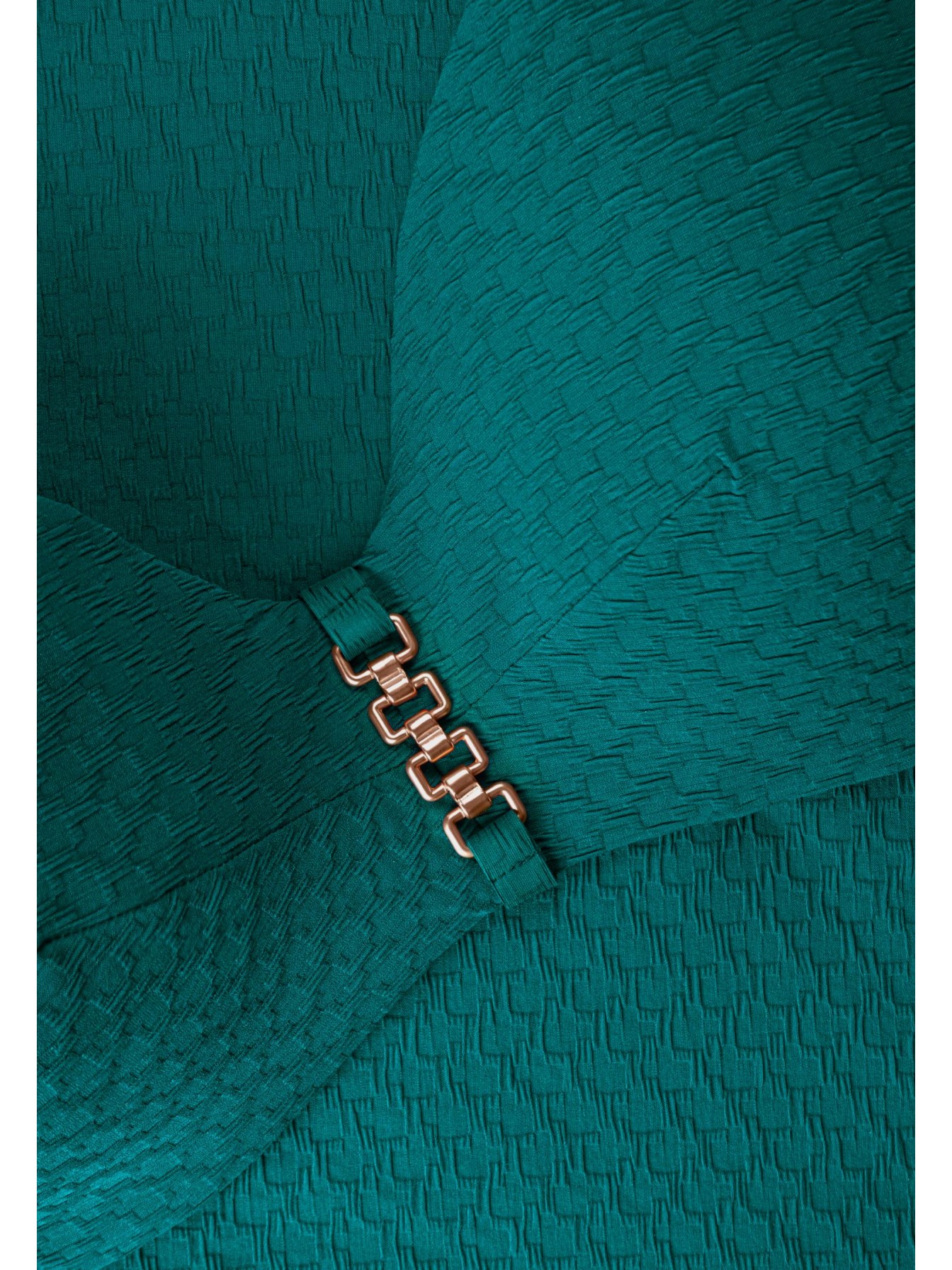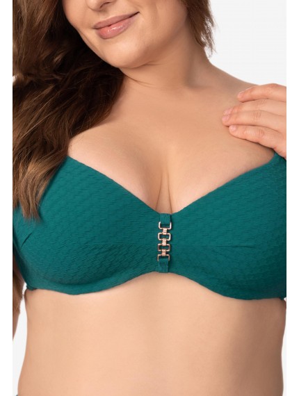 Формованная чашка на каркасной поддержке. Углубленная линия декольте. По центру между чашек аксессуар. Широкие бретели с поролоновой вставкой. На спине застежка.