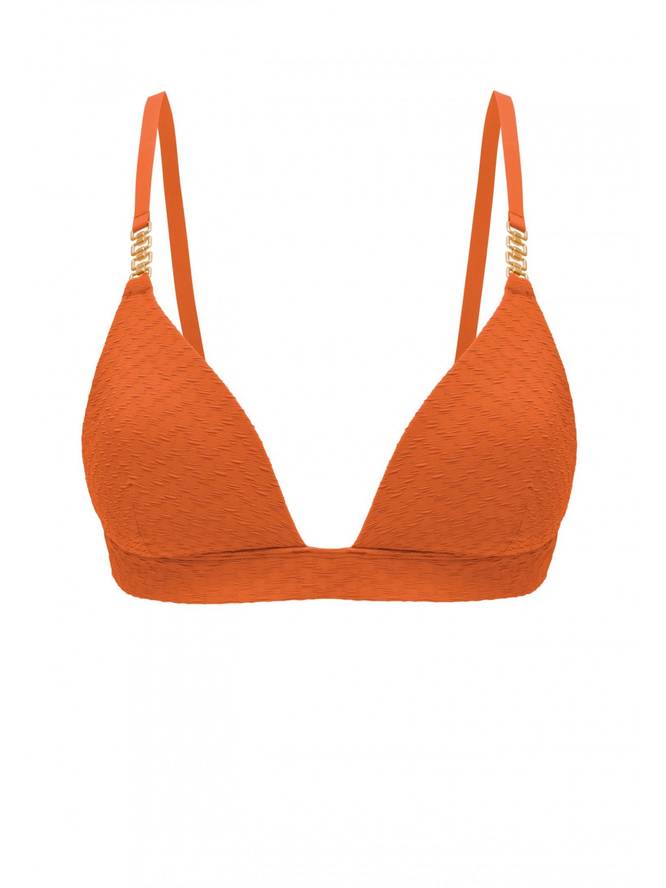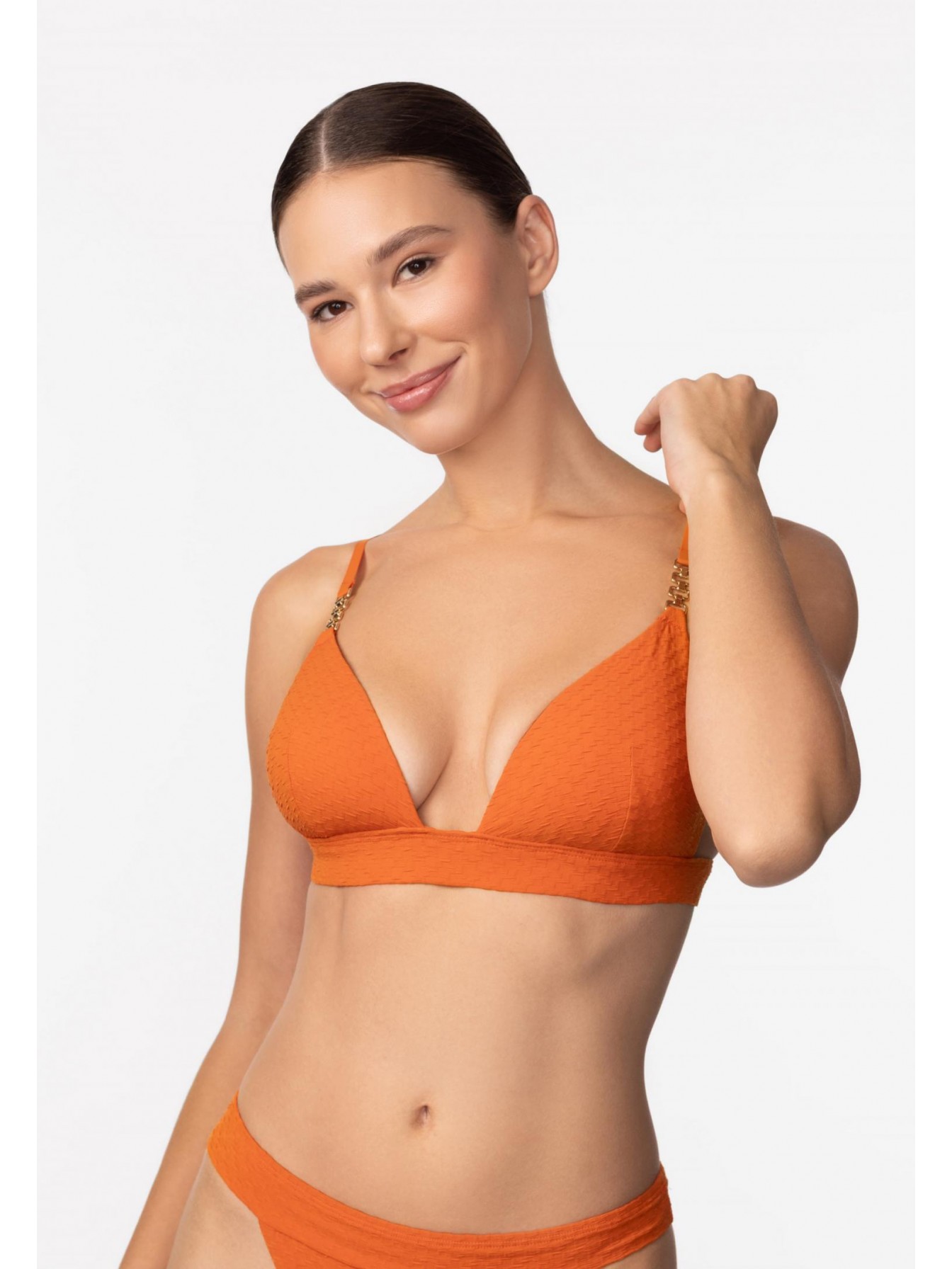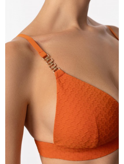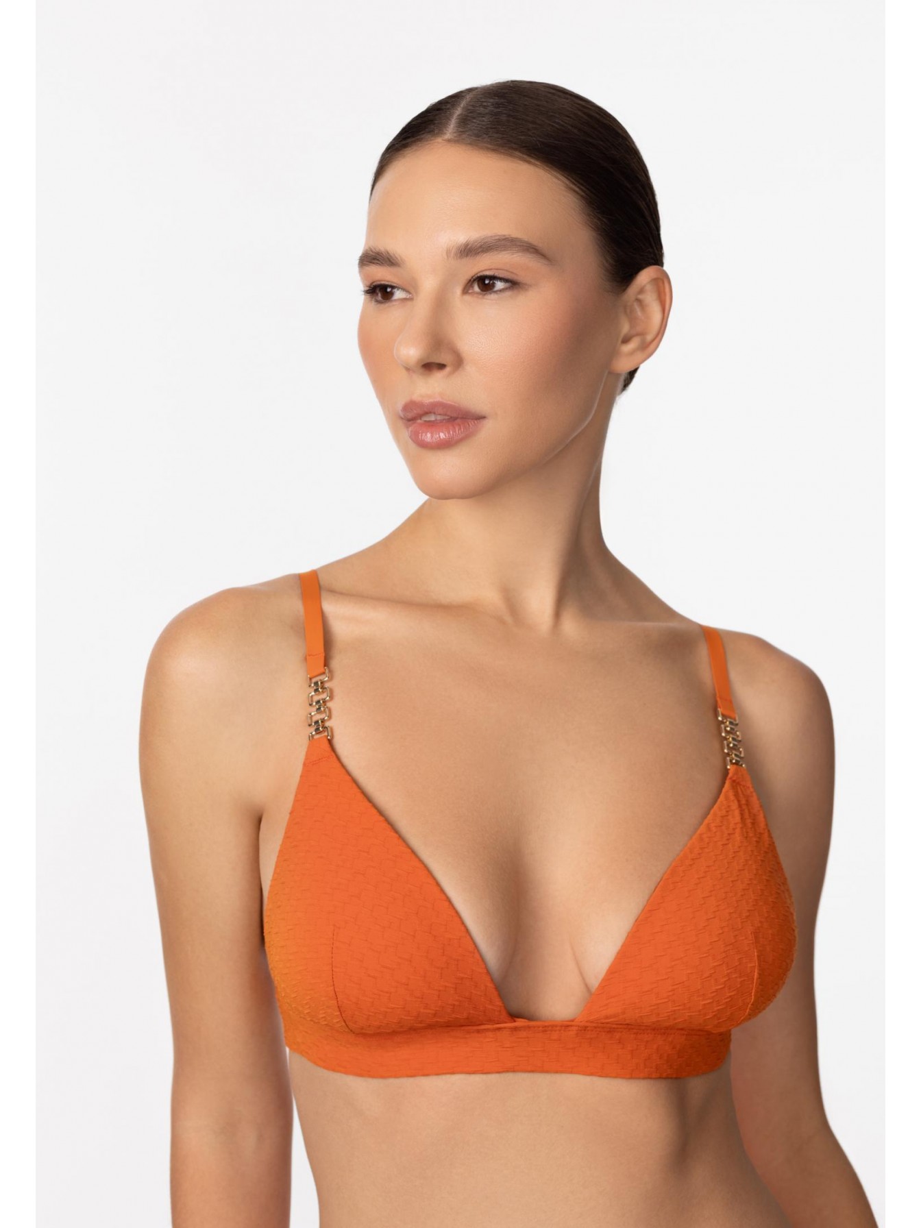 Формованная треугольная чашка со съемными корректорами «пуш-ап». Регулируемые бретели украшены аксессуаром. На спине застежка.