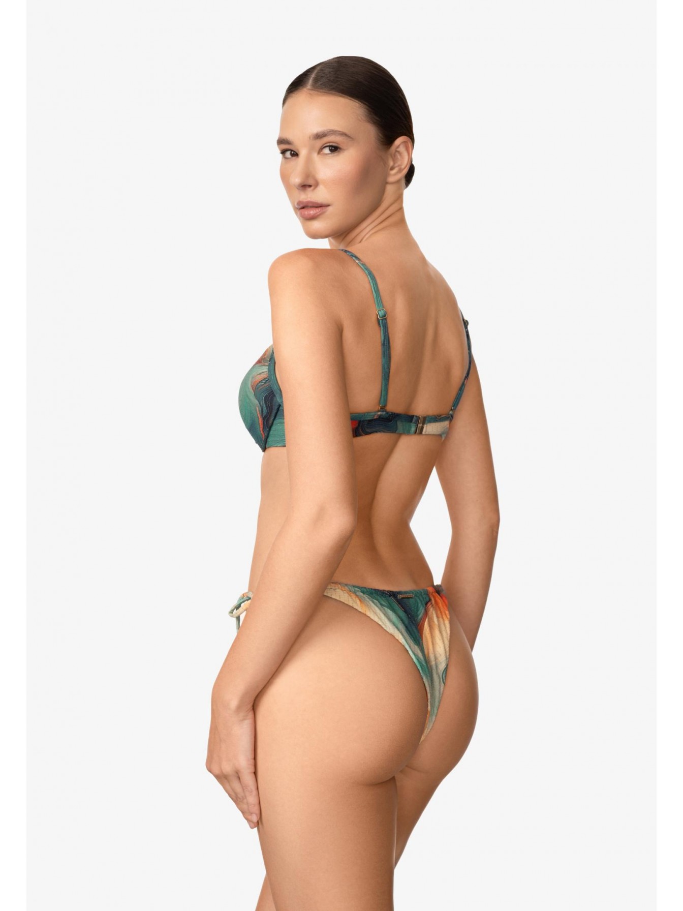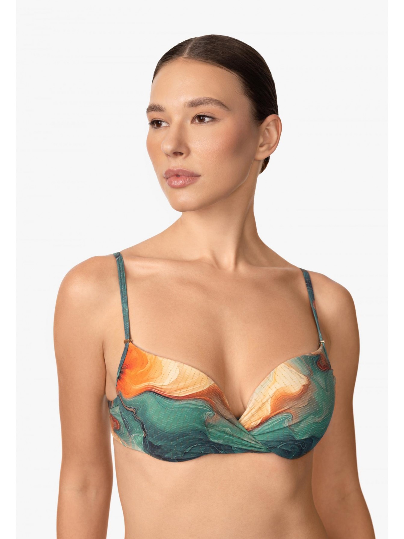 Формованная чашка на каркасной поддержке со съемными корректорами «пуш-ап». Спереди декоративный перекрут. Регулируемые бретели. На спине застежка.