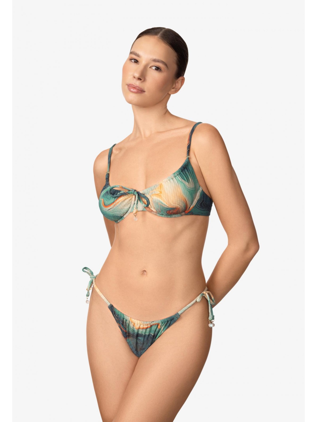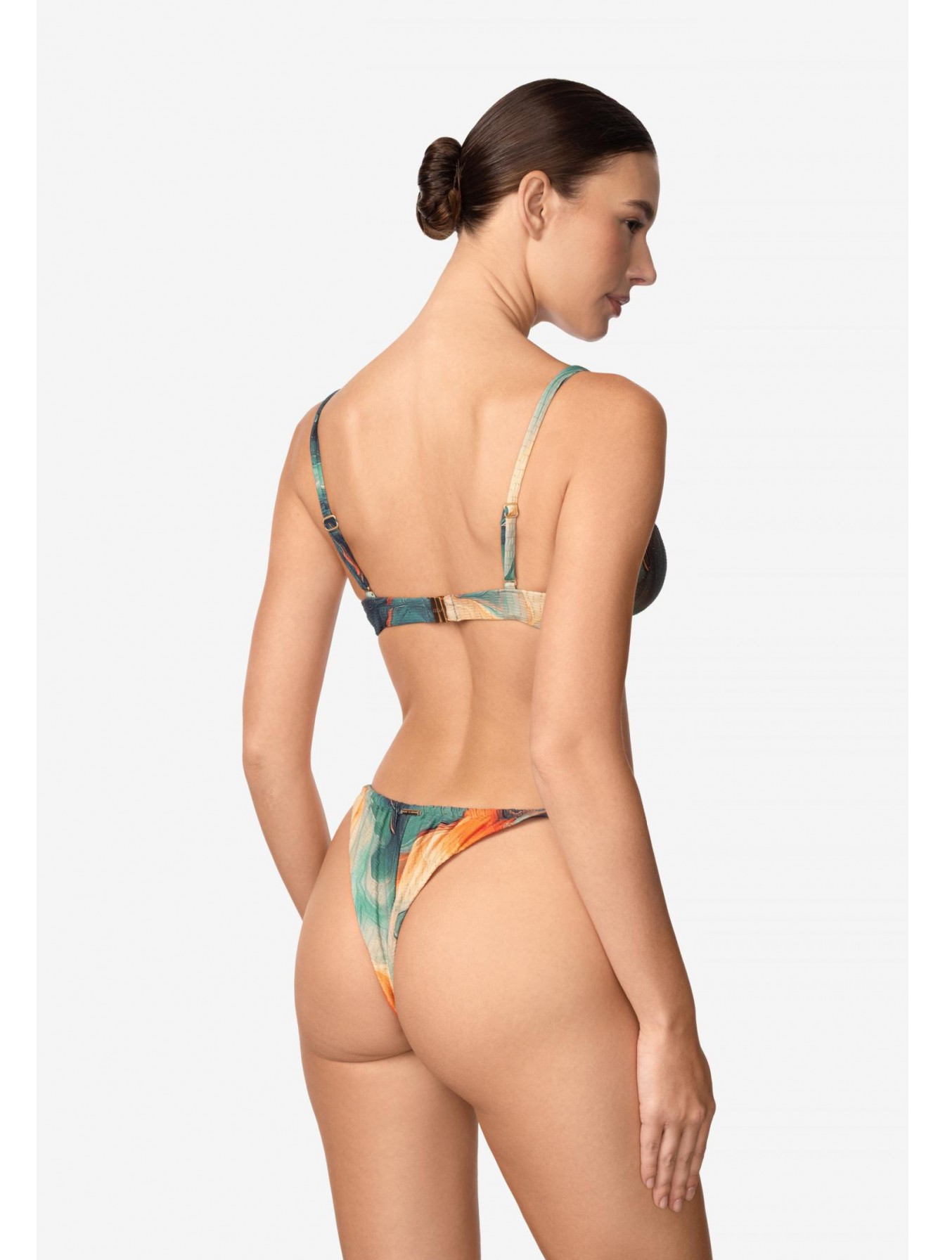 Брифы мини-бразилиана с заниженной линией талии на тонких завязках. Завышенный вырез по линии бикини. Обработка задней детали в подворот с чистым краем.