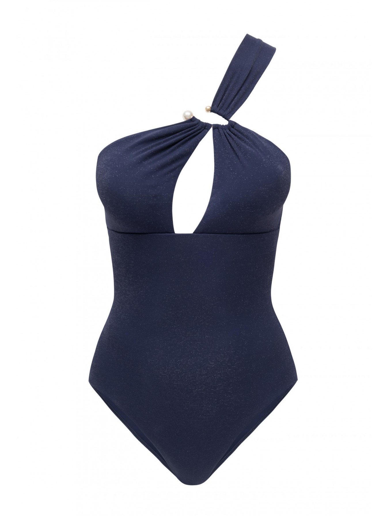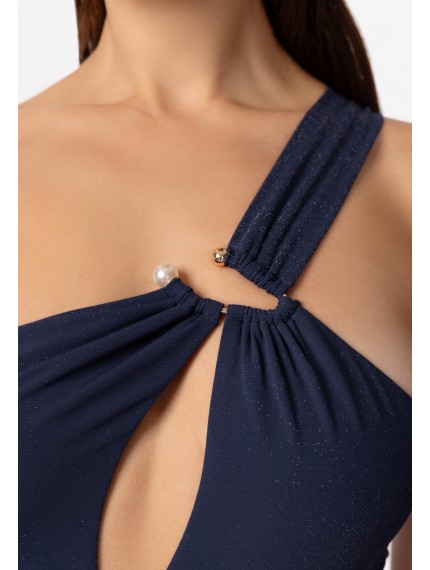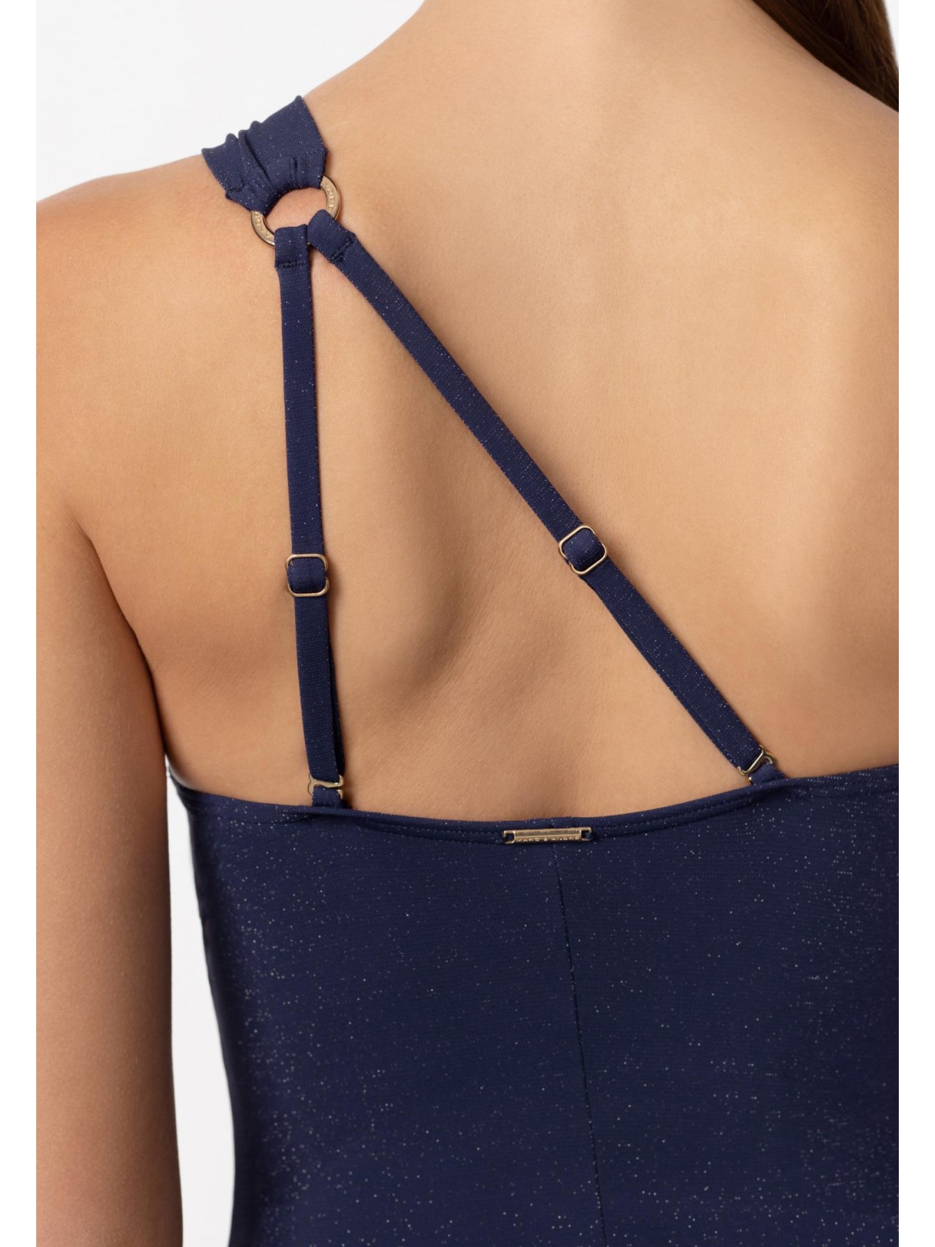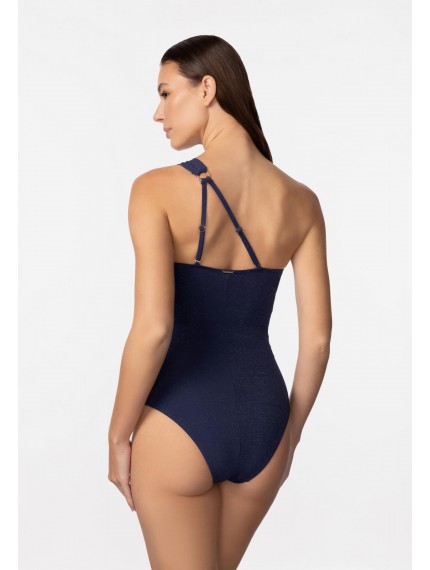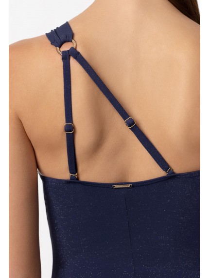 Купальник с асимметричным кроем по линии декольте. Тонкие вшитые корректоры. Глубокий вырез по линии декольте. Широкая асимметричная бретель спереди фиксируется на аксессуаре. На спине две тонкие регулируемые бретели.