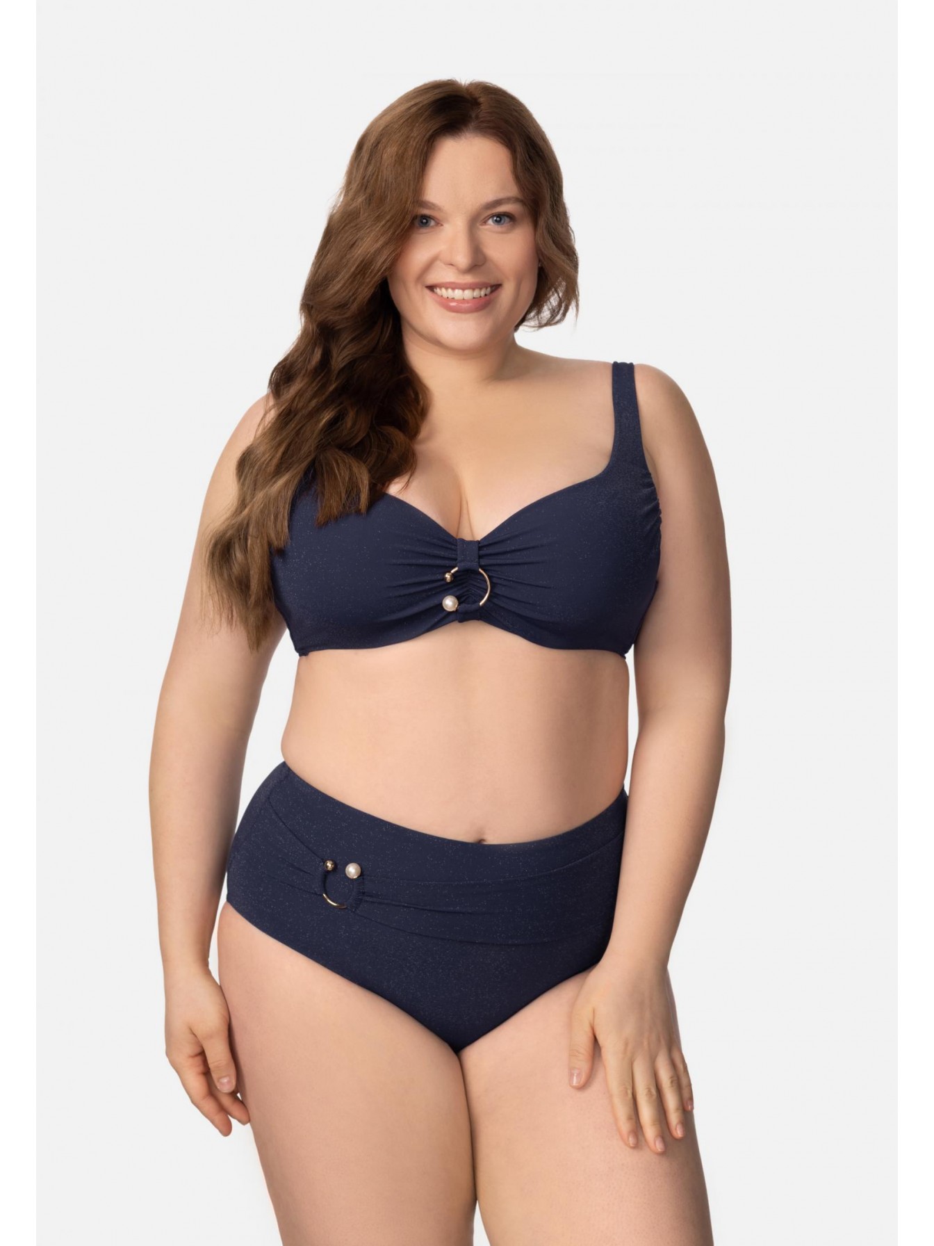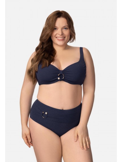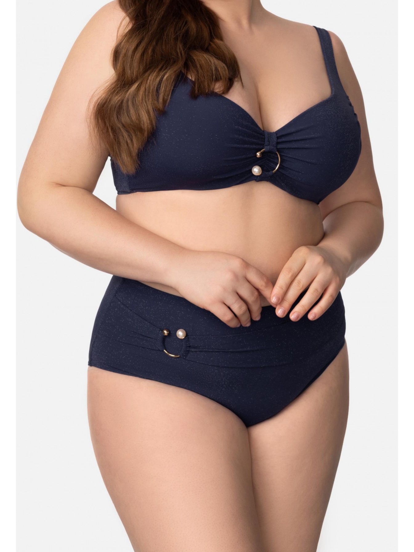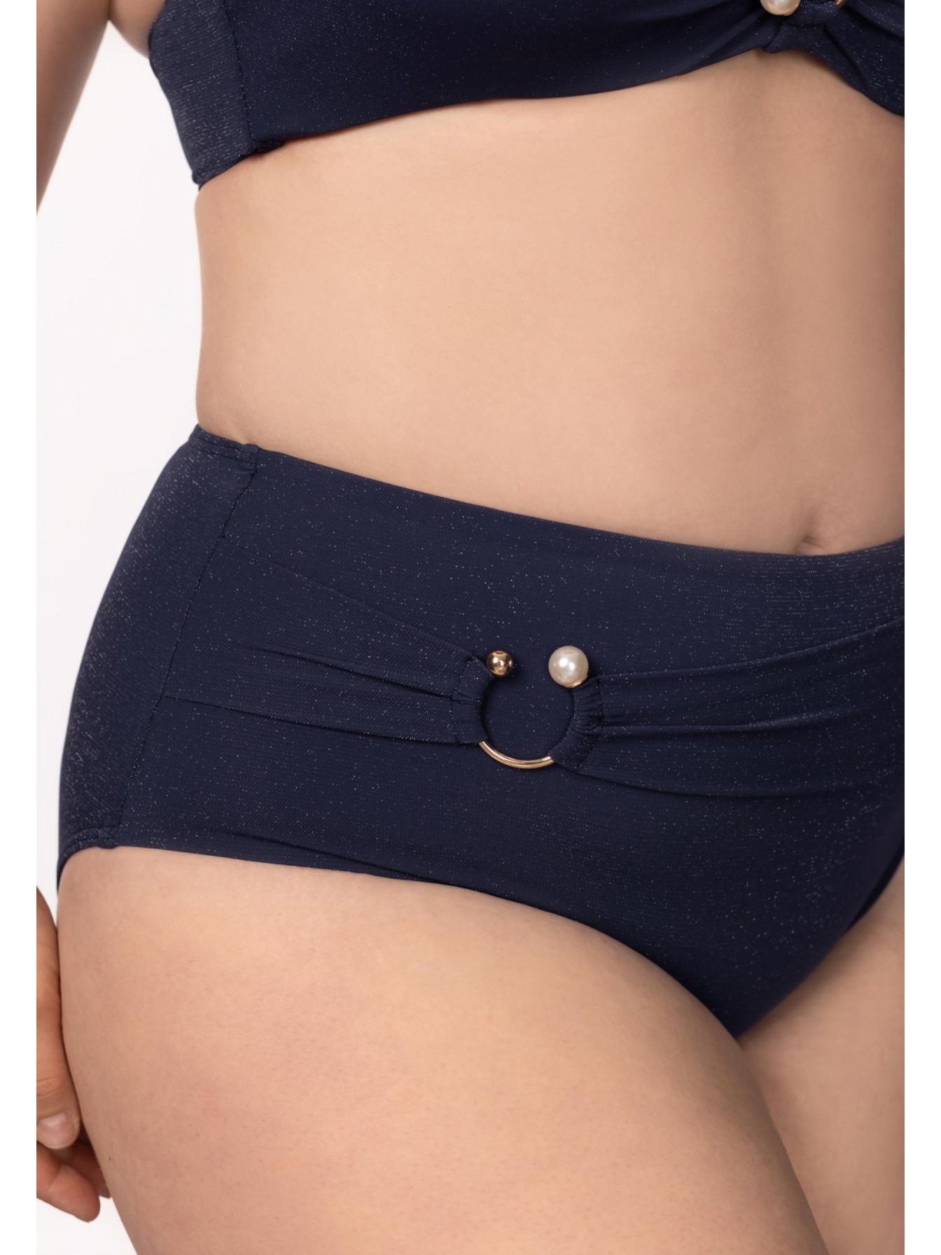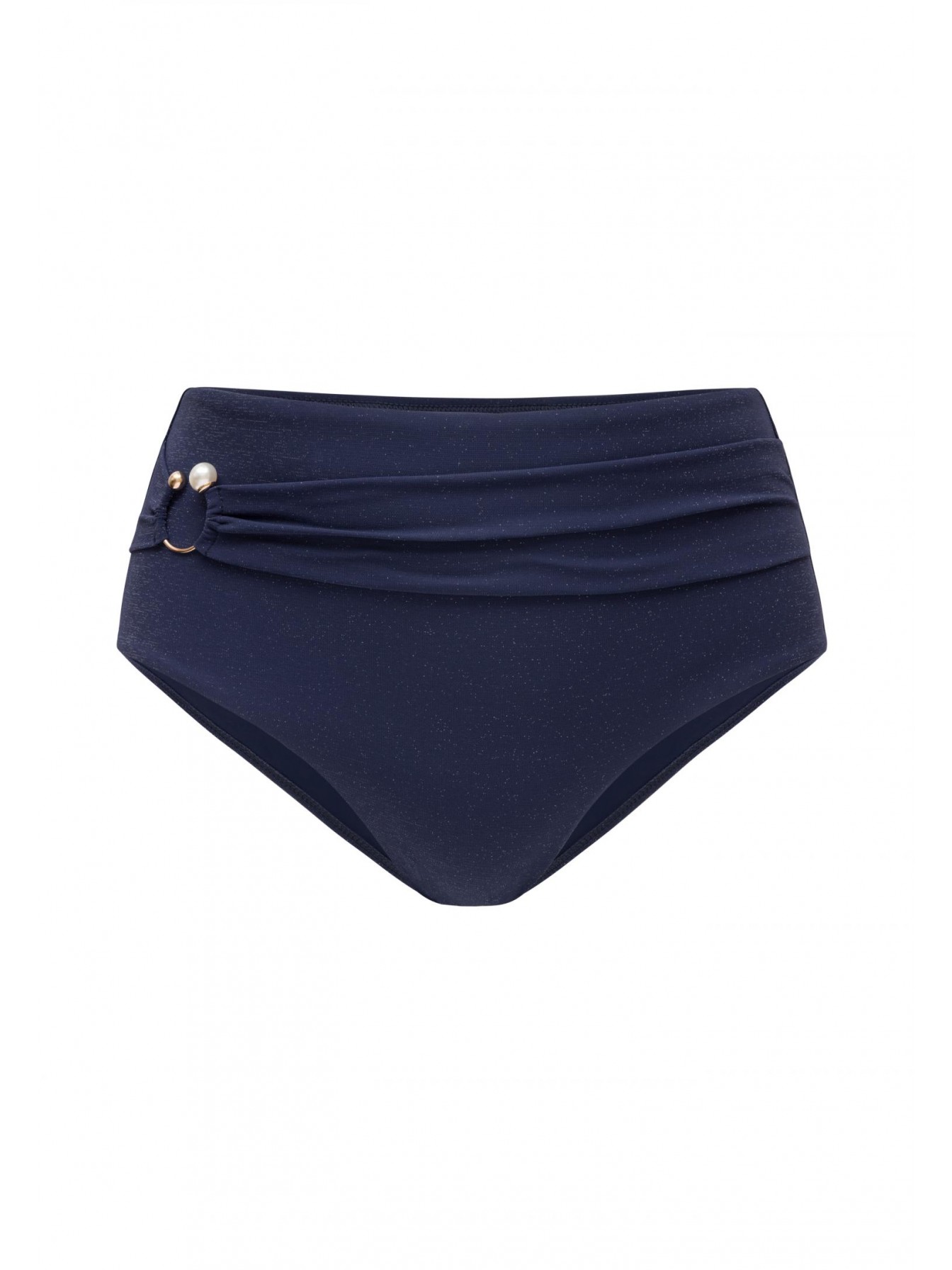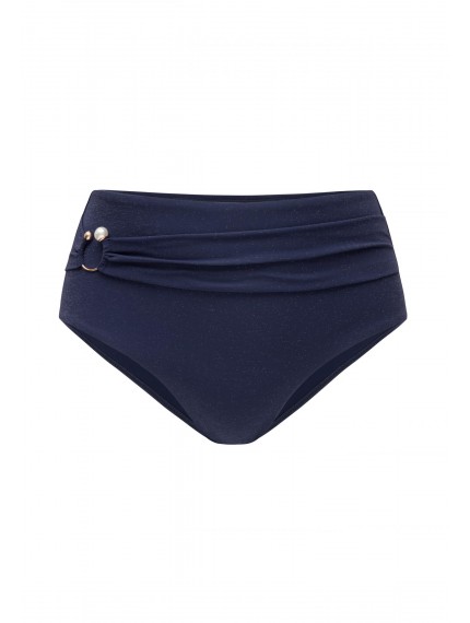 Брифы с завышенной линией талии. Спереди широкий пояс с асимметричной драпировкой и аксессуаром.