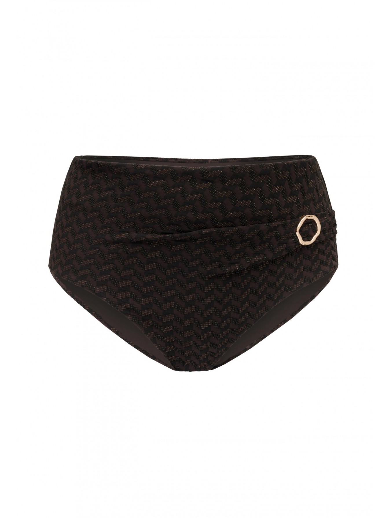 Брифы с завышенной линией талии. Спереди асимметричная декоративная драпировка на один бок и аксессуар.
