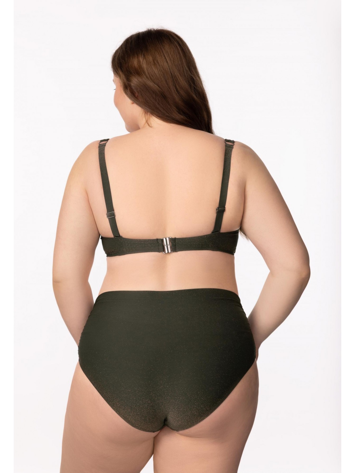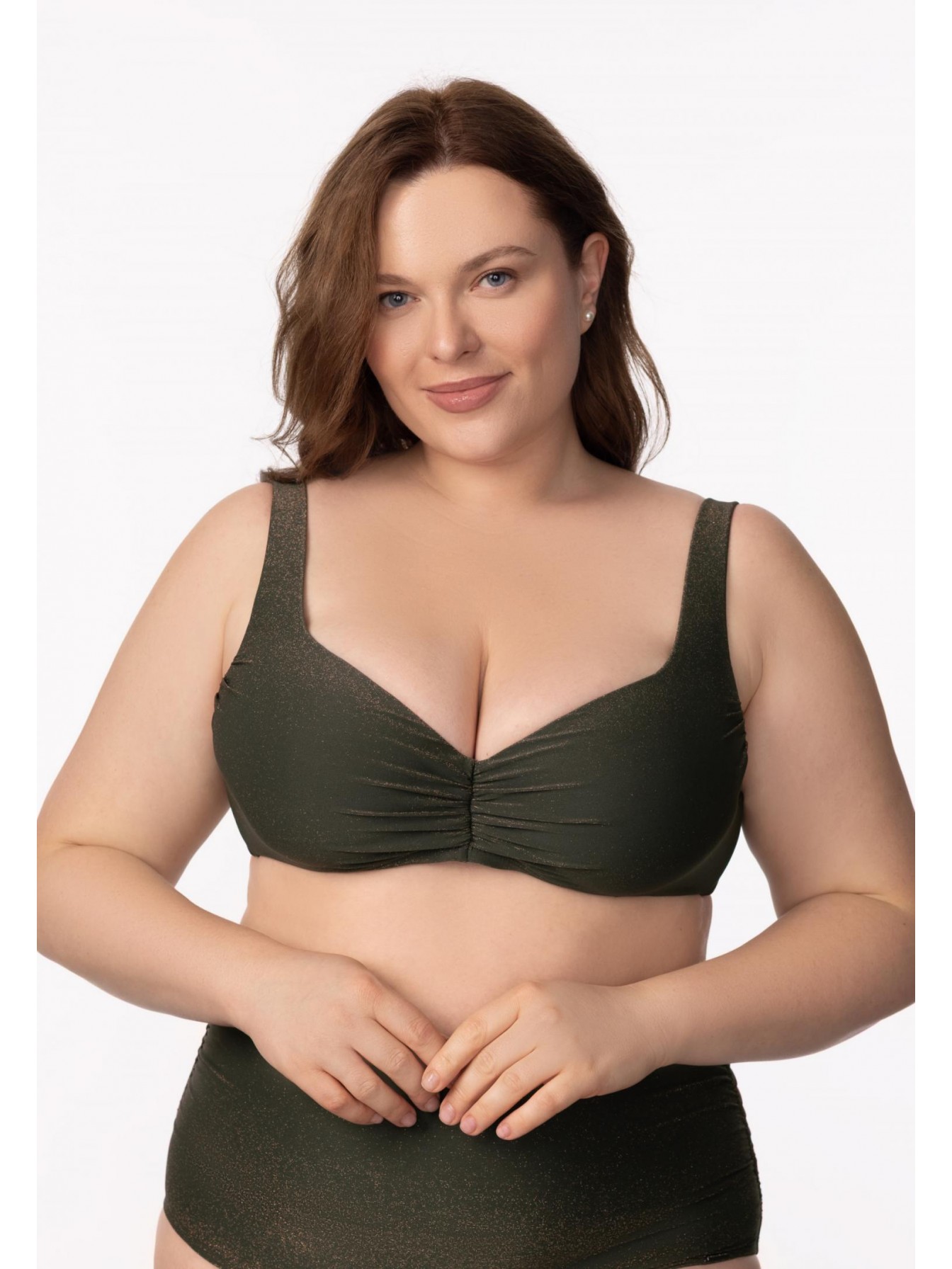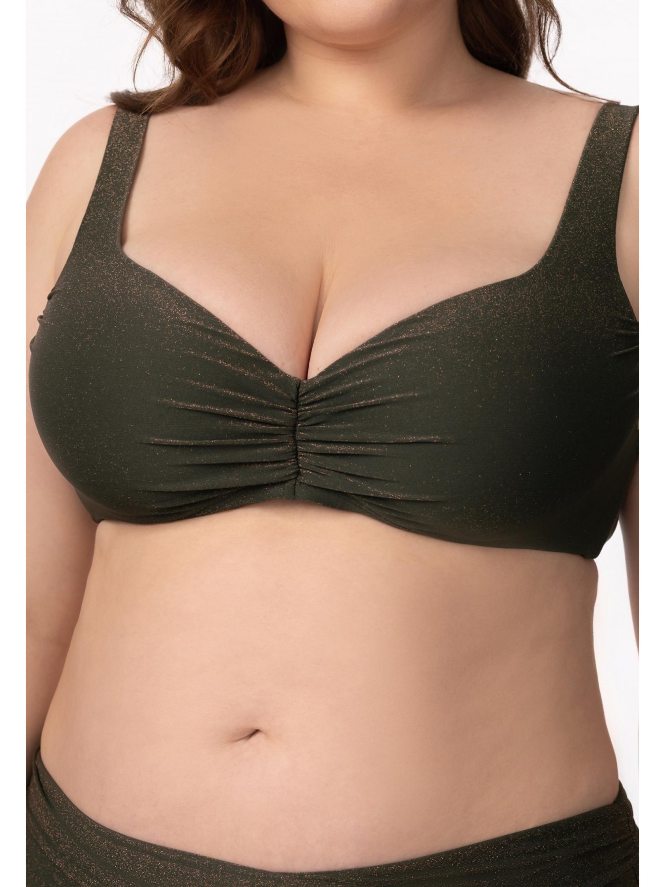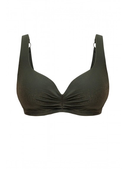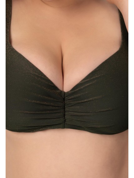 Формованная чашка на каркасной поддержке. Подойдет для обладательниц пышных форм. Углубленная линия декольте. Широкие регулируемые бретели с поролоновой вставкой. На спине застежка.