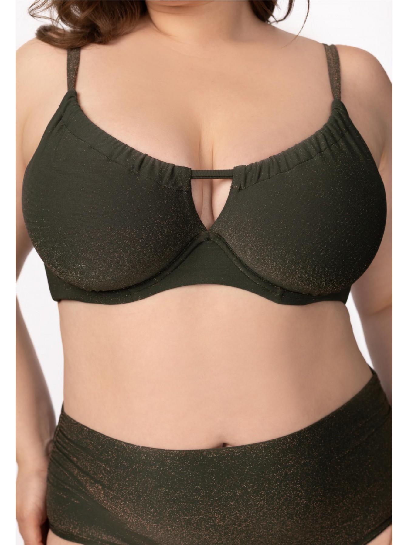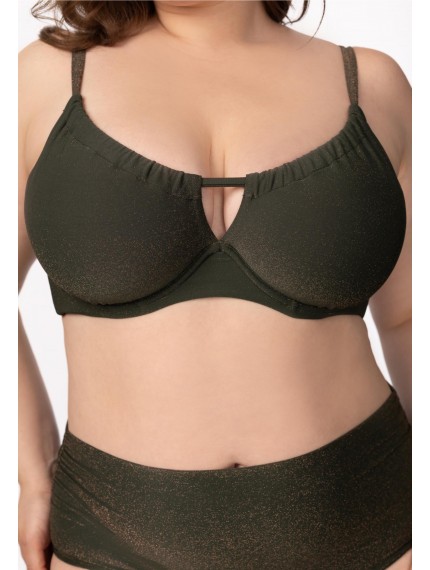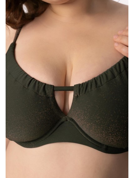 Мягкая чашка на каркасной поддержке. Подойдет для обладательниц пышных форм. Регулируемые бретели фиксируются на спине. По верху чашки регулируемая кулиска с легкой драпировкой. Широкий стан. На спине застежка.