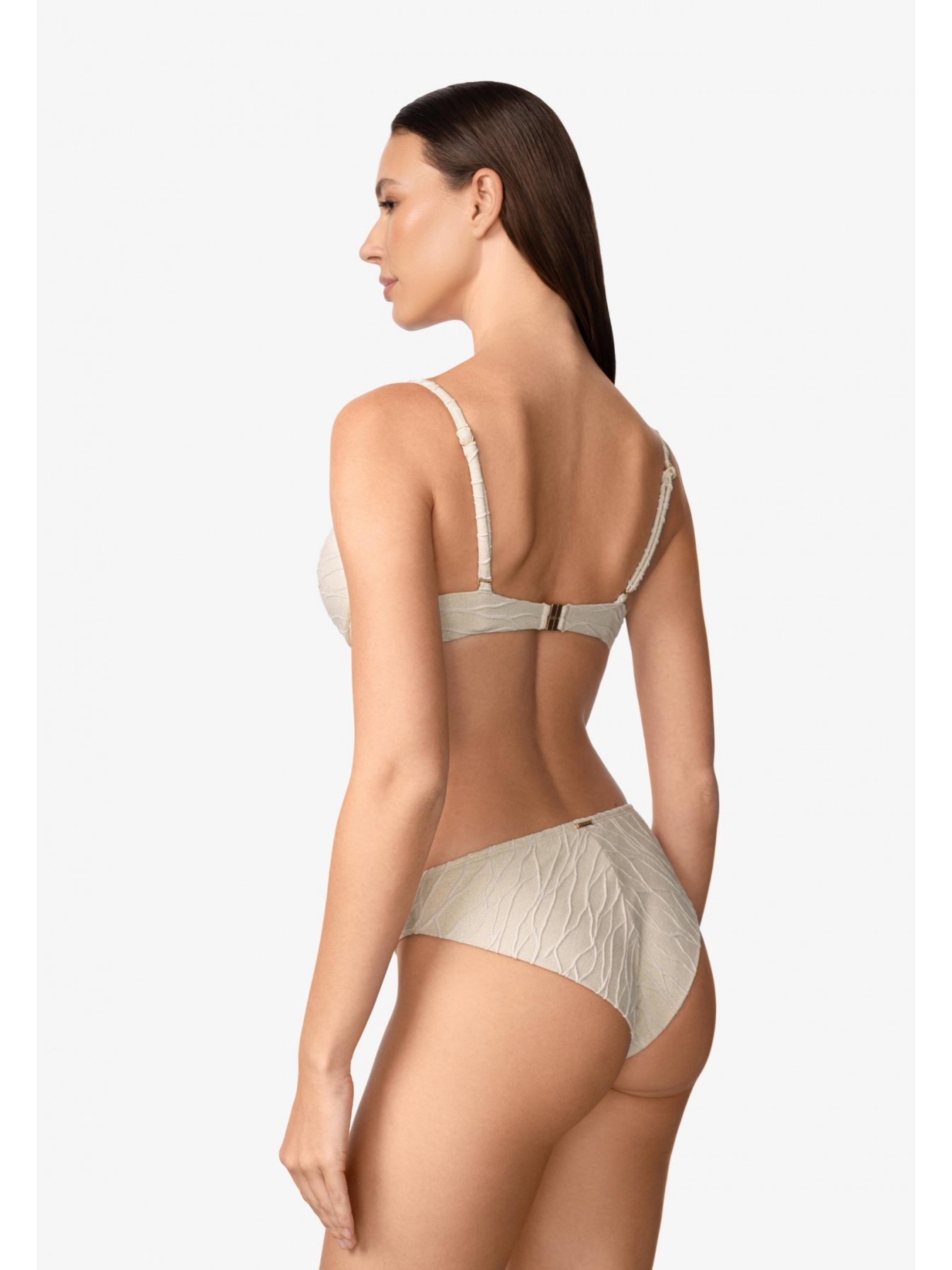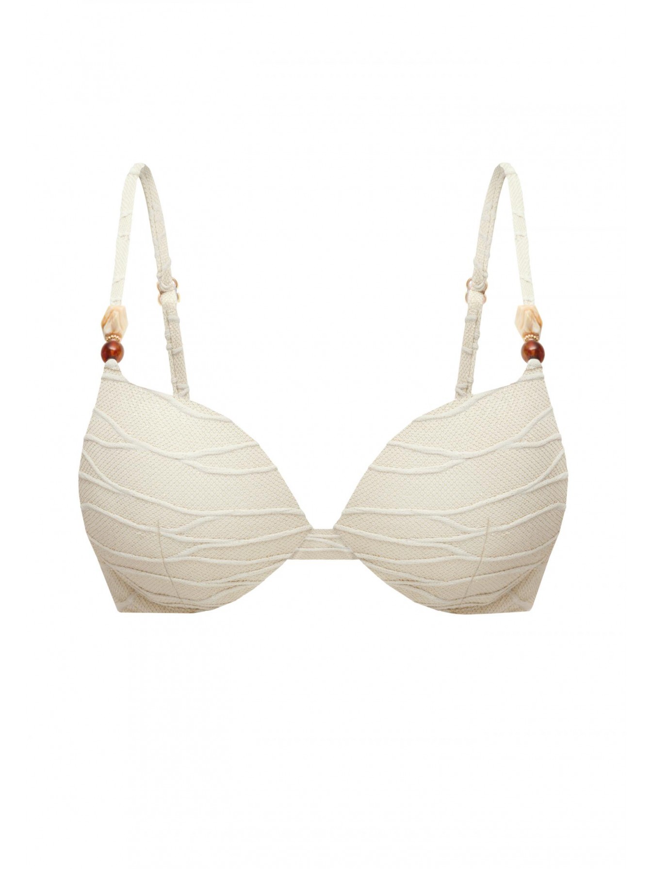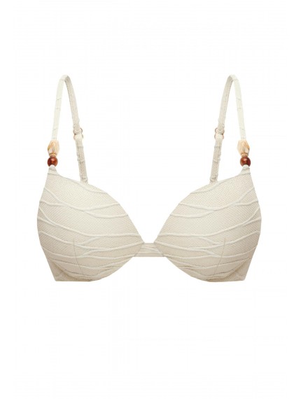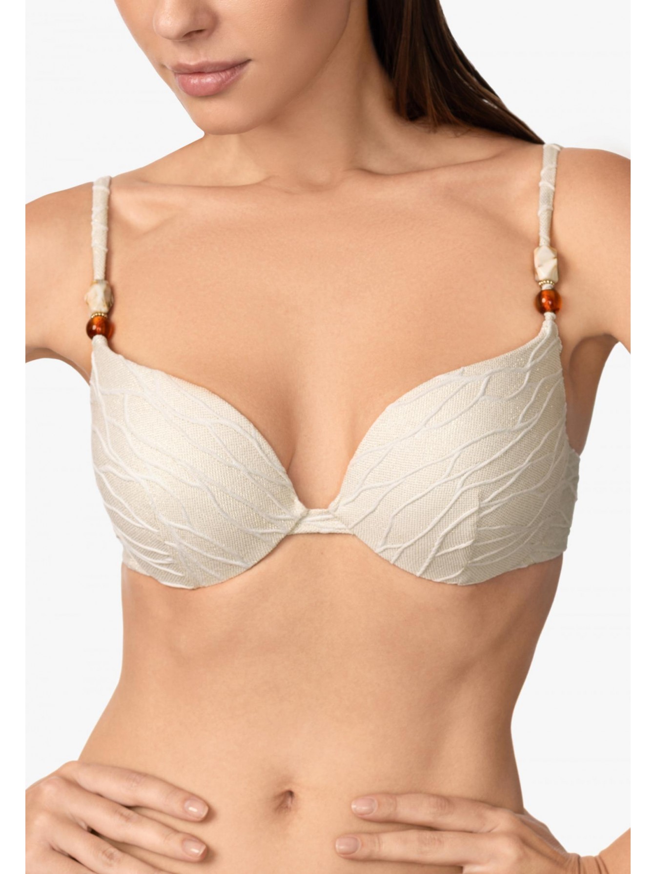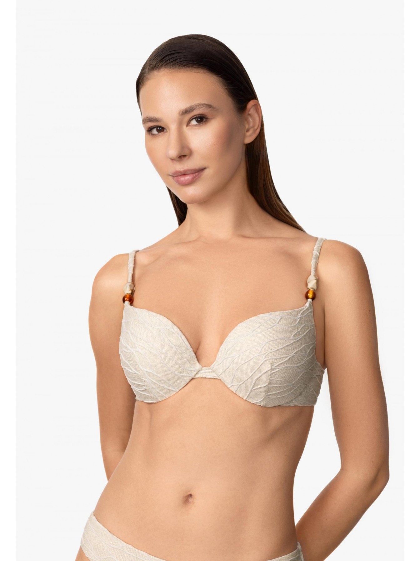 Формованная чашка со съемными корректорами «пуш-ап» на каркасной поддержке. На спине застежка. Регулируемые бретели декорированы аксессуарами.