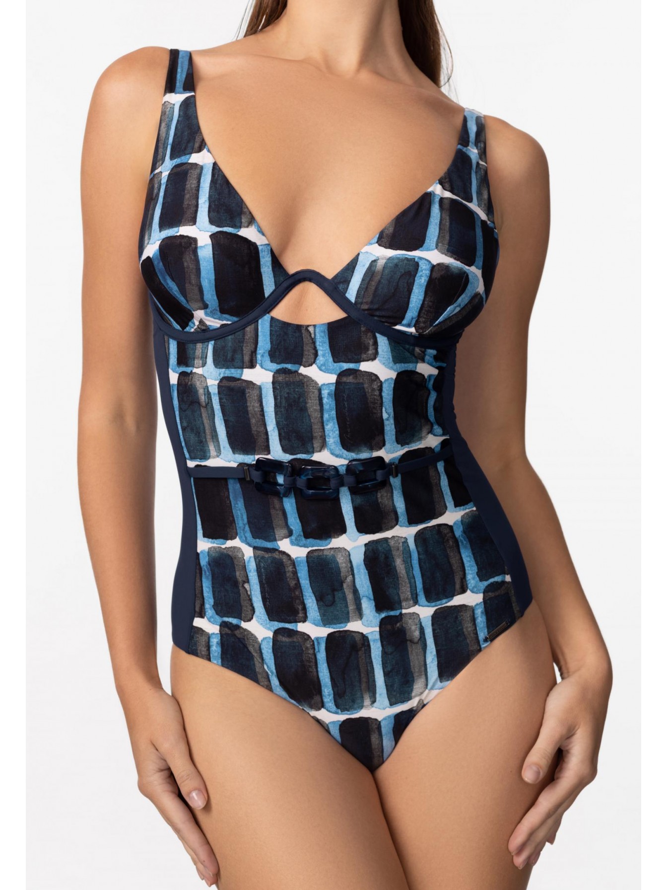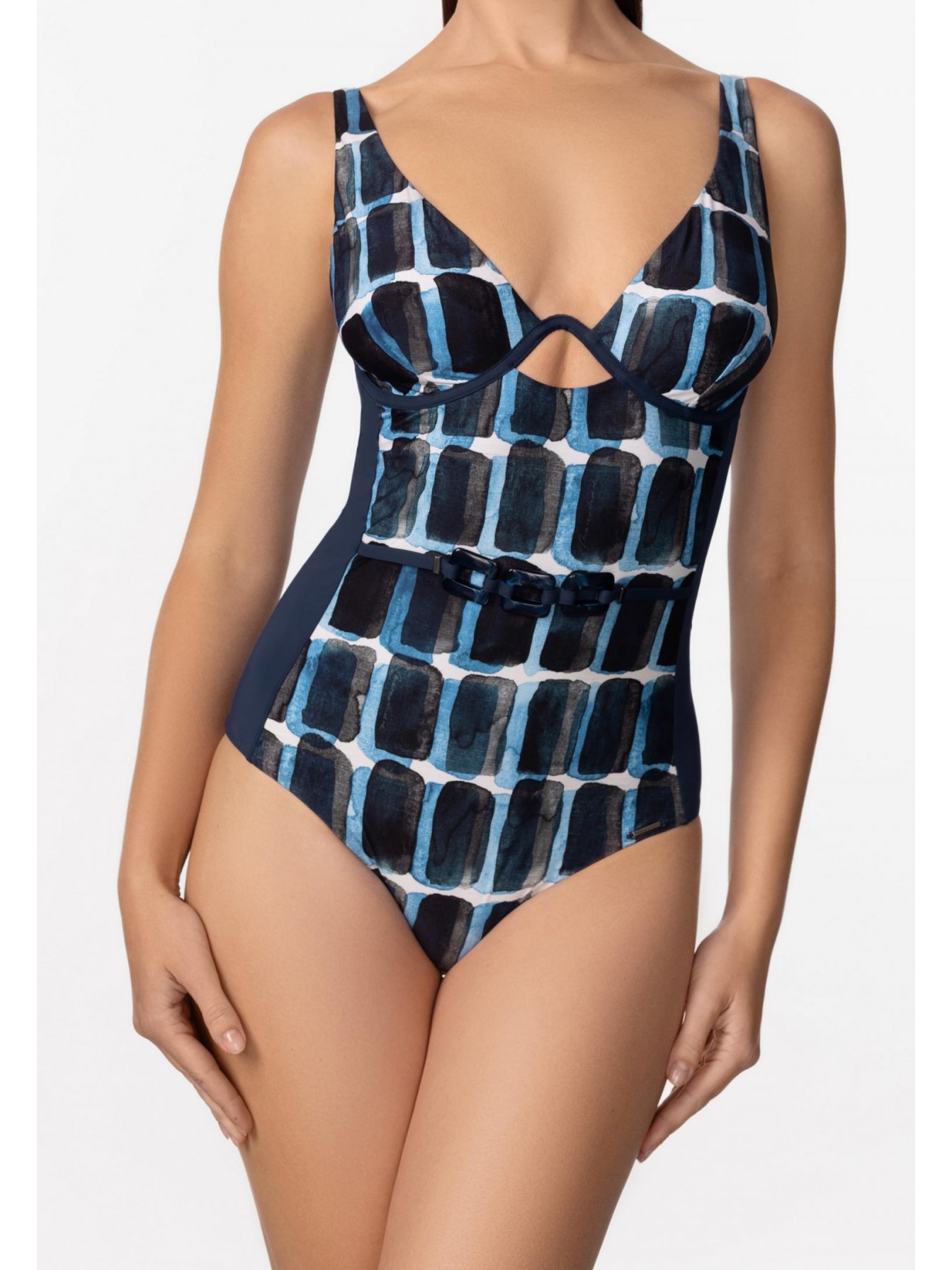 Мягкая чашка на монокаркасной поддержке, без корректоров. По линии талии декоративный пояс с аксессуаром. Завышенный вырез по линии бикини.