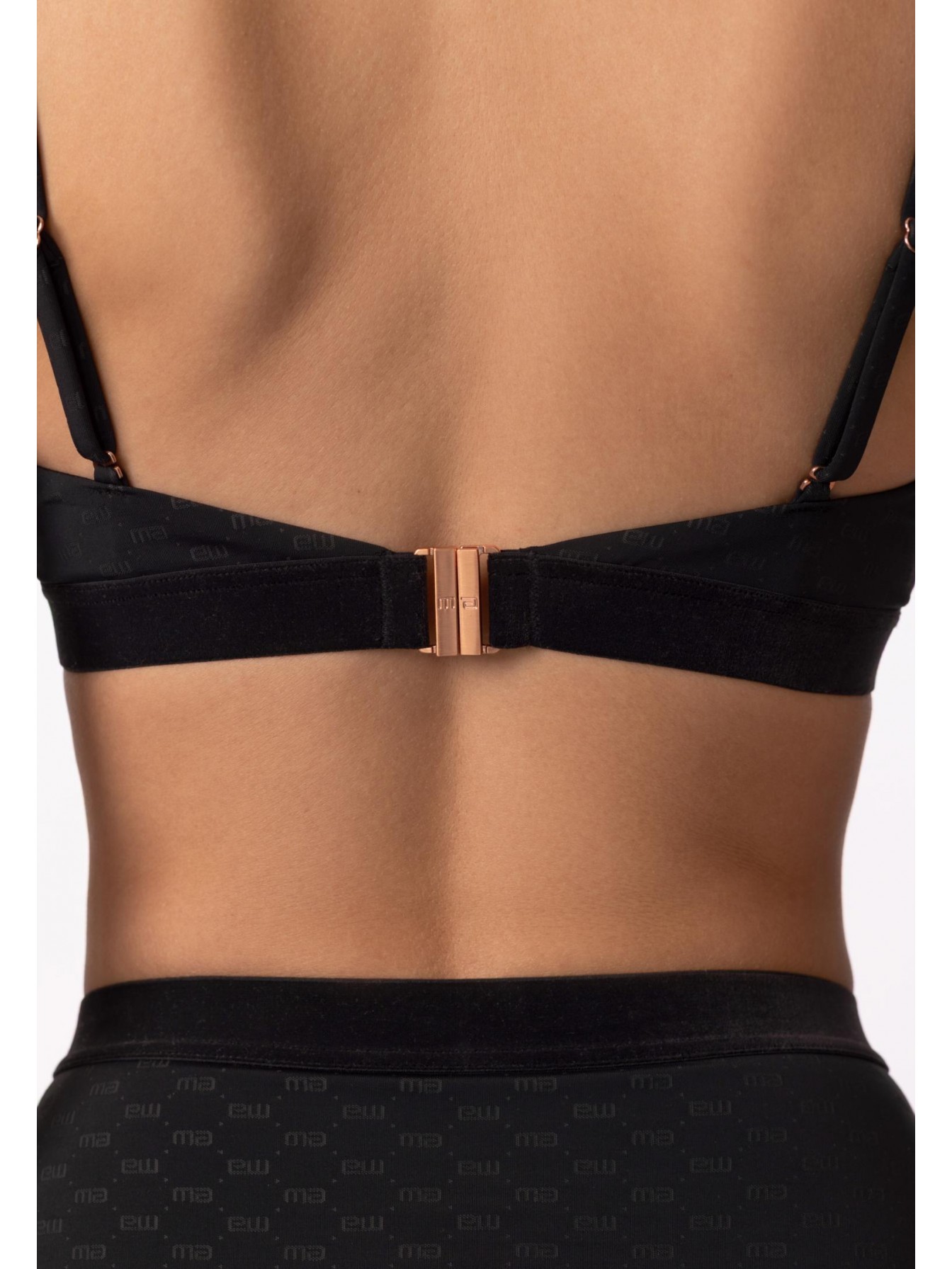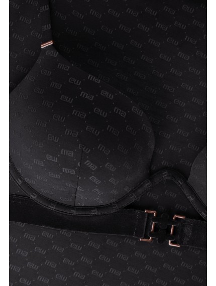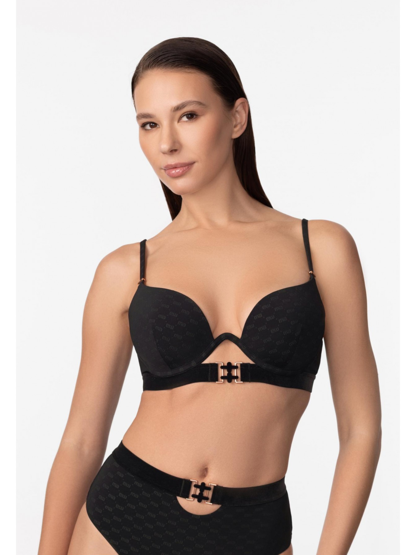 Формованная чашка со съемными корректорами «пуш-ап» на монокаркасной поддержке. Под грудью эластичный пояс из бархатистого материала с аксессуаромпряжкой. Регулируемые бретели. Застежка на спине.