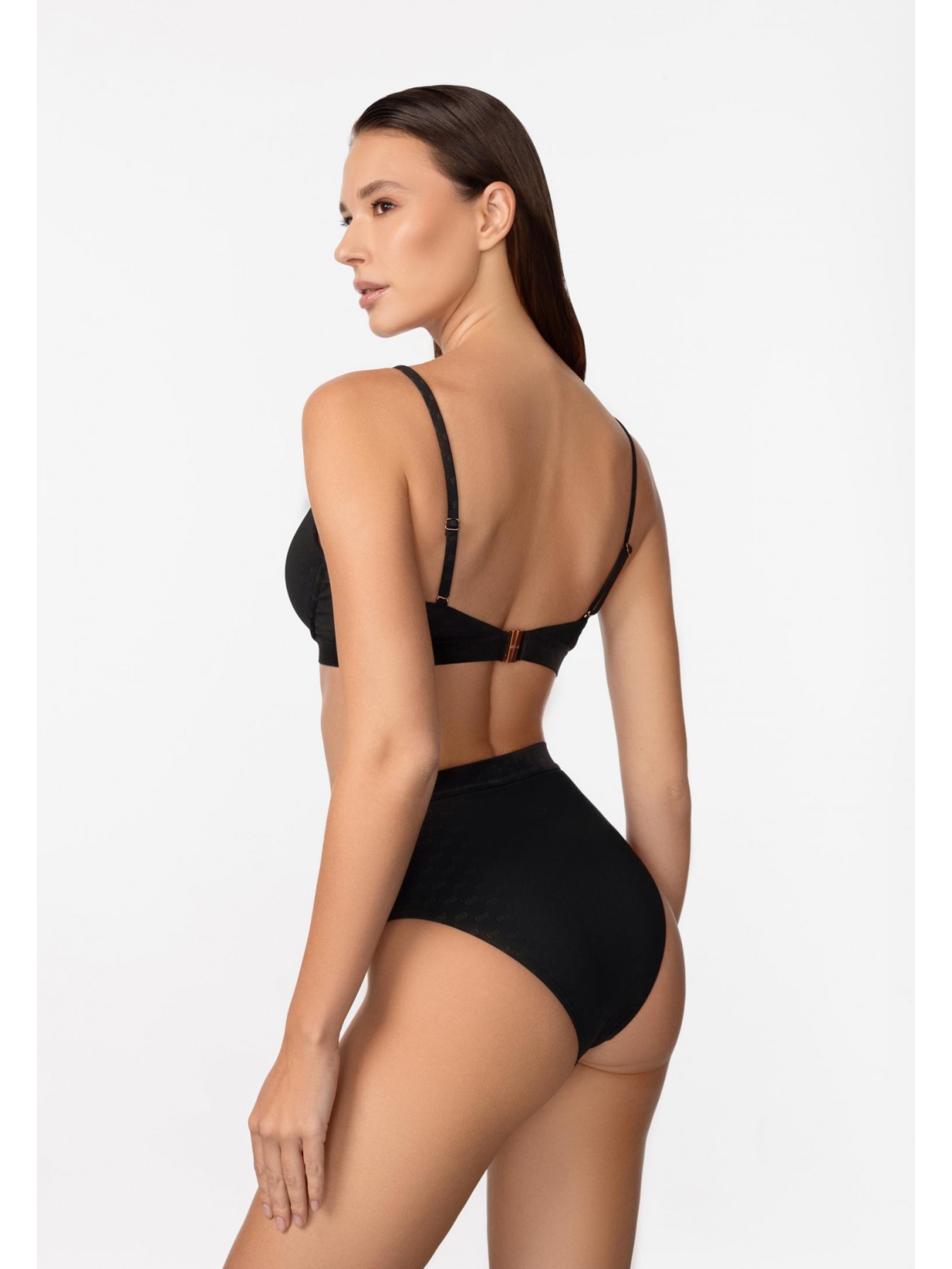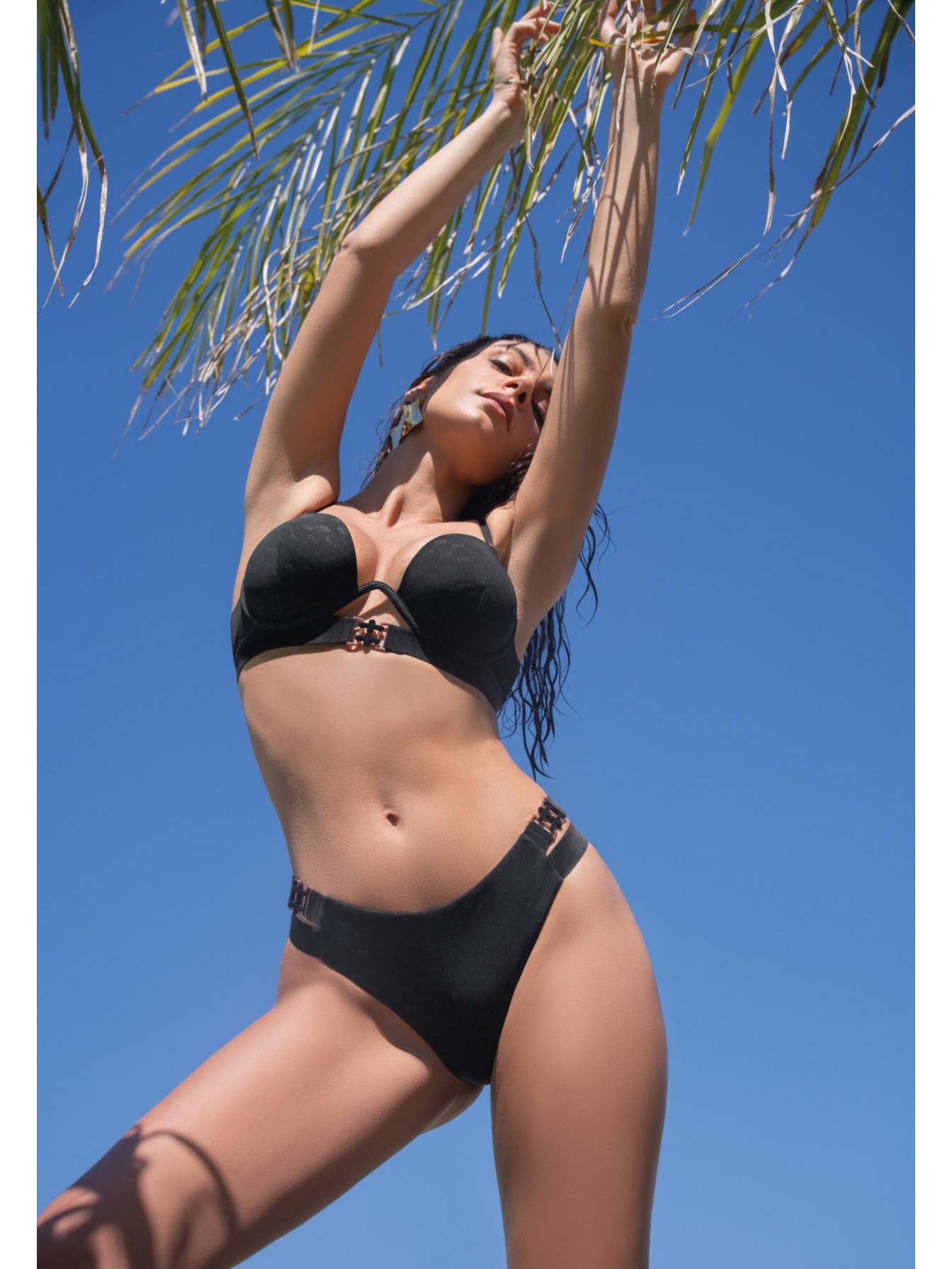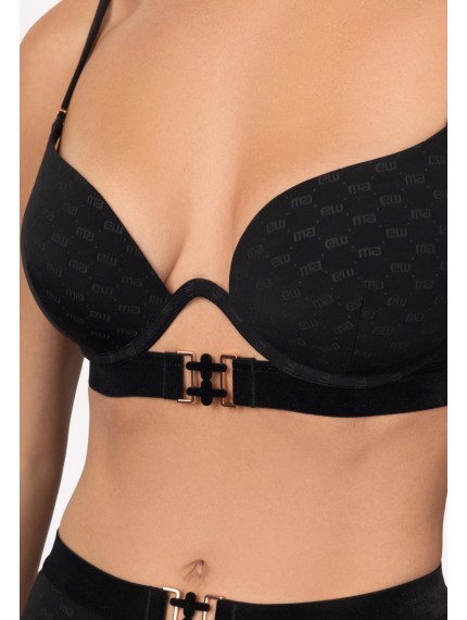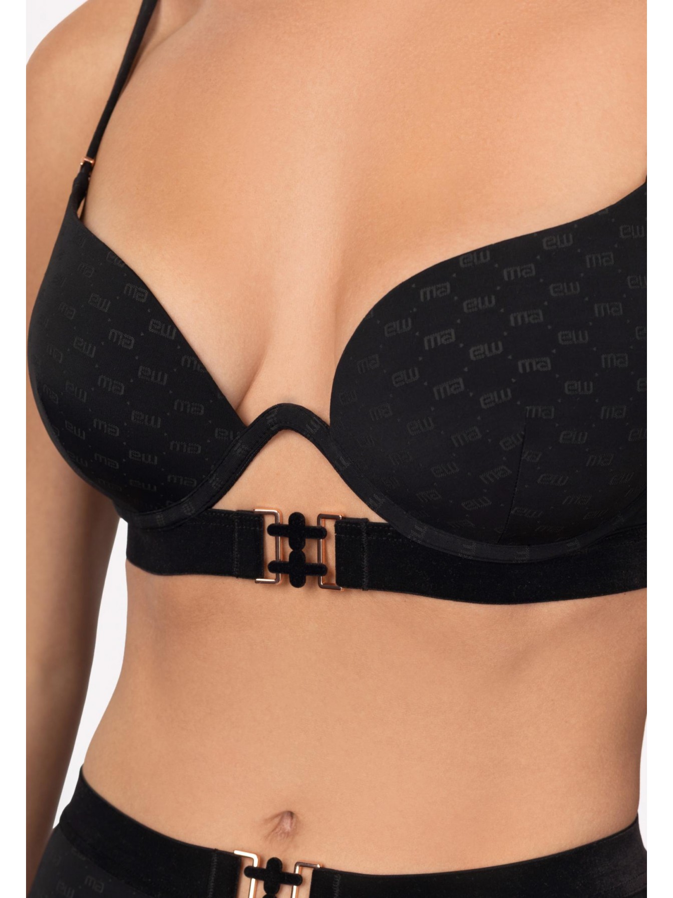 Формованная чашка со съемными корректорами «пуш-ап» на монокаркасной поддержке. Под грудью эластичный пояс из бархатистого материала с аксессуаромпряжкой. Регулируемые бретели. Застежка на спине.