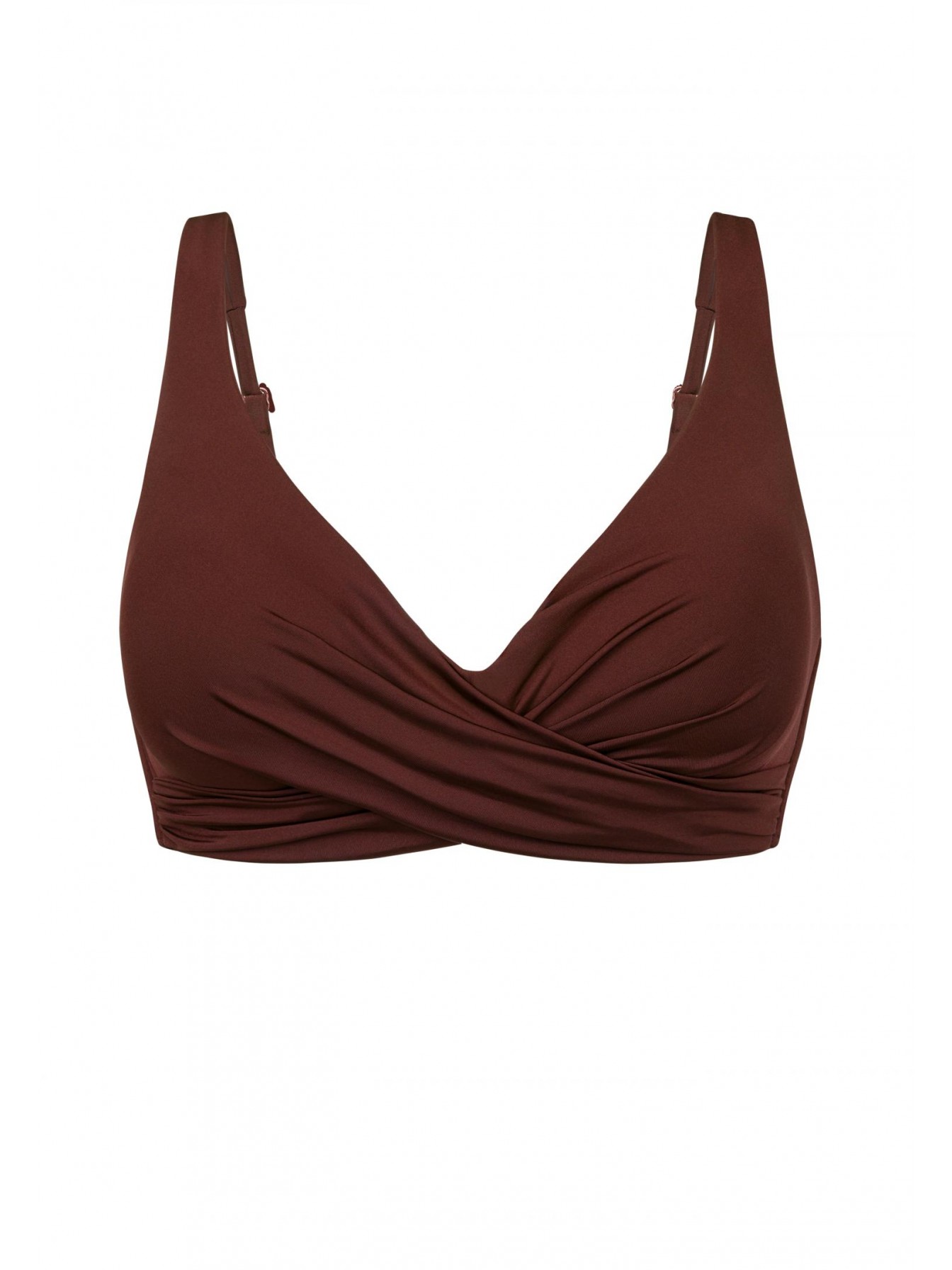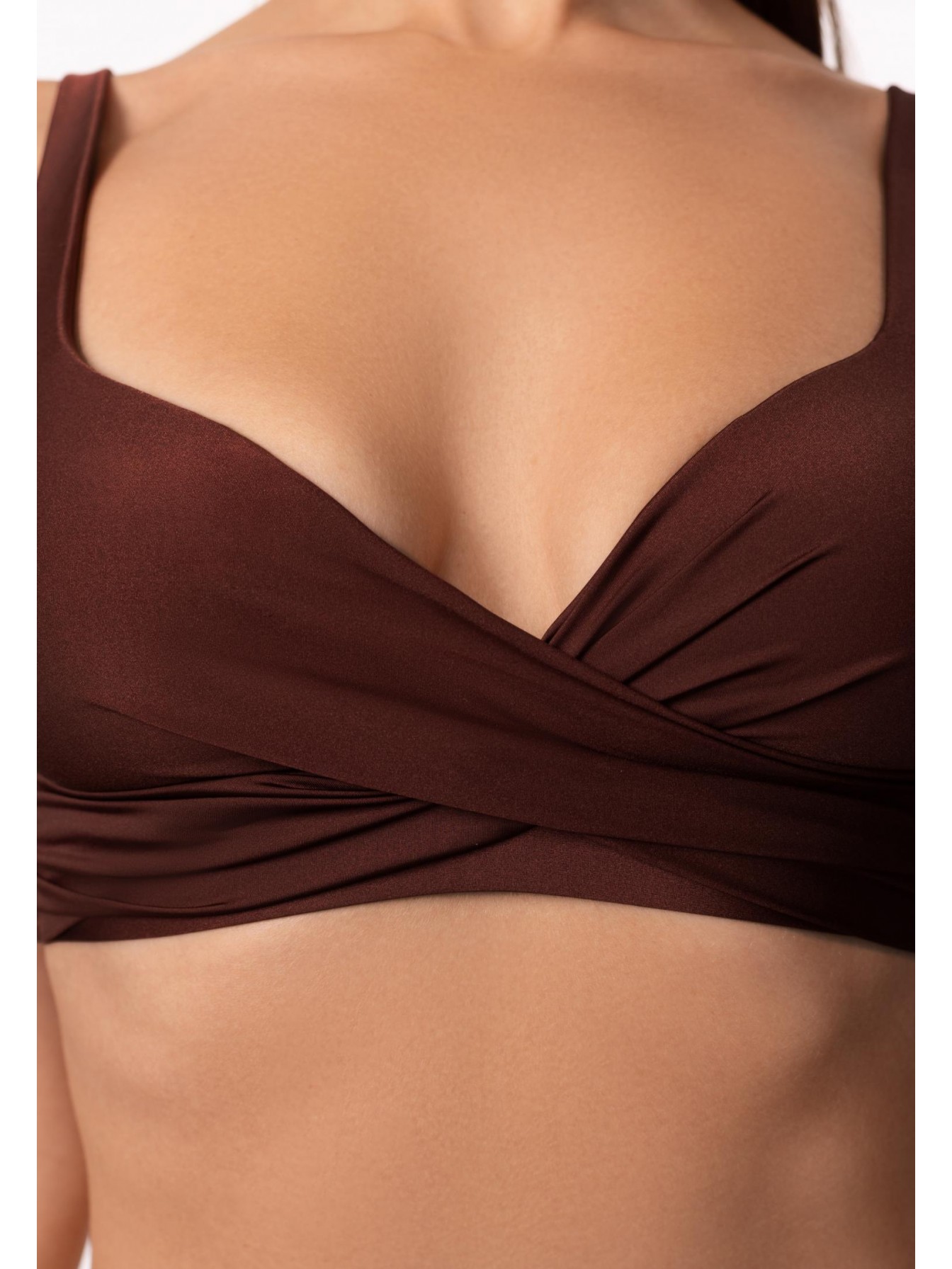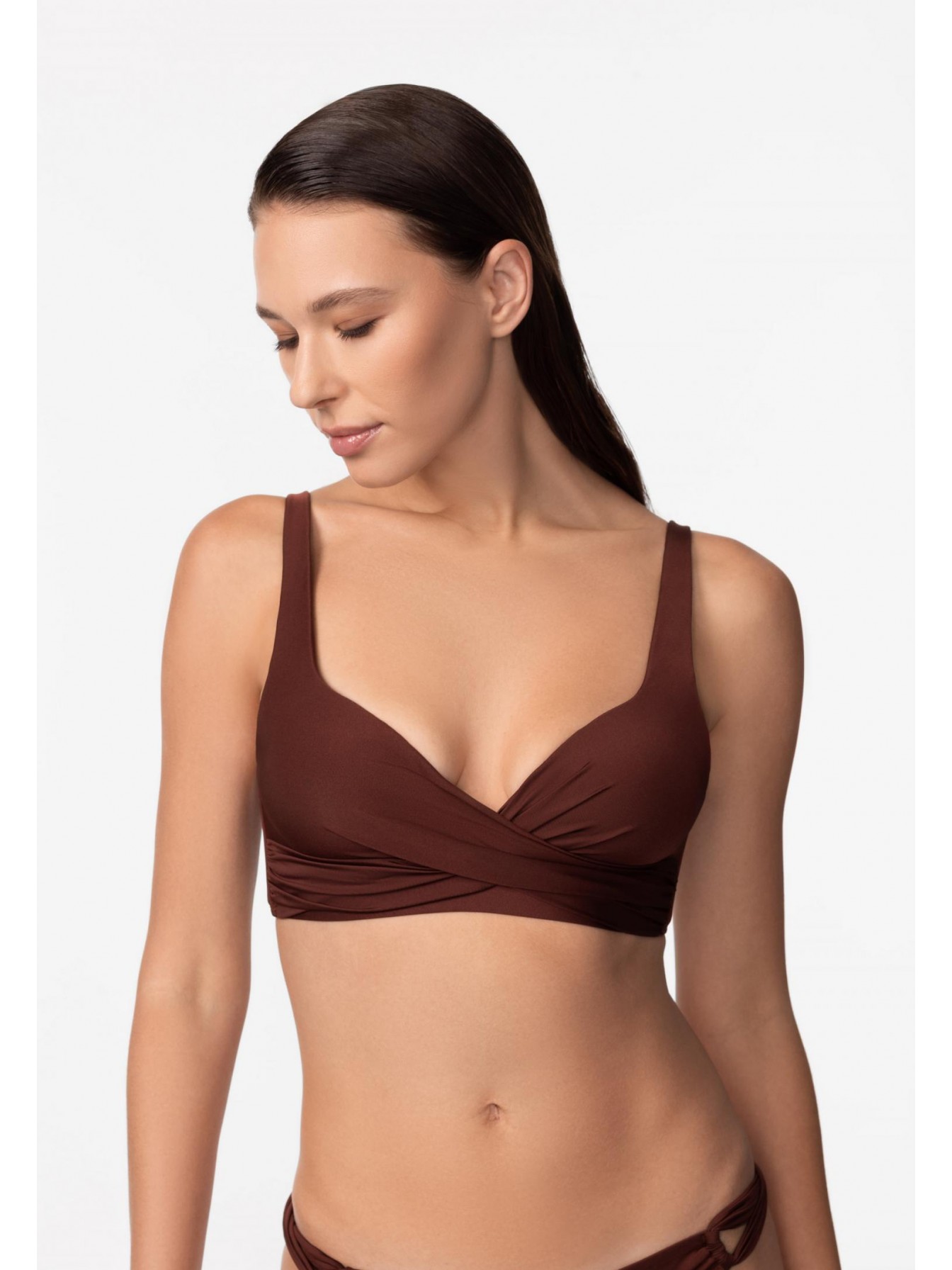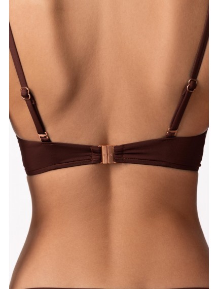 Бескаркасная формованная треугольная чашка. Спереди перекрестная драпировка. На спине застежка. Регулируемые бретели фиксируются на спине.