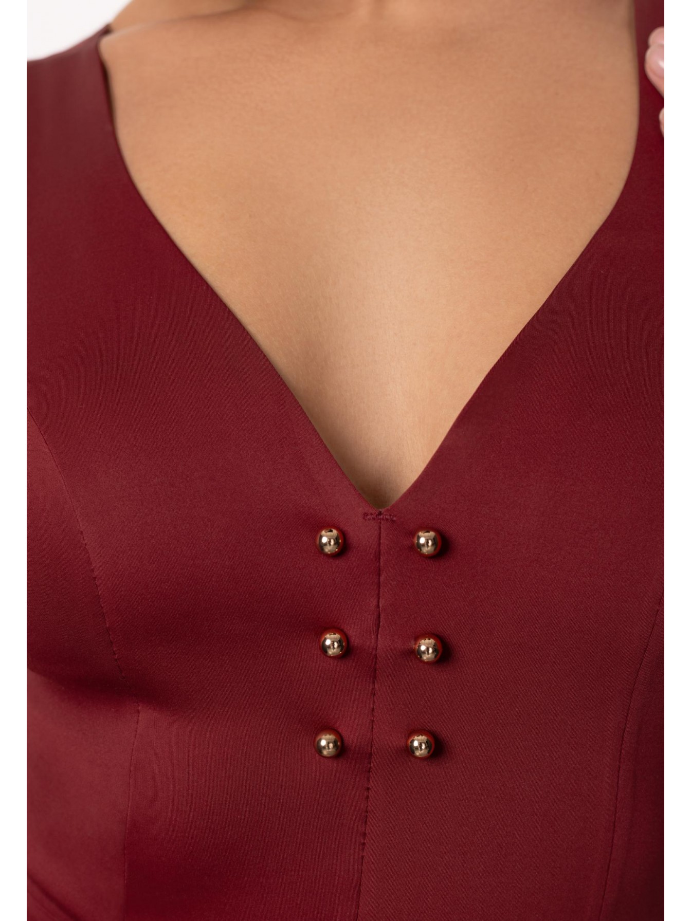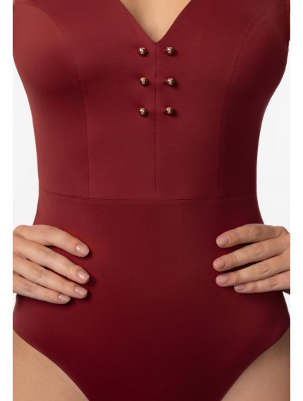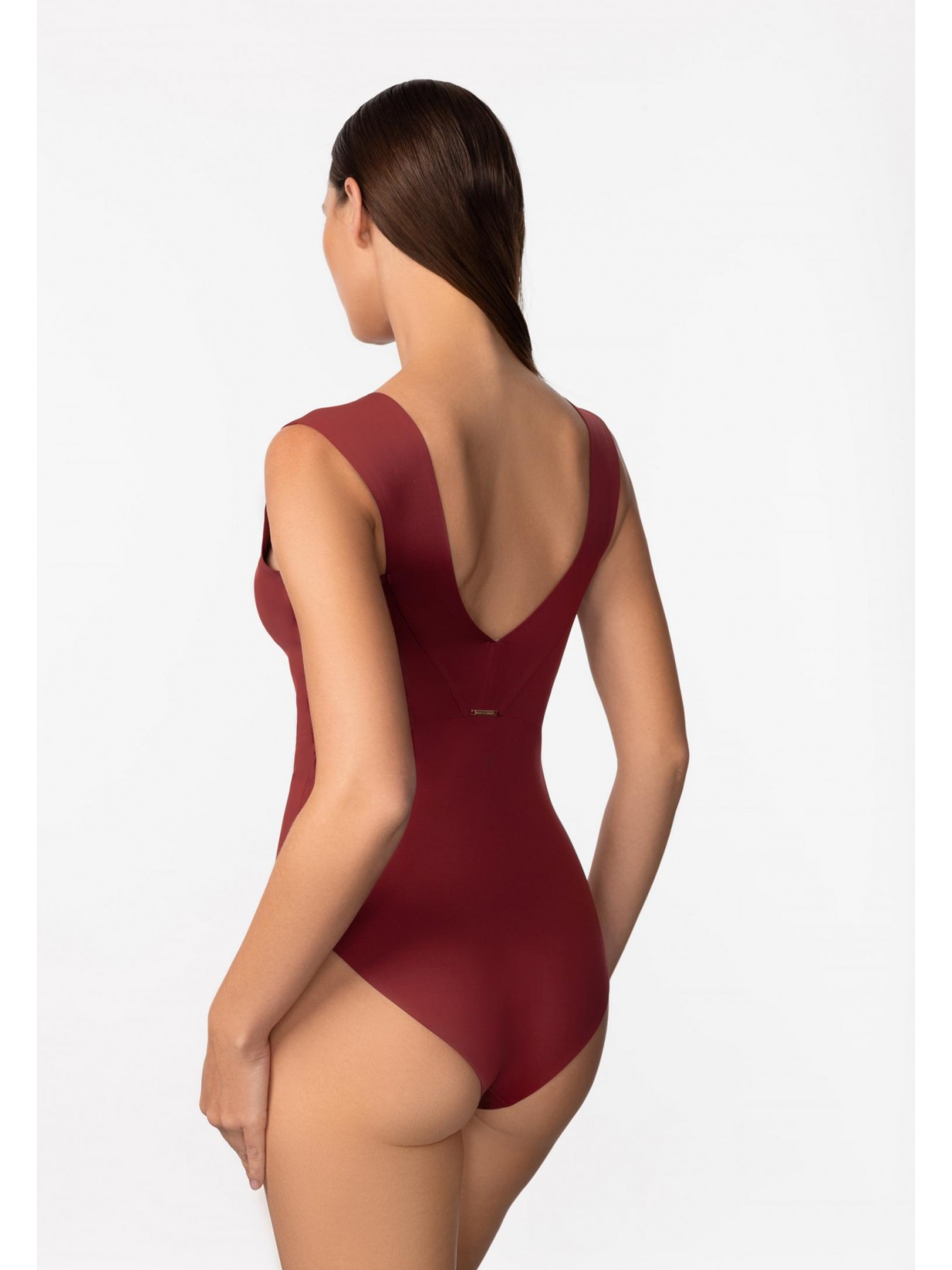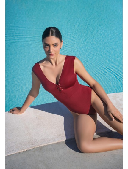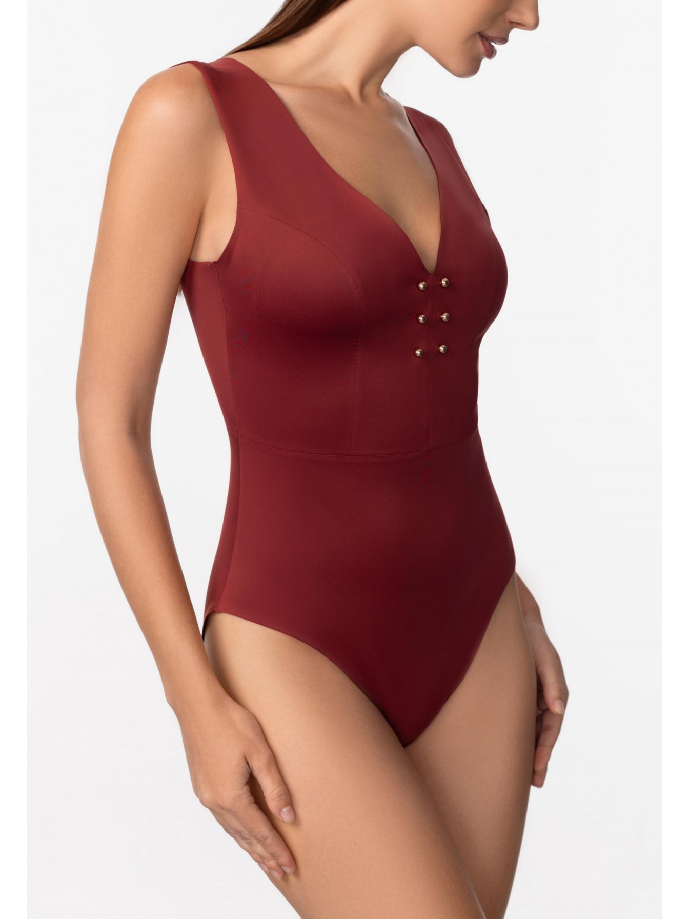 Купальник с тонкими вшитыми корректорами. V-образный вырез декольте спереди и сзади. Бесшовная (Sewfree) обработка края. Спереди металлические аксессуары.