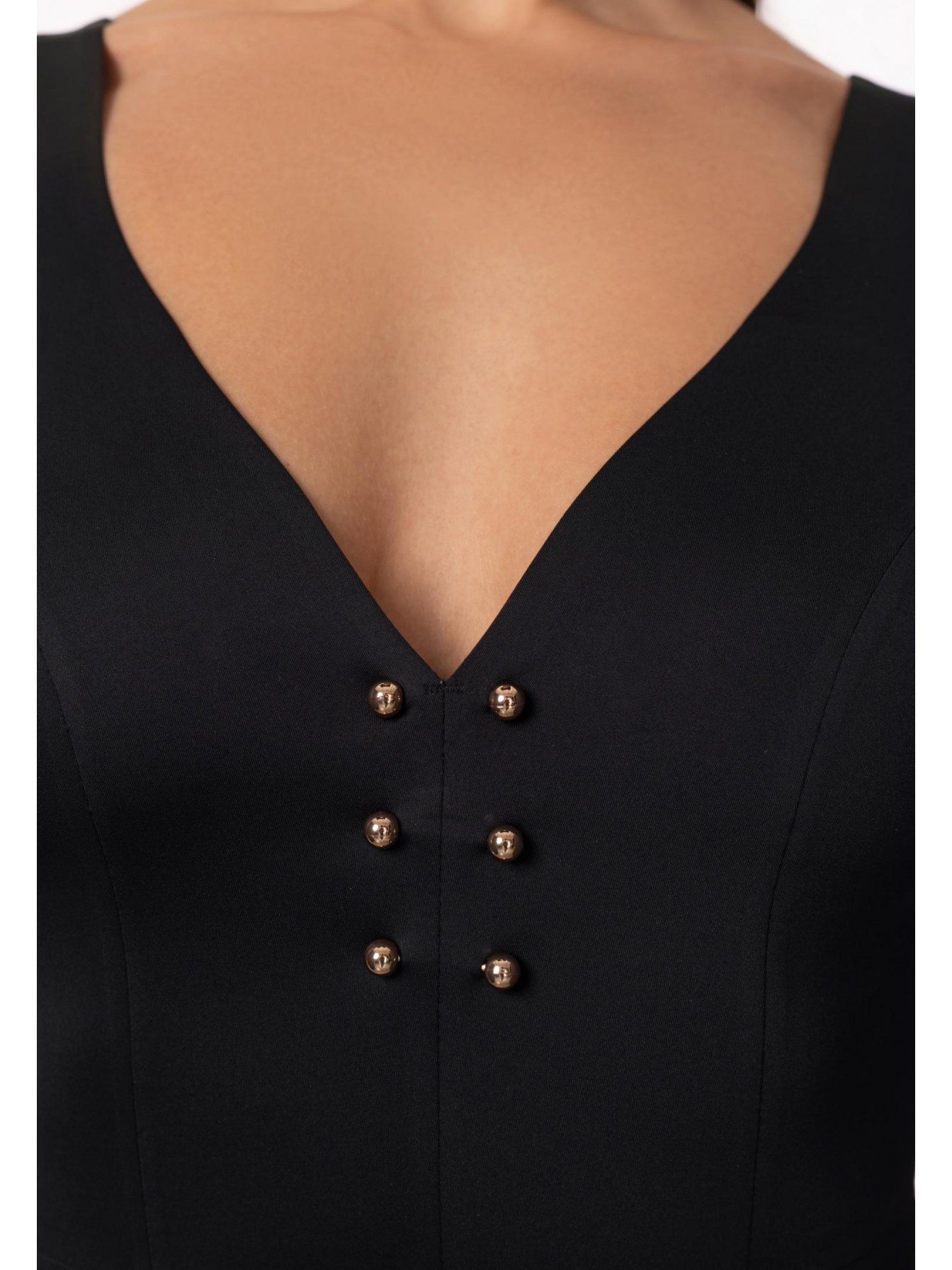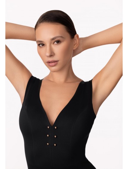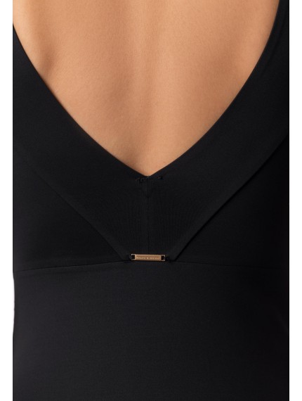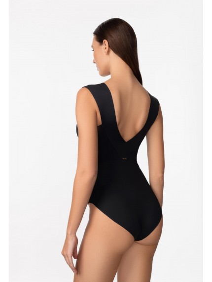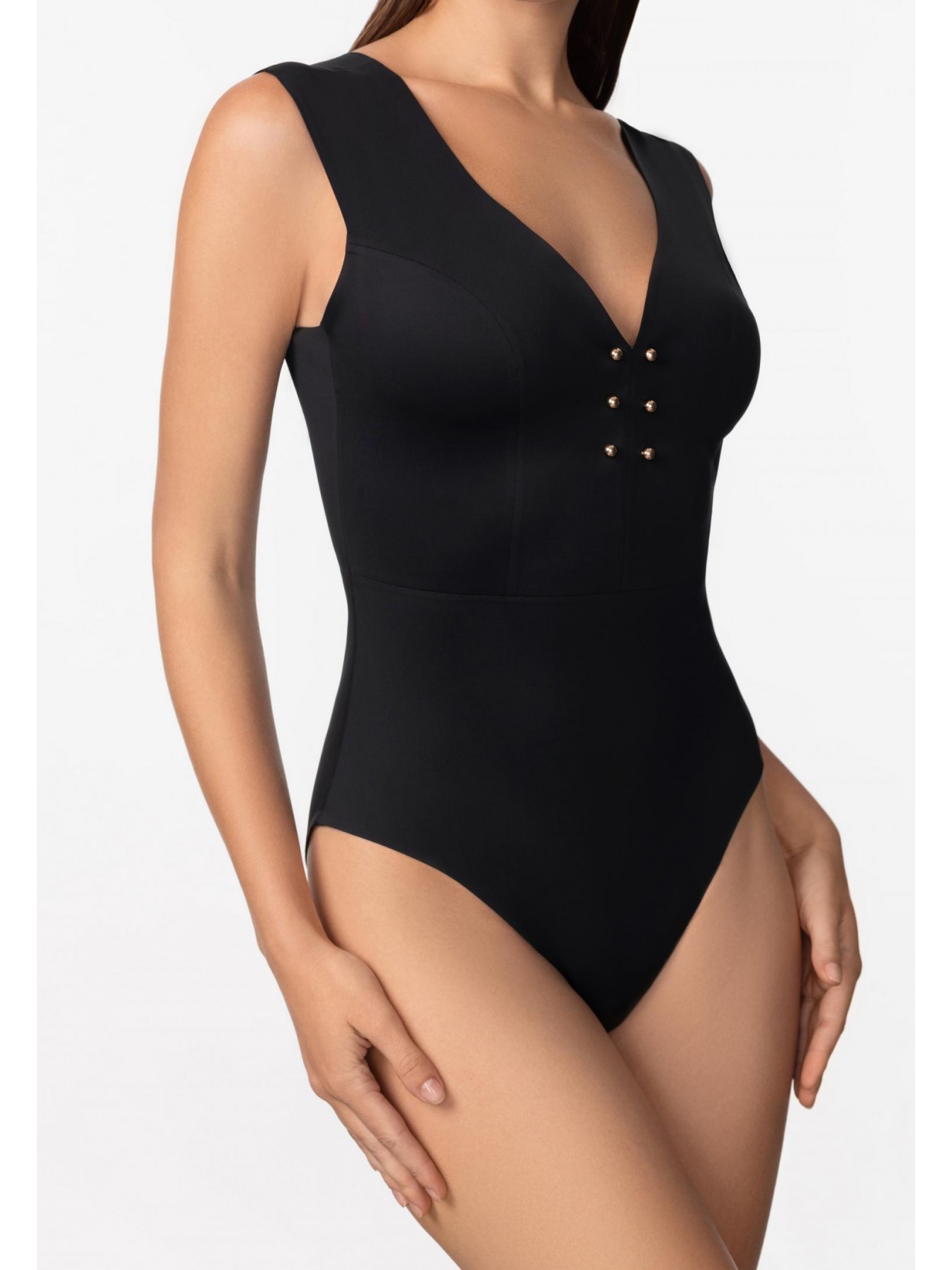 Купальник с тонкими вшитыми корректорами. V-образный вырез декольте спереди и сзади. Бесшовная (Sewfree) обработка края. Спереди металлические аксессуары.
