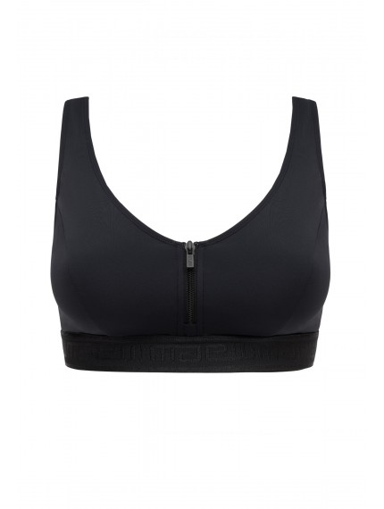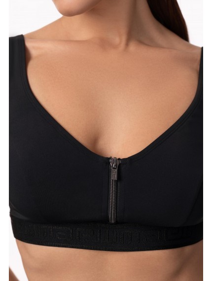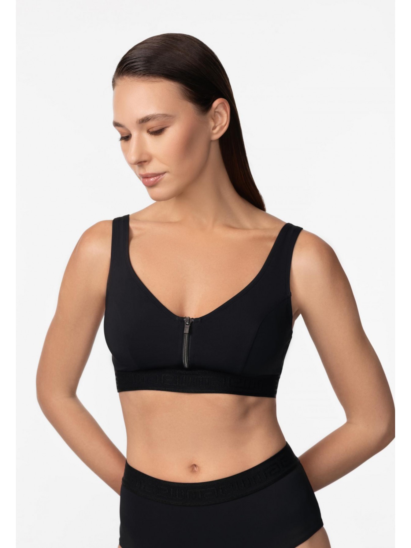 Топ с мягкой чашкой и поддерживающей резинкой под грудью. По центру передней детали молния. Широкие регулируемые бретели фиксируются на спине. На спине застежка.