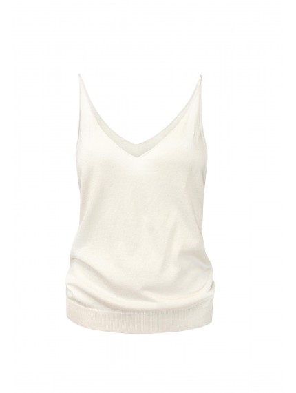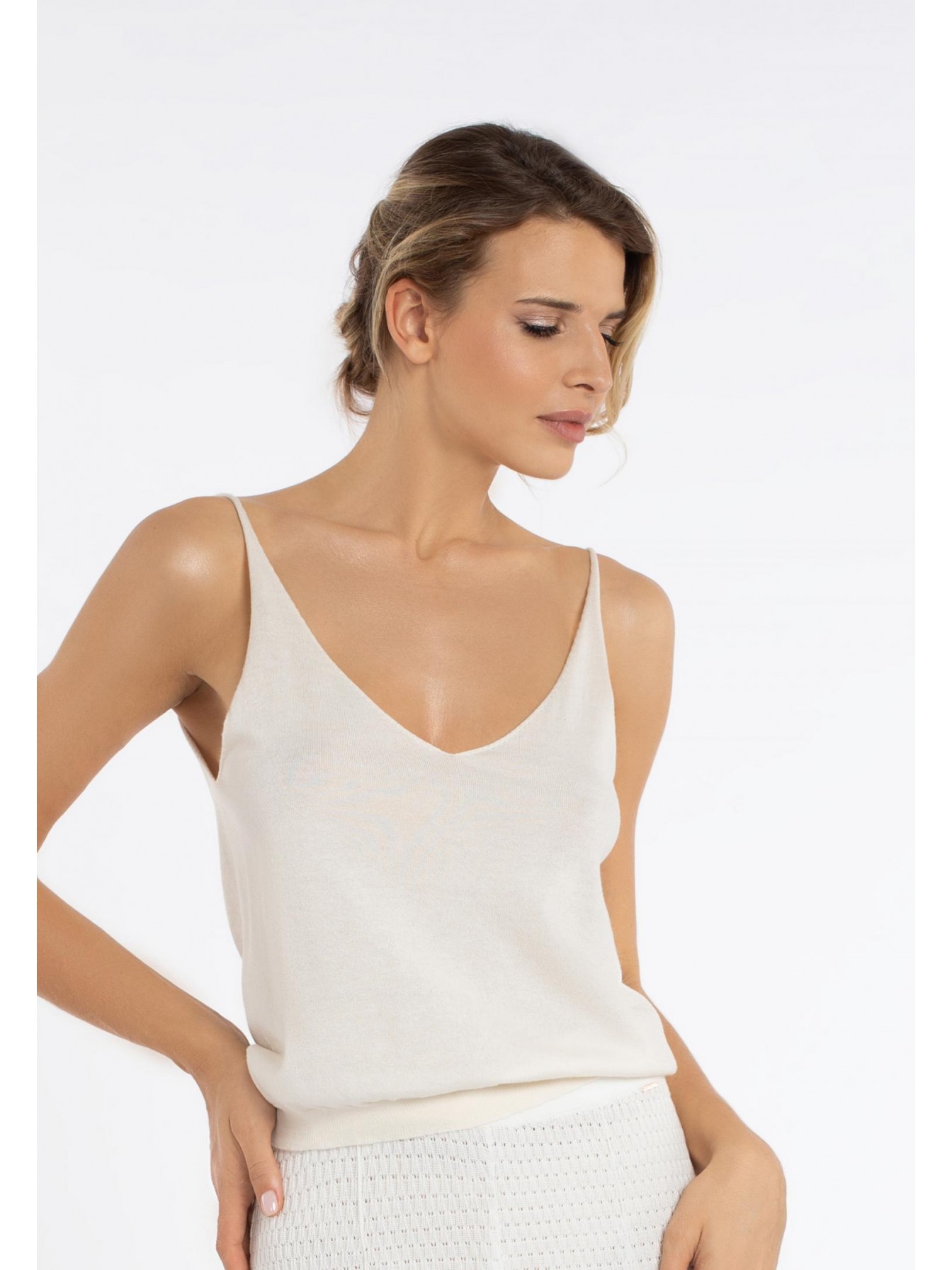 Легкий топ полуприлегающего силуэта на тонких бретелях. V-образный вырез. Эластичная вязаная резинка по нижнему краю. Смесовый материал из мягкого шелка и тонкого кашемира — идеальный вариант для создания роскошного летнего образа.