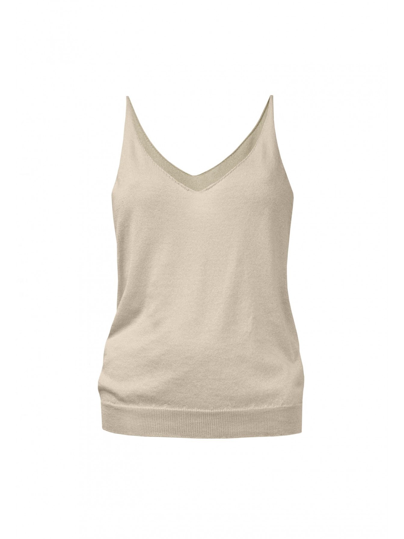 Легкий топ полуприлегающего силуэта на тонких бретелях. V-образный вырез. Эластичная вязаная резинка по нижнему краю. Смесовый материал из мягкого шелка и тонкого кашемира — идеальный вариант для создания роскошного летнего образа.