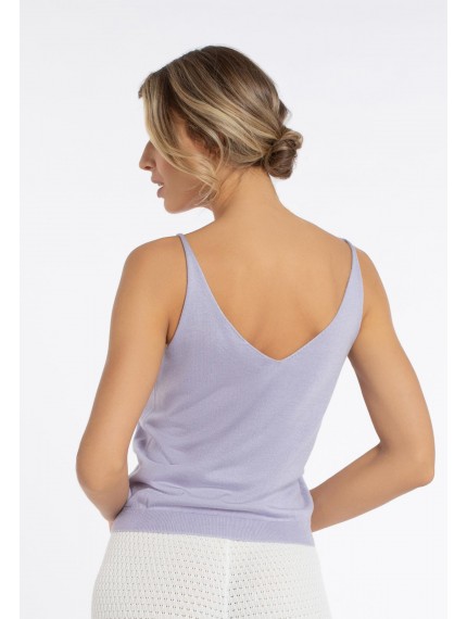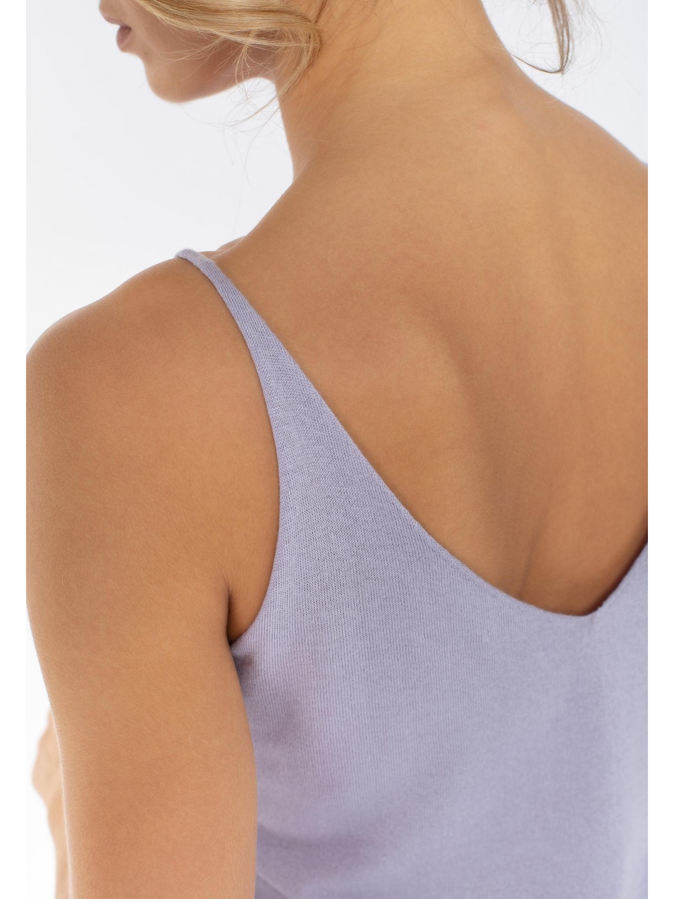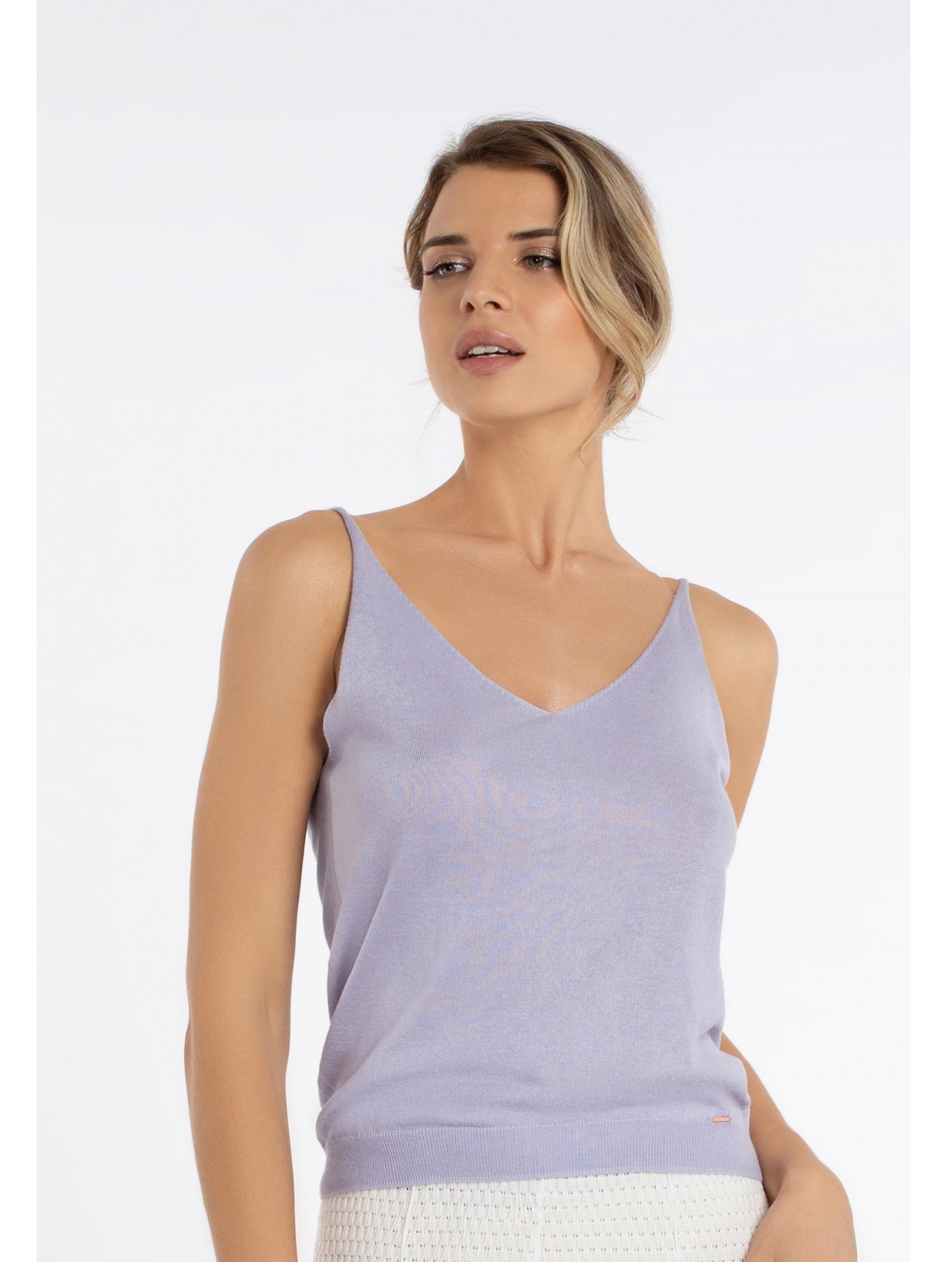 Легкий топ полуприлегающего силуэта на тонких бретелях. V-образный вырез. Эластичная вязанная резинка по нижнему краю. Идеальный вариант для создания летнего образа.