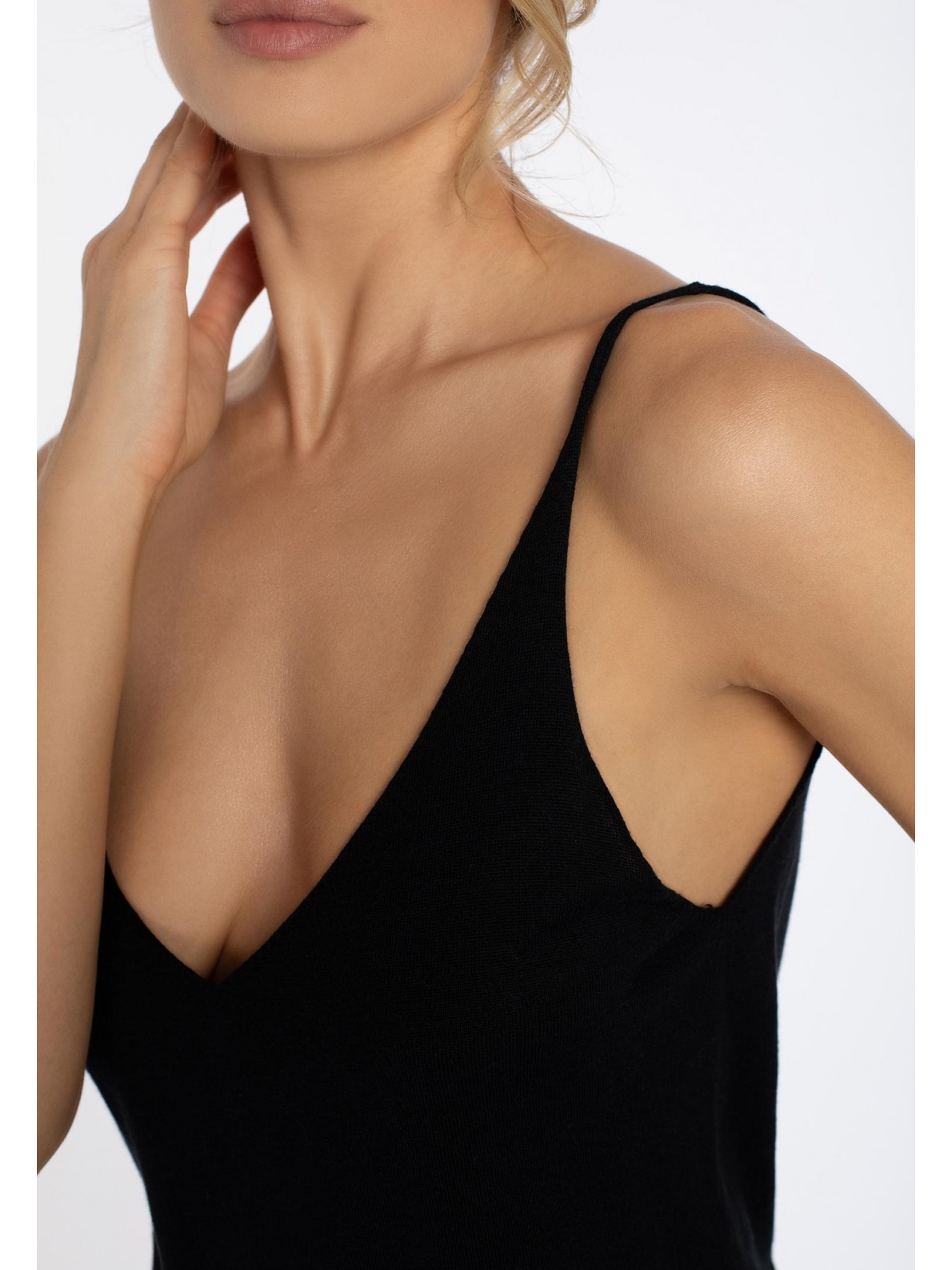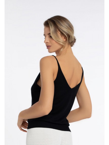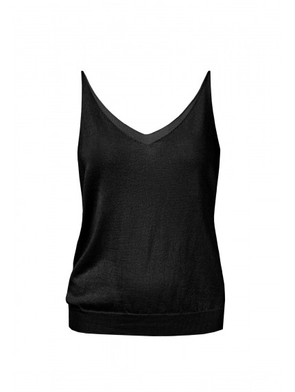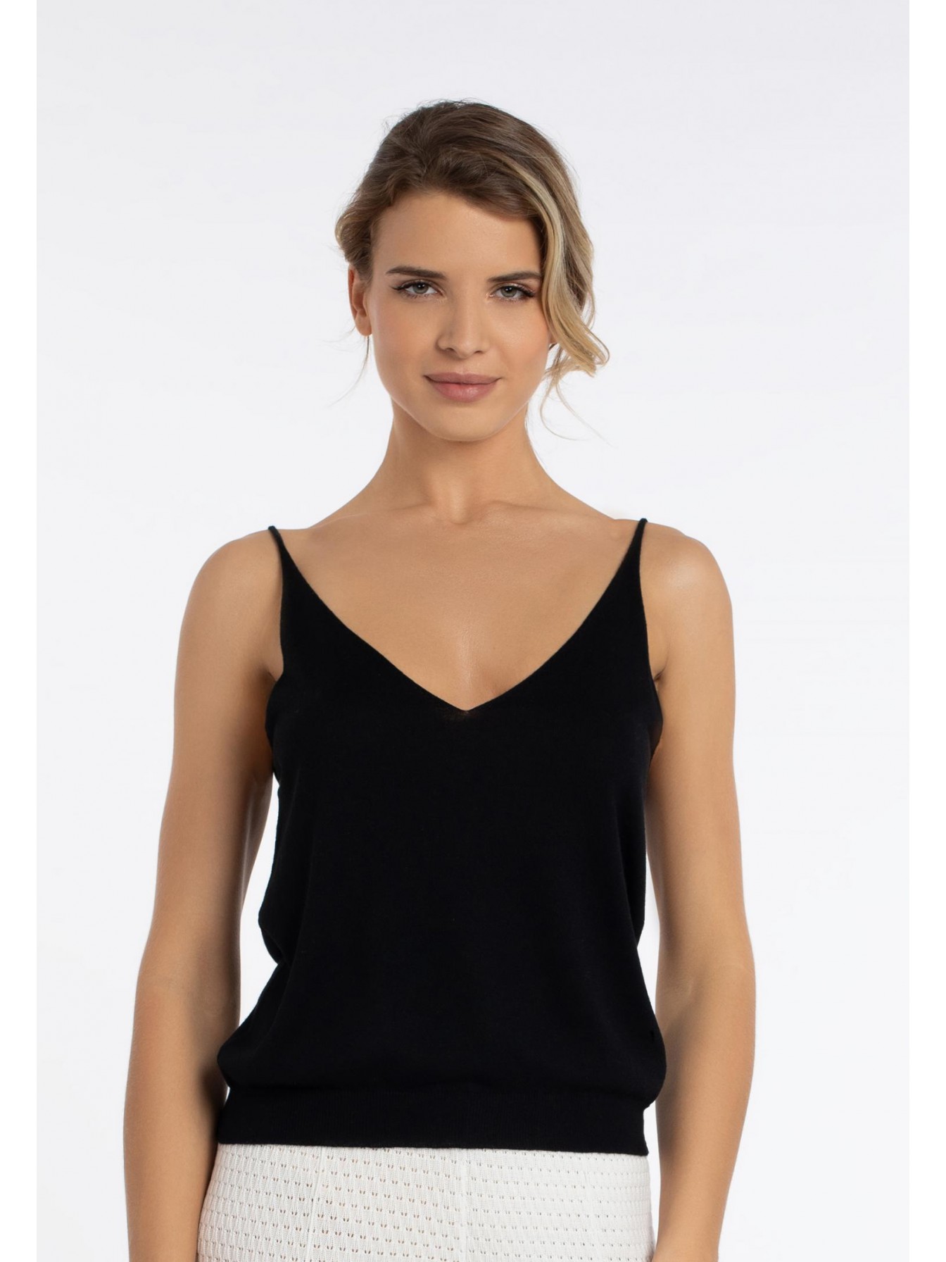 Легкий топ полуприлегающего силуэта на тонких бретелях. V-образный вырез. Эластичная вязаная резинка по нижнему краю. Смесовый материал из мягкого шелка и тонкого кашемира — идеальный вариант для создания роскошного летнего образа.