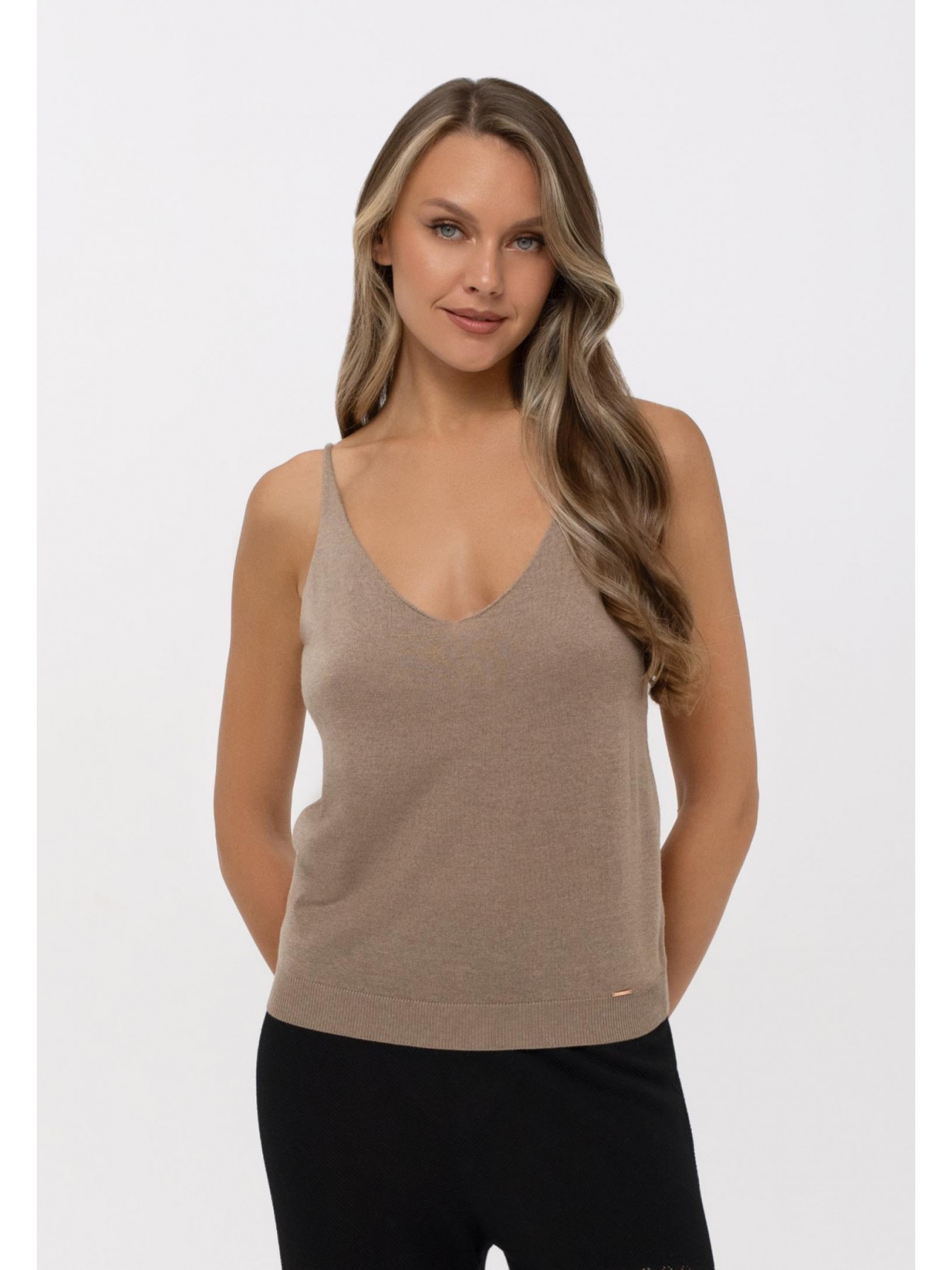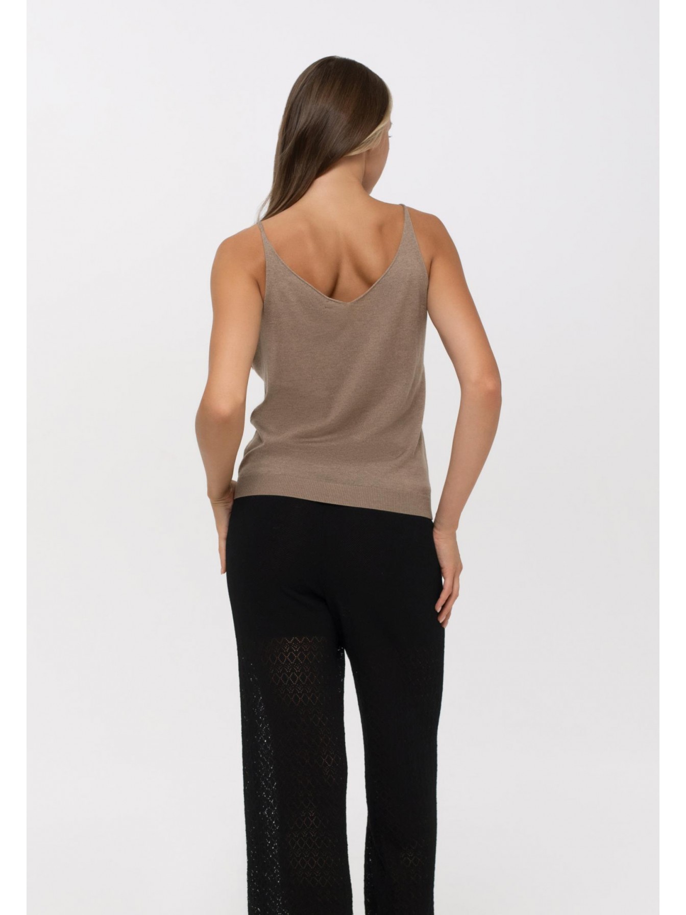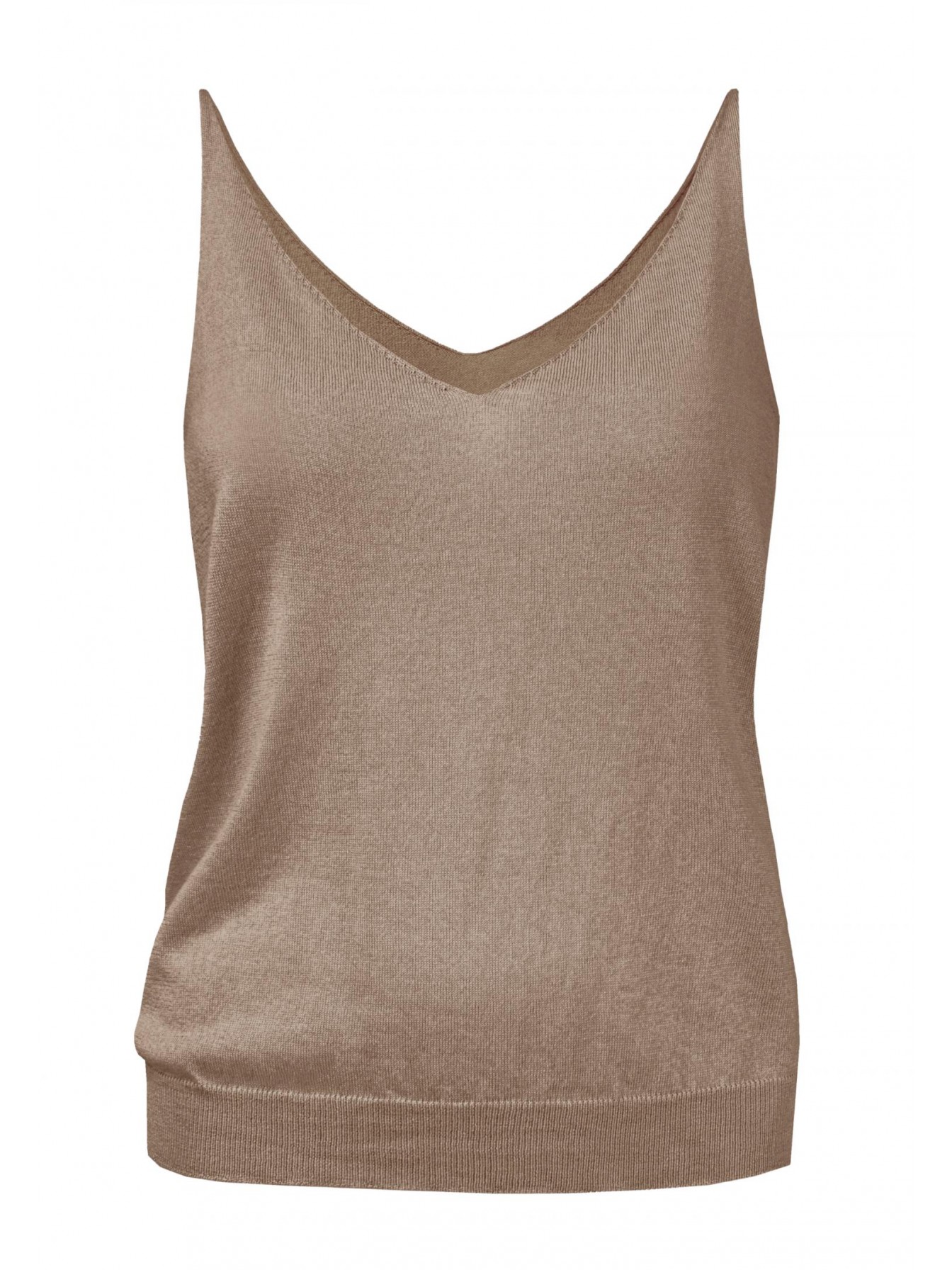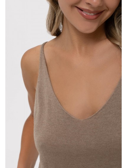 Легкий топ полуприлегающего силуэта на тонких бретелях. V-образный вырез. Эластичная вязаная резинка по нижнему краю. Смесовый материал из мягкого шелка и тонкого кашемира — идеальный вариант для создания роскошного летнего образа.