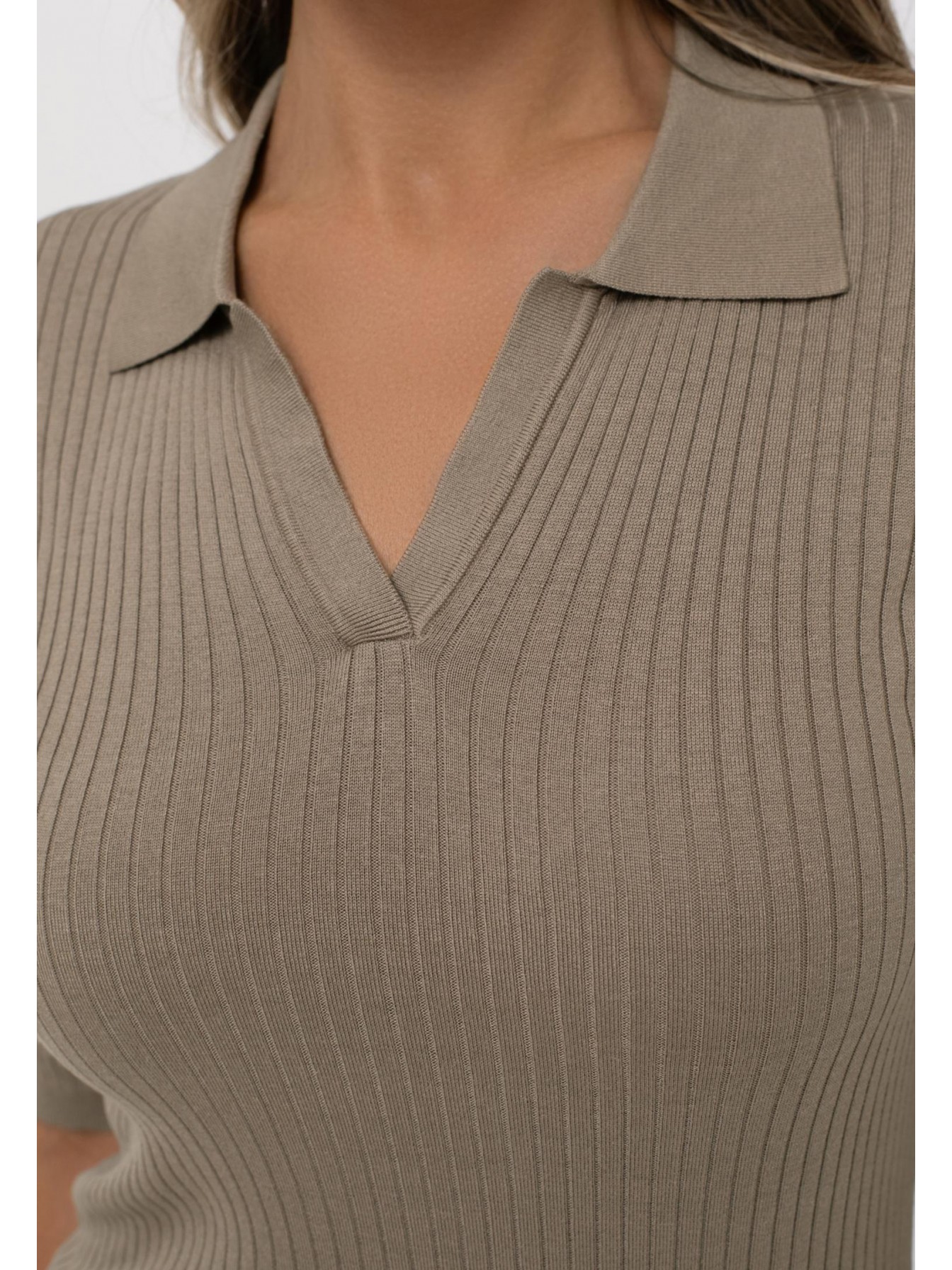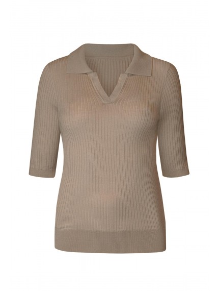 Джемпер с воротником-поло и рукавом ¾ тонко подчеркнет вашу красоту и создаст стильный образ. Мягкая текстура в широкий рубчик, полуприлегающий крой, легкий и гладкий материал из шелка и вискозы. Вырез горловины спереди, низ изделия и рукавов оформлены вязаной резинкой.