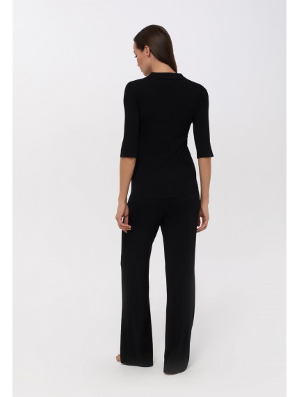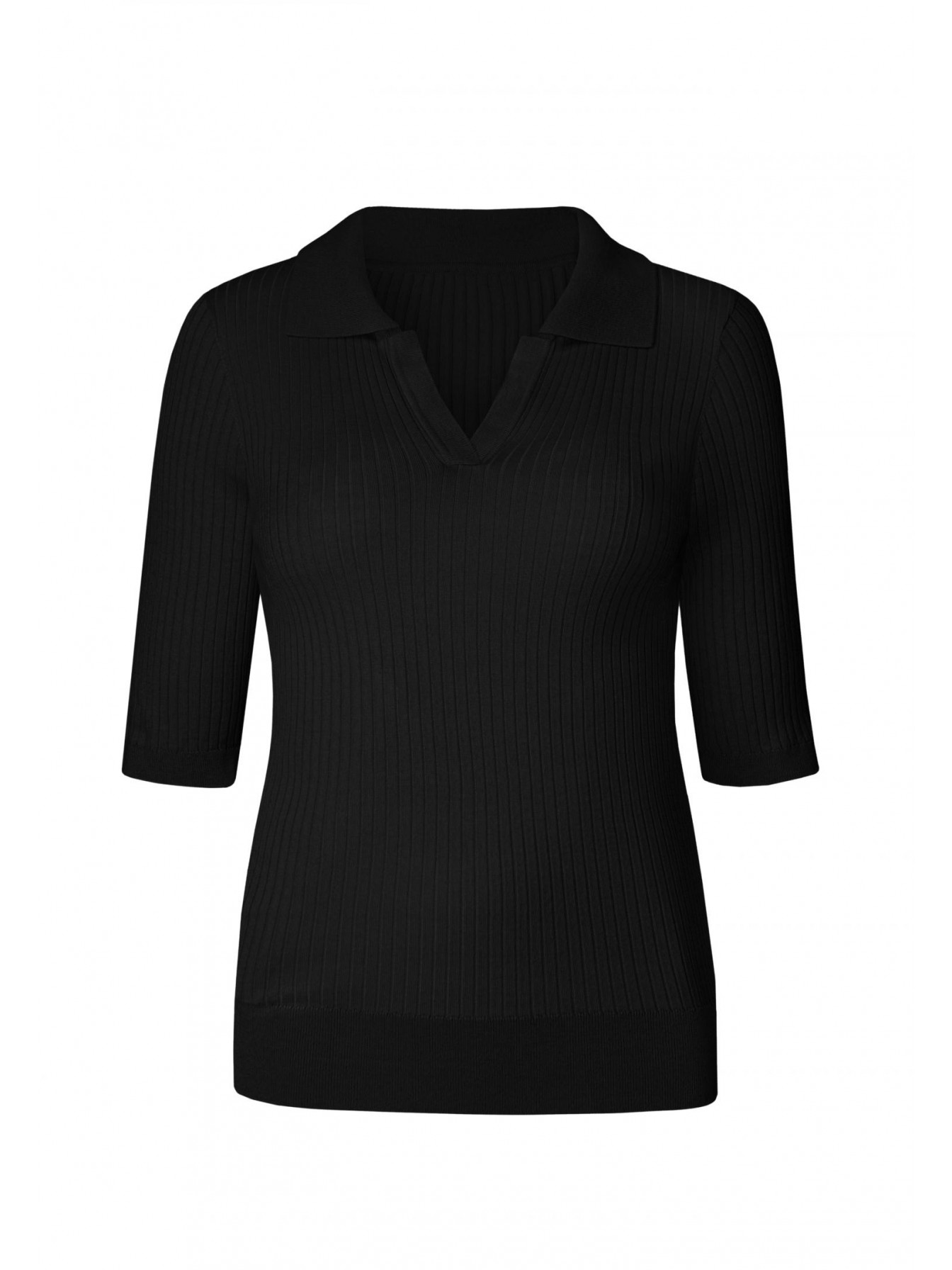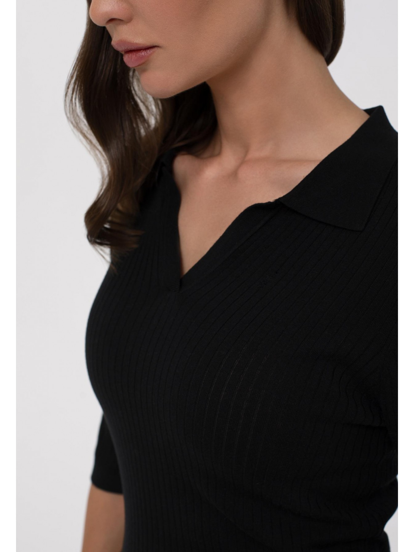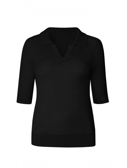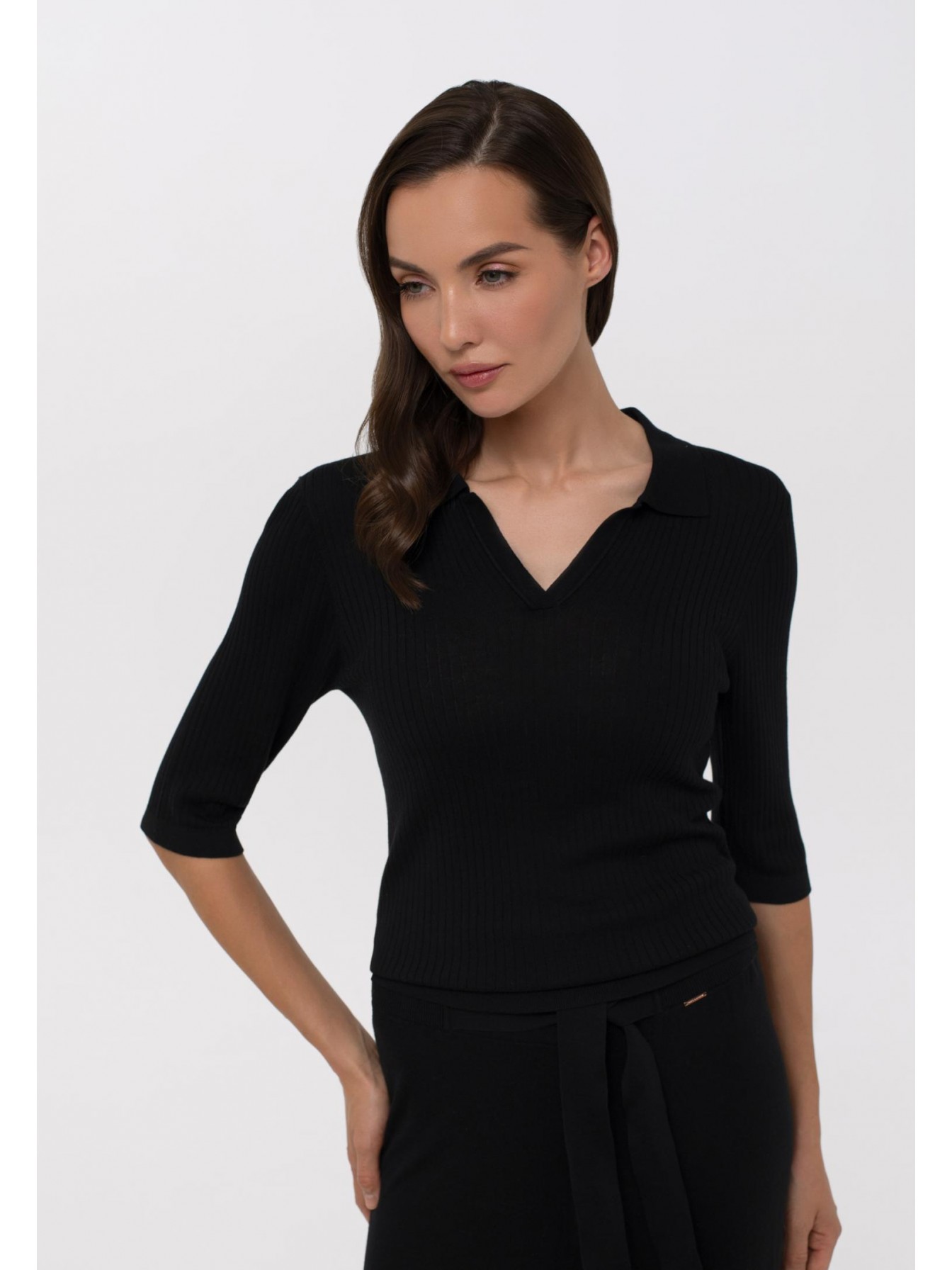 Джемпер с воротником-поло и рукавом ¾ тонко подчеркнет вашу красоту и создаст стильный образ. Мягкая текстура в широкий рубчик, полуприлегающий крой, легкий и гладкий материал из шелка и вискозы. Вырез горловины спереди, низ изделия и рукавов оформлены вязаной резинкой.