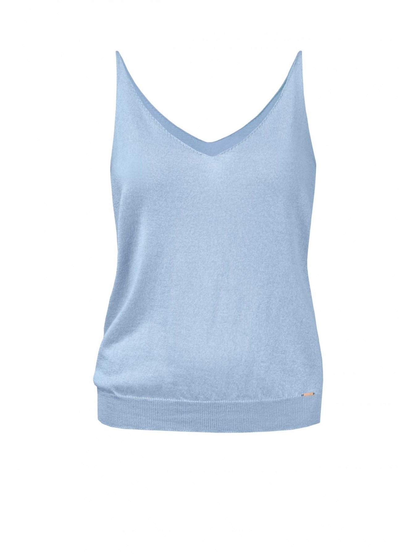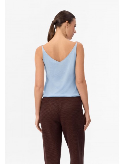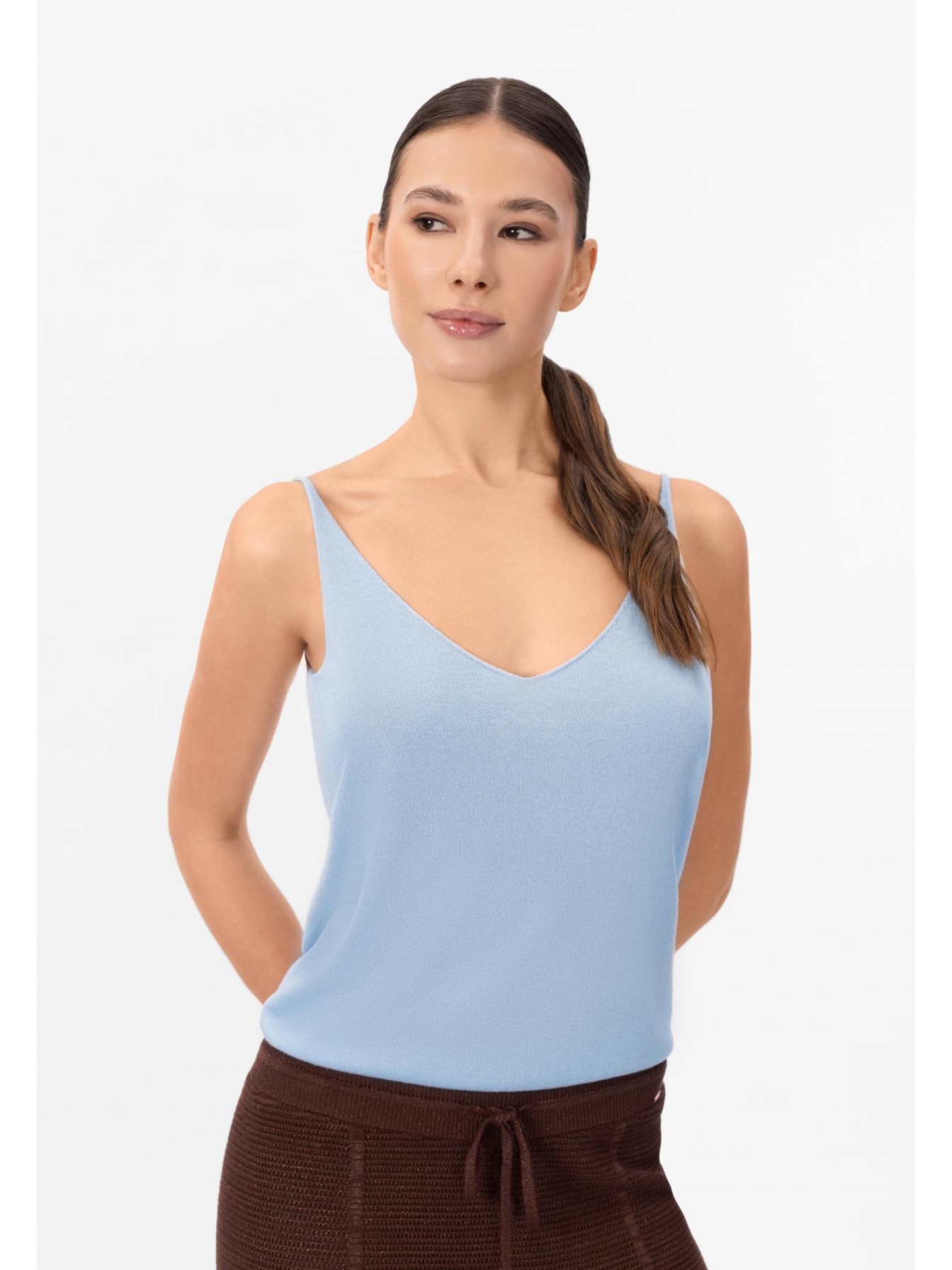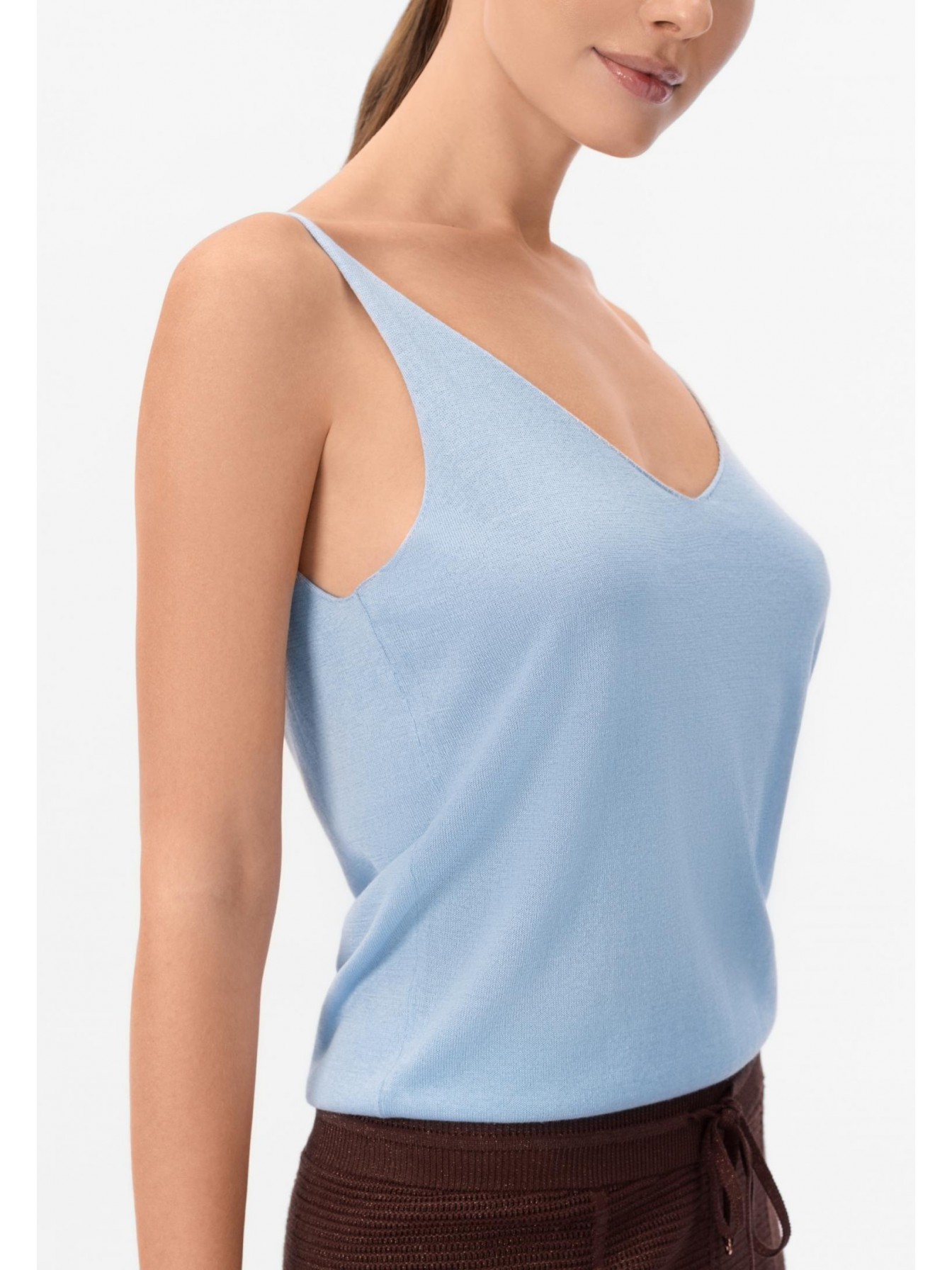 Легкий топ полуприлегающего силуэта на тонких бретелях. V-образный вырез. Эластичная вязаная резинка по нижнему краю. Смесовый материал из мягкого шелка и тонкого кашемира — идеальный вариант для создания роскошного летнего образа.